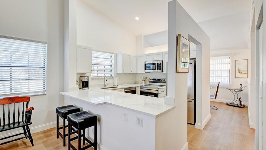Welcome to your dream home in the highly sought-after community of Independence Bay! This beautifully upgraded second floor corner unit offers 2 spacious bedrooms, 2 bathrooms and soaring vaulted ceilings that enhance the open and airy feel. The newly upgraded high-end kitchen is a chefs delight, featuring brand new stainless steel appliances, white shaker cabinetry and an elegant quartz countertop! This unit features brand new tile flooring, is freshly painted, popcorn ceilings removed and stunning lake views/ sunsets from your privately screened patio, living room and master bedroom. Amenities included: pickleball, tennis, 5 heated pools, a game room, updated fitness center and is just minutes from the beach, shopping, restaurants and more!