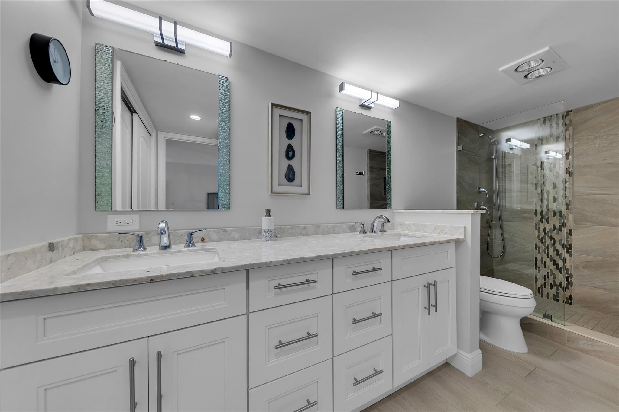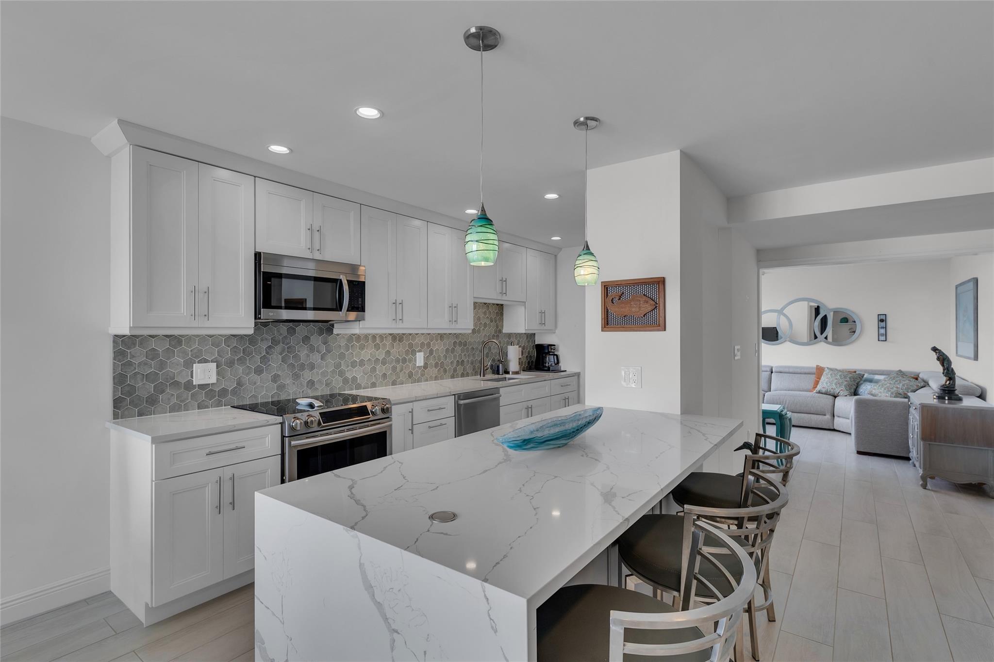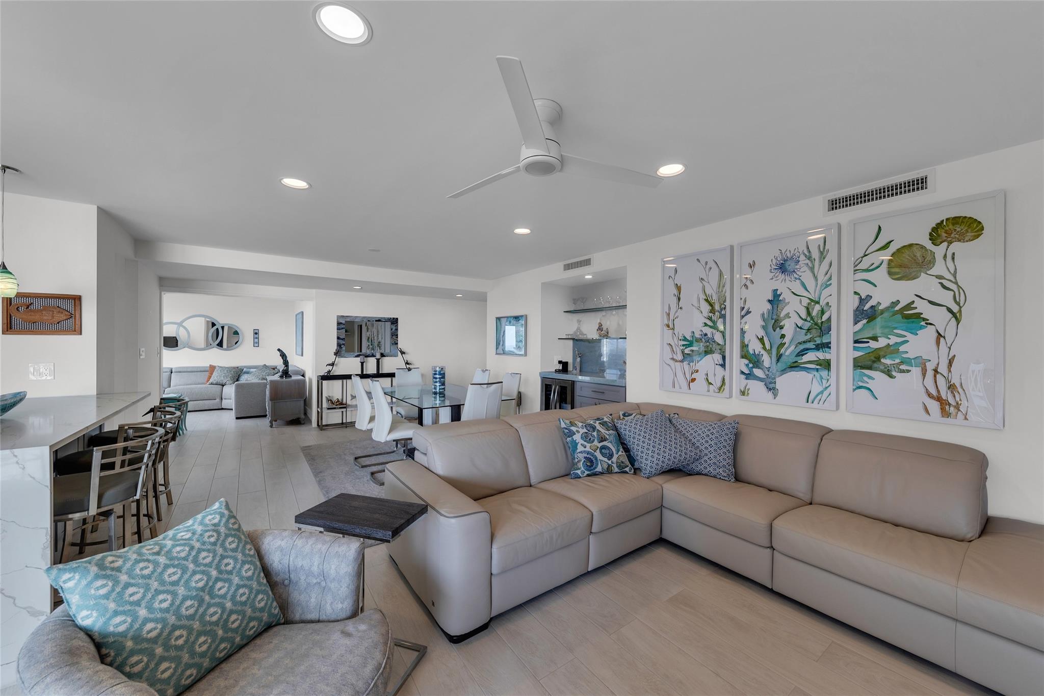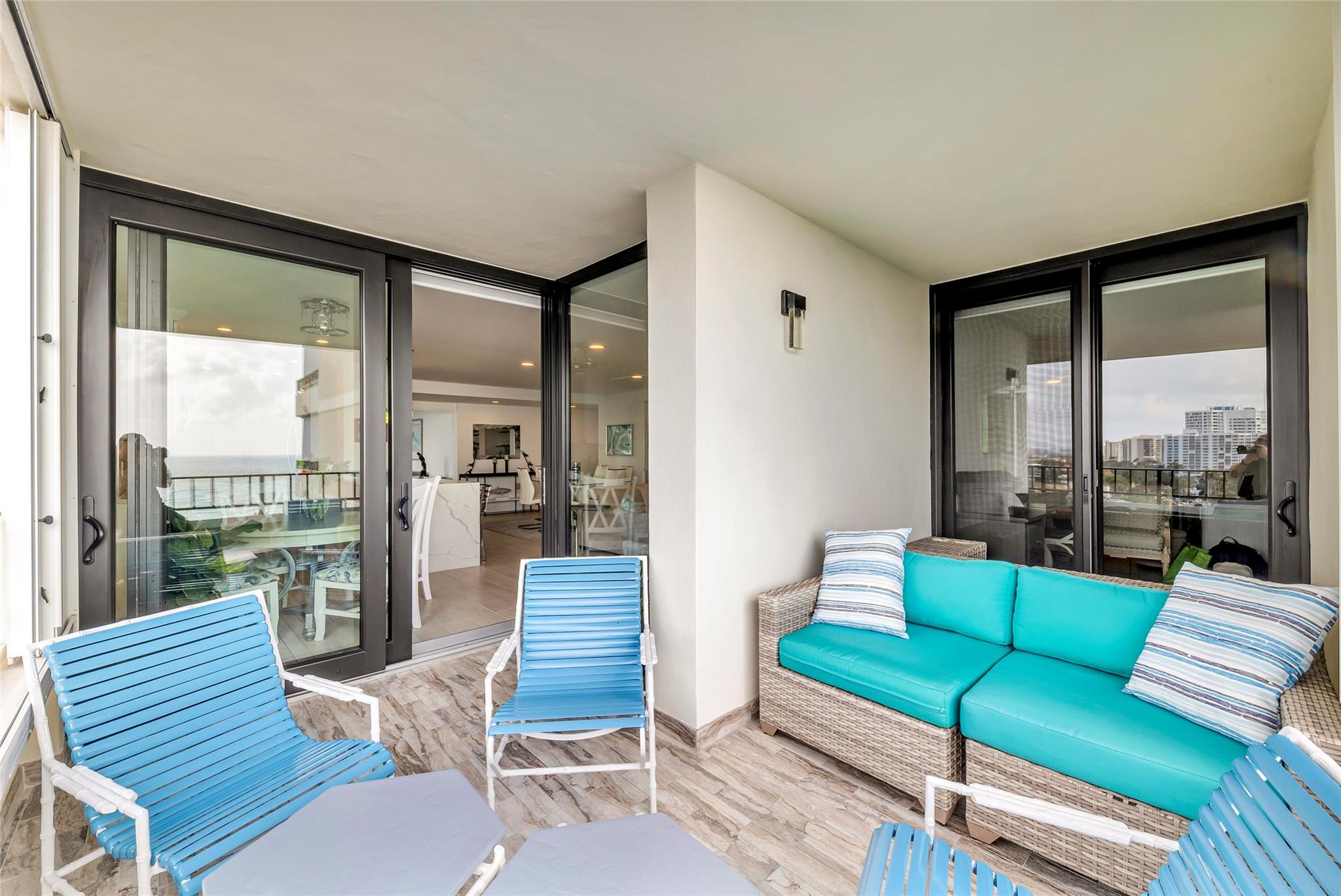Once you see this amazing totally renovated condo with a southeast exposure & incredible expansive ocean & city views you will never want to leave. Spacious & open floor plan includes kitchen, dining room, great room as well as a flex room, two bedrooms & two baths with full sized washer & dryer in the unit. The kitchen has beautiful quartz countertops with waterfall feature & tons of cabinets. Enjoy membership to the private El Mar Beach Club, as well as a pool on the intercoastal. Additional amenities include gym, pool room, hobby shop, and large recreation room for group events. And don't forget access to a boat slip on the water. Building has recently completed major renovation projects including complete hallway remodel for a fresh new look. Beautifully furnished with some exceptions.