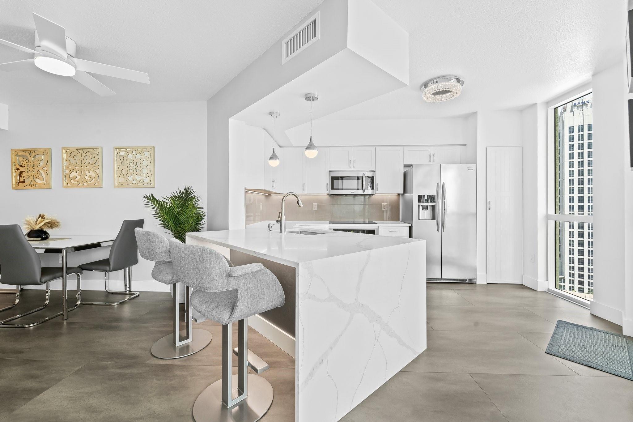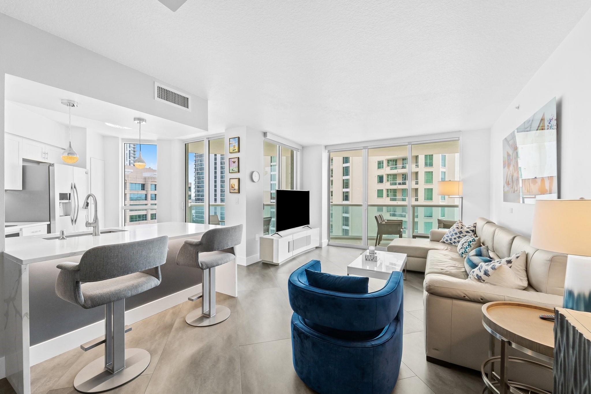 PRICE REDUCED TO SELL! IMPECCABLE 3/2 CUSTOM REMODEL OCEAN,RIVER & CITY VIEWS. DESIGNER FINISHES INCLUDE: LARGE EAT IN KITCHEN WATERFALL QUARTZ COUNTERTOPS, CUSTOM CABINETS/STAINLESS APPLIANCES, FULL TILE BACKSPLASH, NEW LUXURY VYNYL RECTANGLE WIDE PLANK FLOORING THROUGHOUT, ELECTRIC WINDOW TREATMENTS, CUSTOM LIGHTING, FULLY RENOVATED BATHROOMS & DOUBLE SINKS, LIGHTED MIRRORS, CUSTOM CLOSET IN PRIMARY BATH EXTRA STORAGE, FRAMELESS SHOWER DOORS, BUILT IN CLOSETS, MULTIPLE GLASS BALCONIES OFF KITCHEN, LIVING & PRIMARY BEDROOM. FULL SERVICE 5* LIFESTYLE INCLUDE CONCIERGE,TROPICAL POOL DECK/HOT TUB, CLUBROOM, BUSINESS CENTER, THEATER MOVIE SCHEDULE, PET FRIENDLY, 2 STORY GYM,24 HR VALET/SECURITY. ALL WALKING DISTANCE TO ALL RESTAURANTS,SHOPS, ART EVENTS,PUBLIX MARKET ON FAMOUS LAS OLAS BLVD