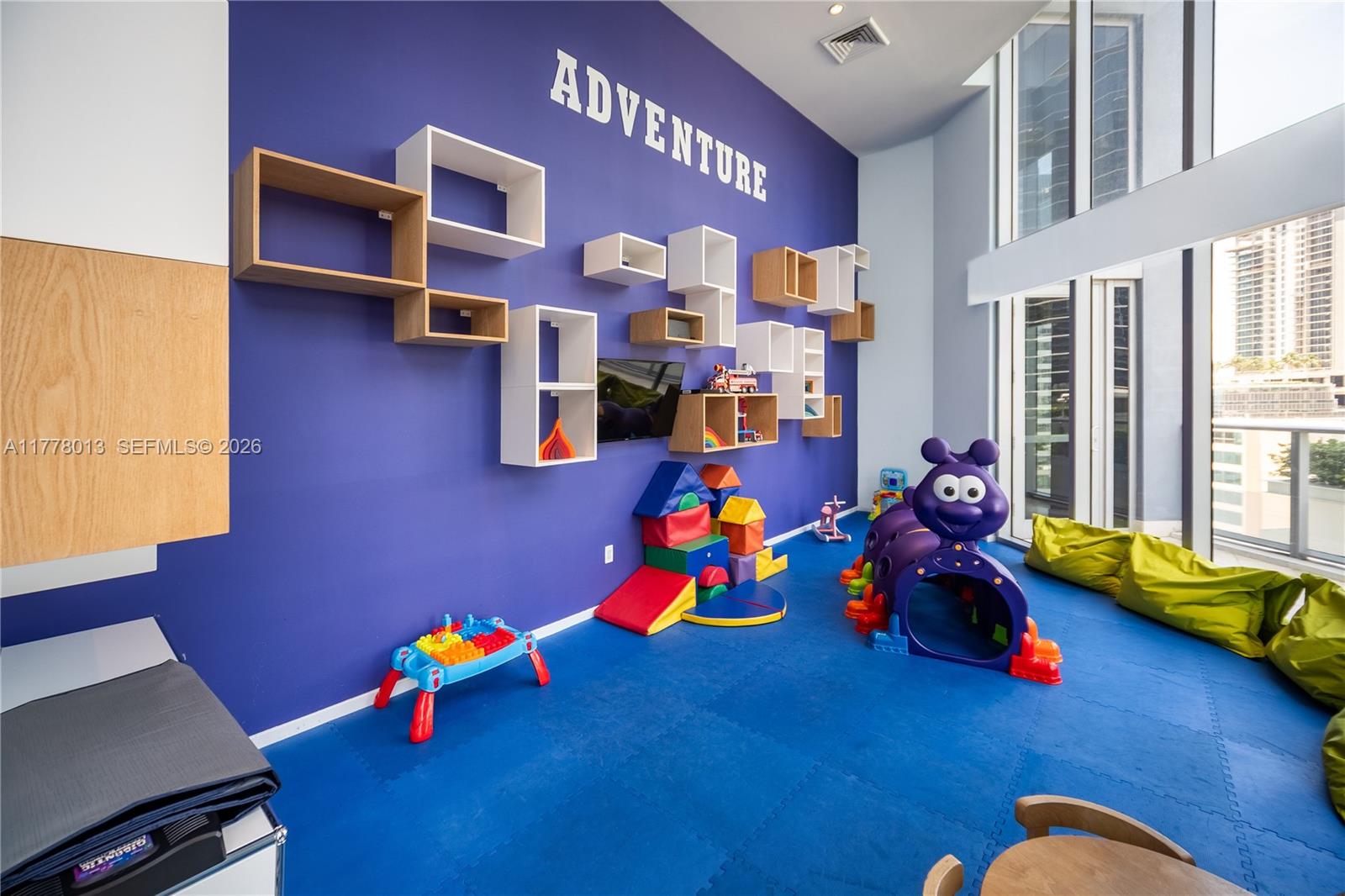Floor-to-ceiling impact window w/ motorized blackout shades