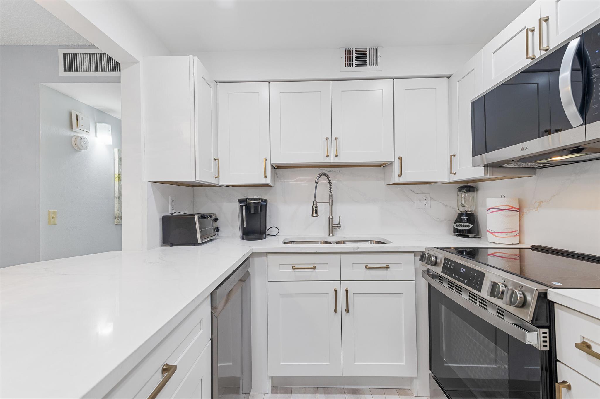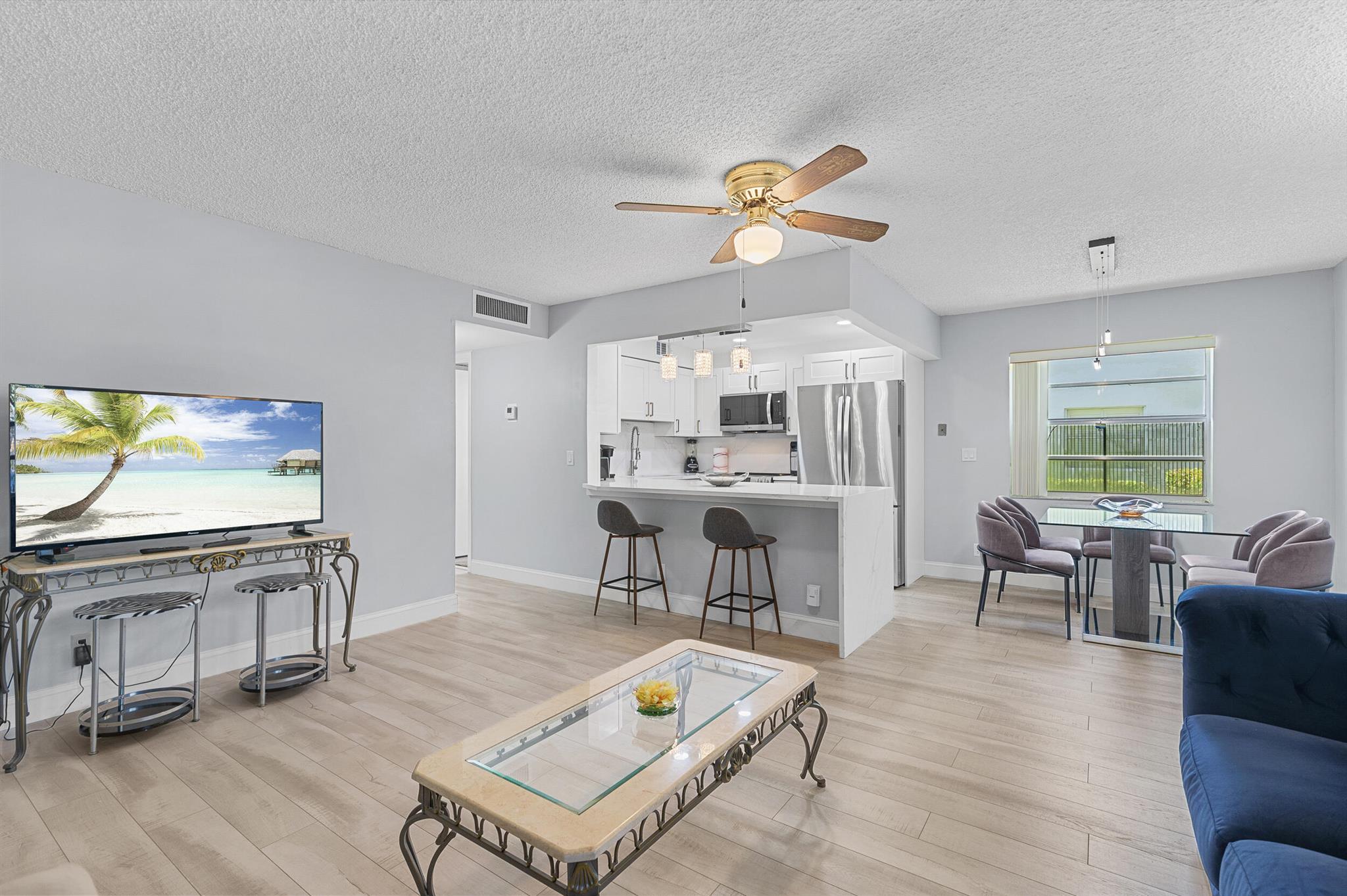 Sophisticated Corner Unit in Kings Point - Fully Renovated & Furnished! Step into refined comfort with this beautifully updated and fully furnished 2-bedroom, 2-bathroom ground-floor corner condo, located in the prestigious 55+ Kings Point Golf and Country Club. Designed with style and functionality in mind, this move-in-ready home blends modern upgrades with timeless charm. Inside, you'll find wide-plank wood-like luxury laminate flooring throughout, complemented by updated contemporary light fixtures and modern ceiling fans that create a fresh, airy atmosphere. The open-concept kitchen is a true showstopper--perfect for both everyday living and entertaining. It features a dramatic waterfall quartz countertop, stainless steel appliances, custom cabinetry, and a stylish tile backsplash.