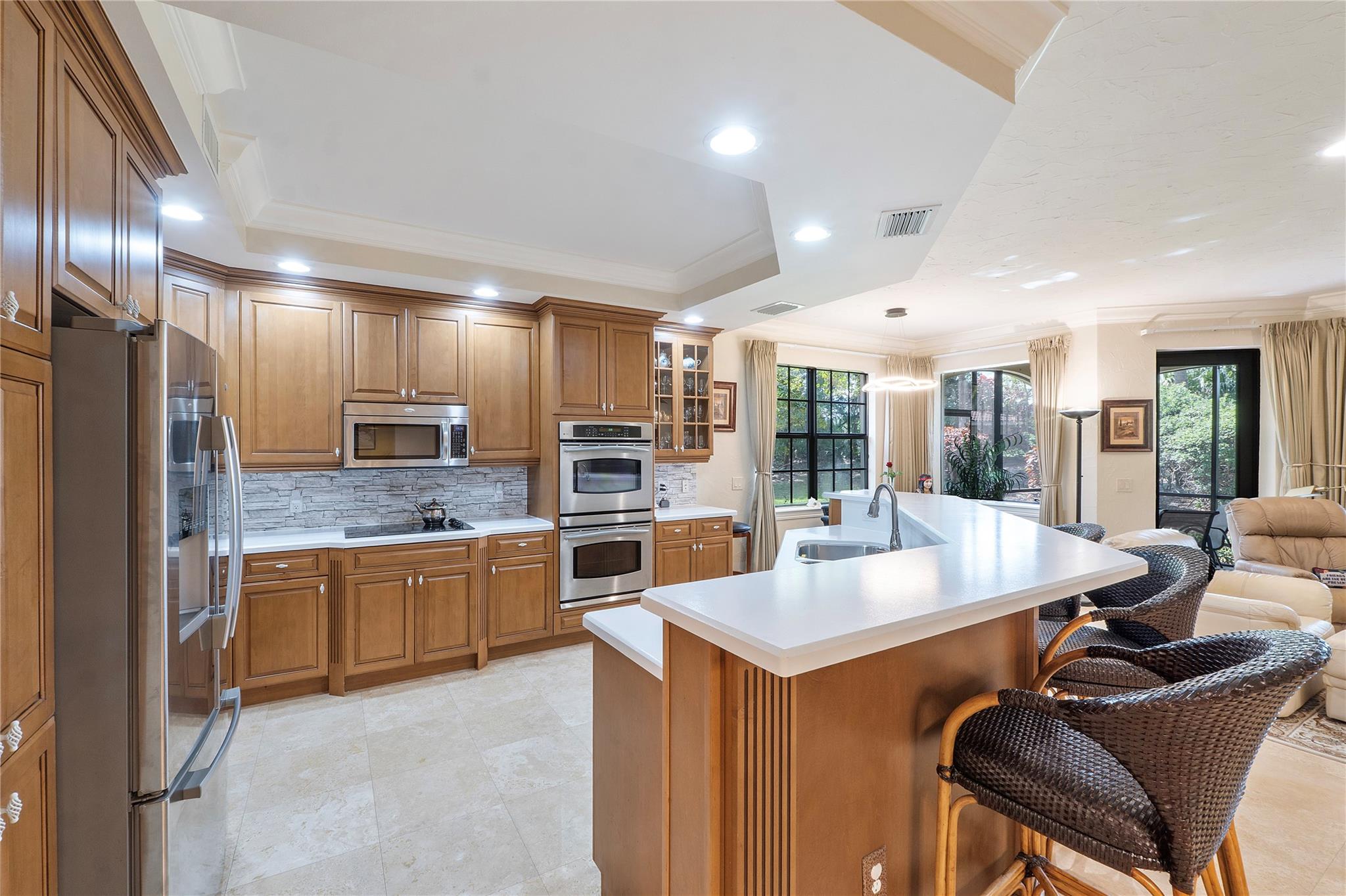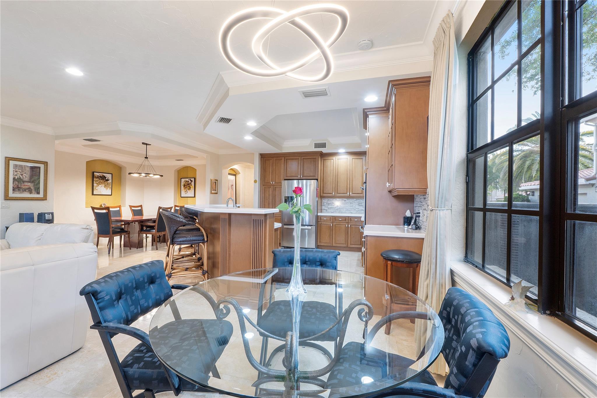 $40,000 price reduction! 3-bedrooms, 2-baths coach home corner residence in Caseras. Price adjustment to make your own updates. 1,663 under air coach home features a first-floor layout with a 2 CG, +offers a range of amenities, including a new roof, exterior insurance, painting, lawn maintenance, roof repair, exterior painting provided by the homeowners' association. Residents have access to the community's fitness center, tennis, pickleball, bar, restaurant, golf course, and pool. The residence features impact glass windows & a private patio that backs directly to the golf course, providing a serene and picturesque setting. Beautiful onsite restaurant, pickleball, gym, tennis, an ideal living opportunity for those seeking a maintenance-free lifestyle. Also, for Rent $5000 monthly annual