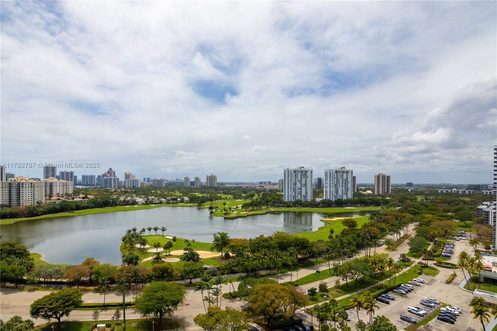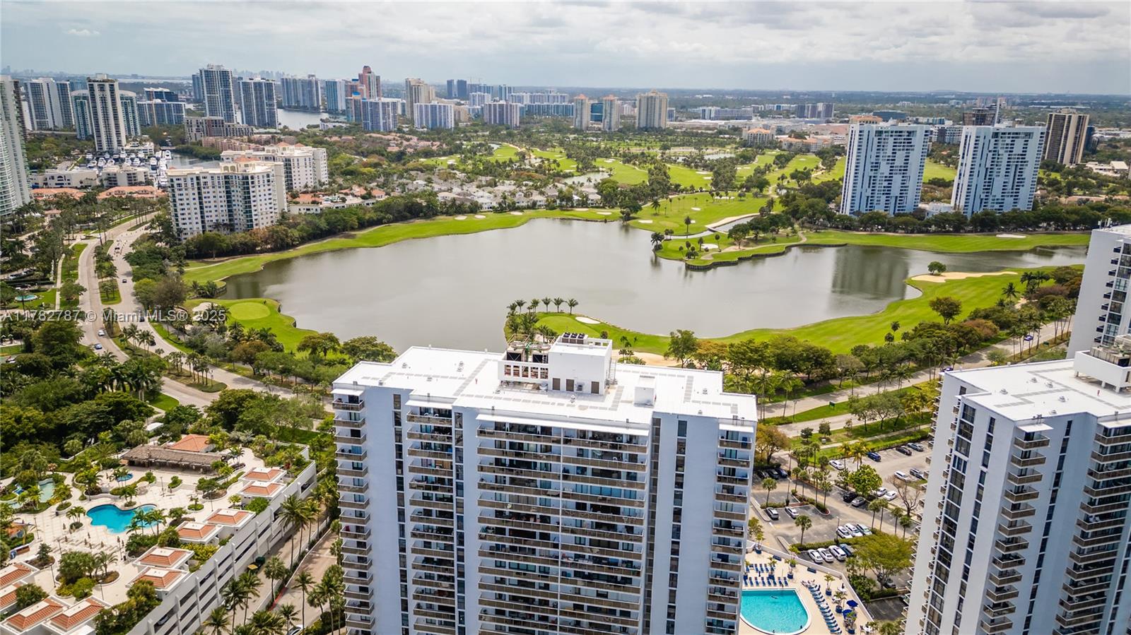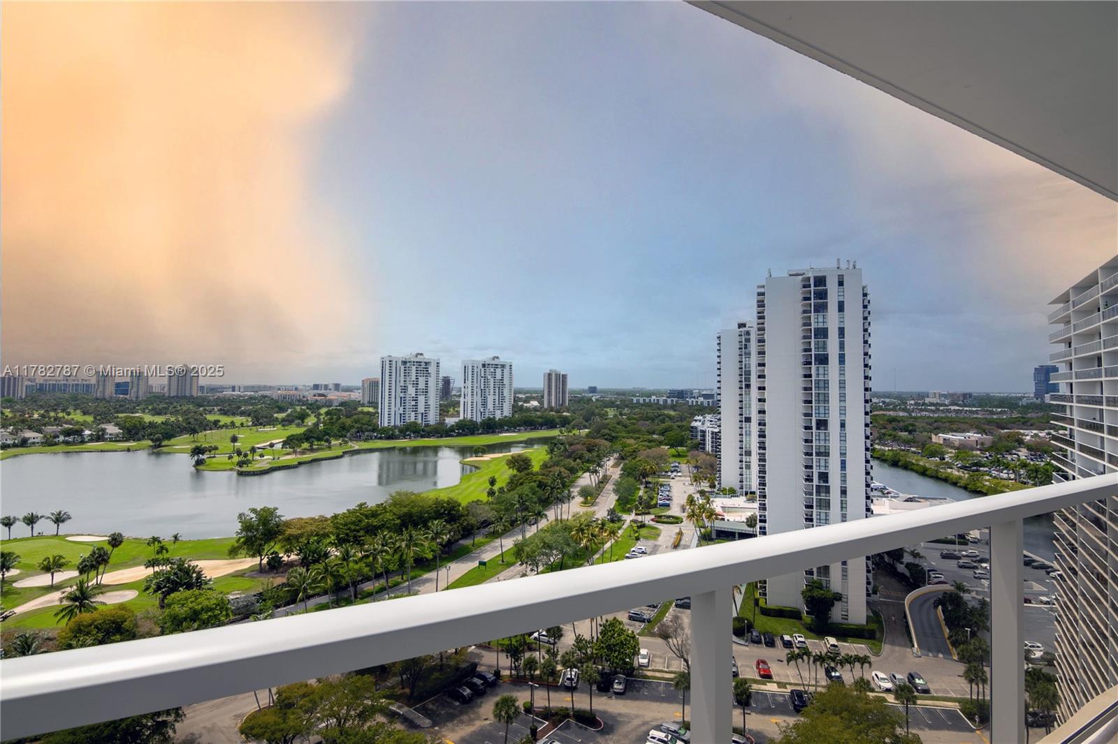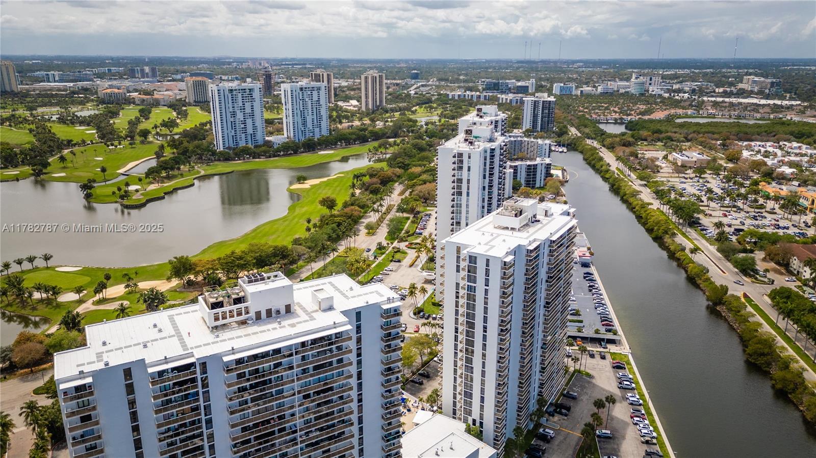 Soaring from the 19th floor, this 3-bed, 3-bath condo offers stunning golf and city views in a bright, open layout. With 1,465 sqft of tile-floored living space, the home features a well-equipped kitchen with an electric range, microwave, refrigerator, washer, and dryer in the unit. Enjoy morning coffee or sunset wine on the spacious open balcony. Central cooling and ceiling fans ensure year-round comfort, while a doorman provides added security. The waterfront building offers assigned and guest parking, blending convenience with elevated living. This high-rise retreat is perfect for those seeking comfort, style, and serene views in every direction.