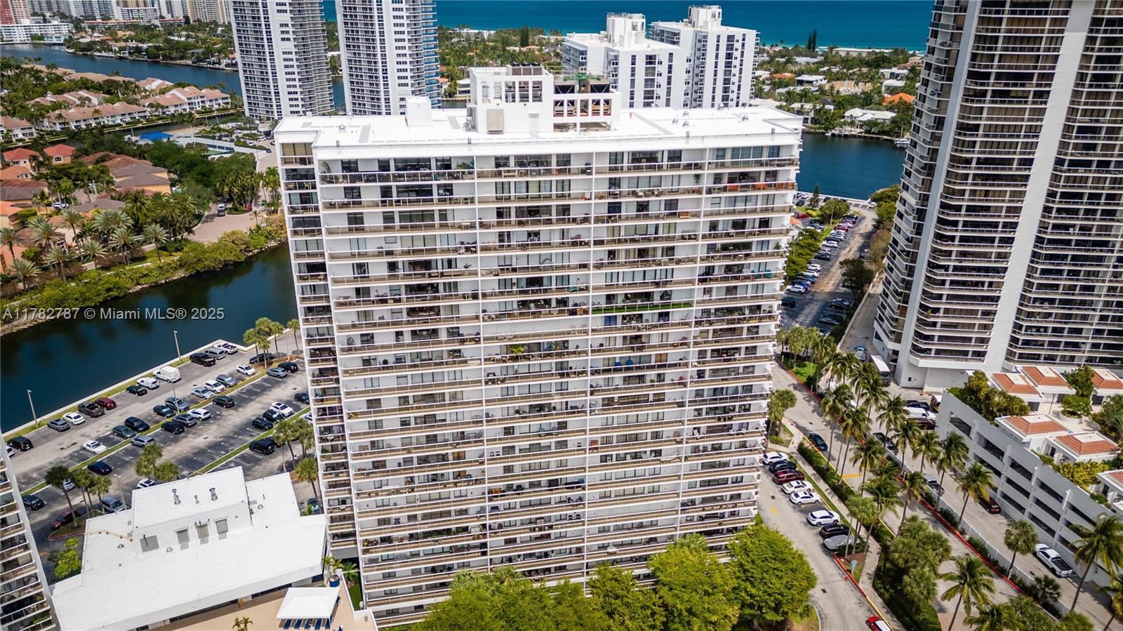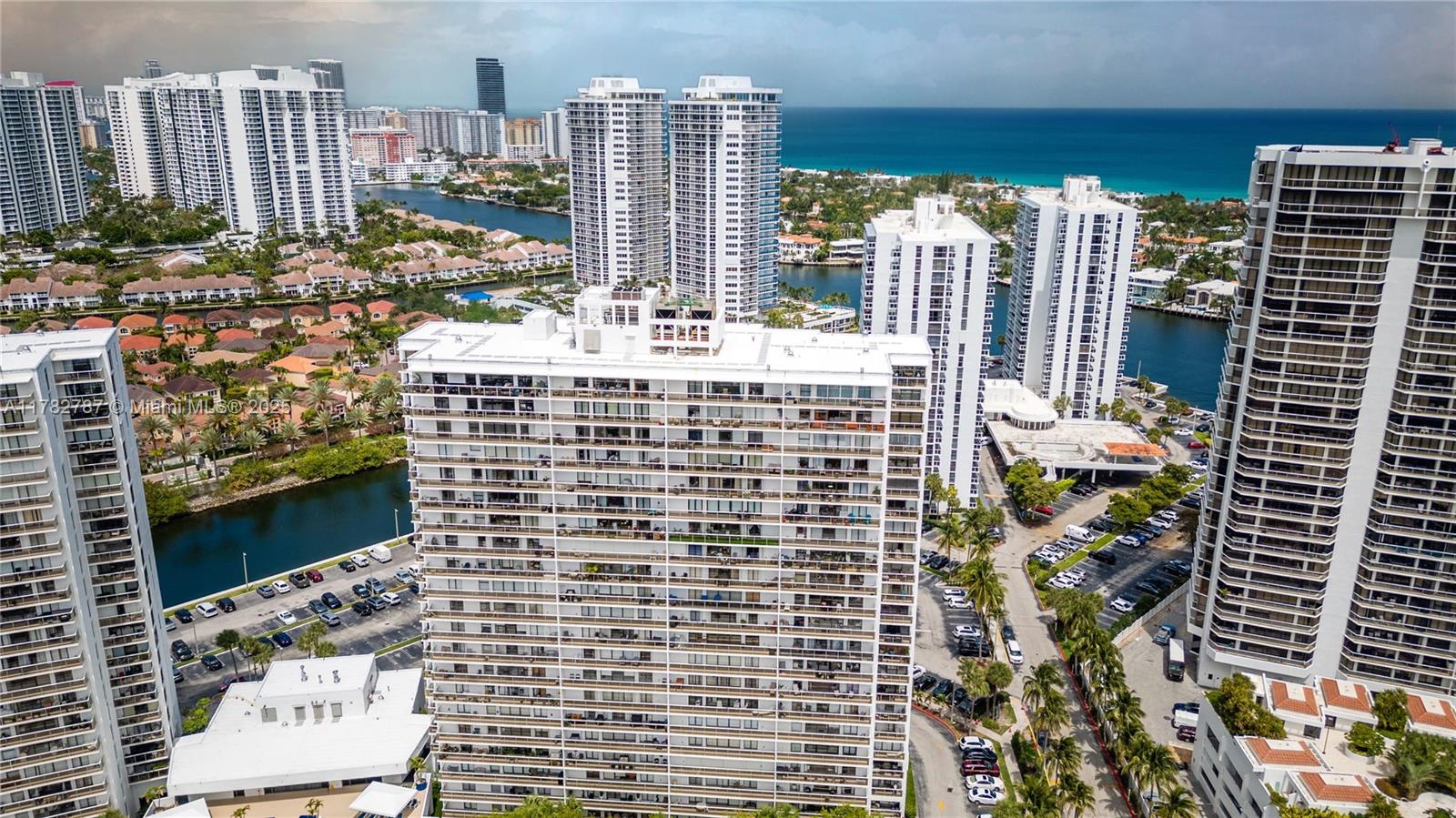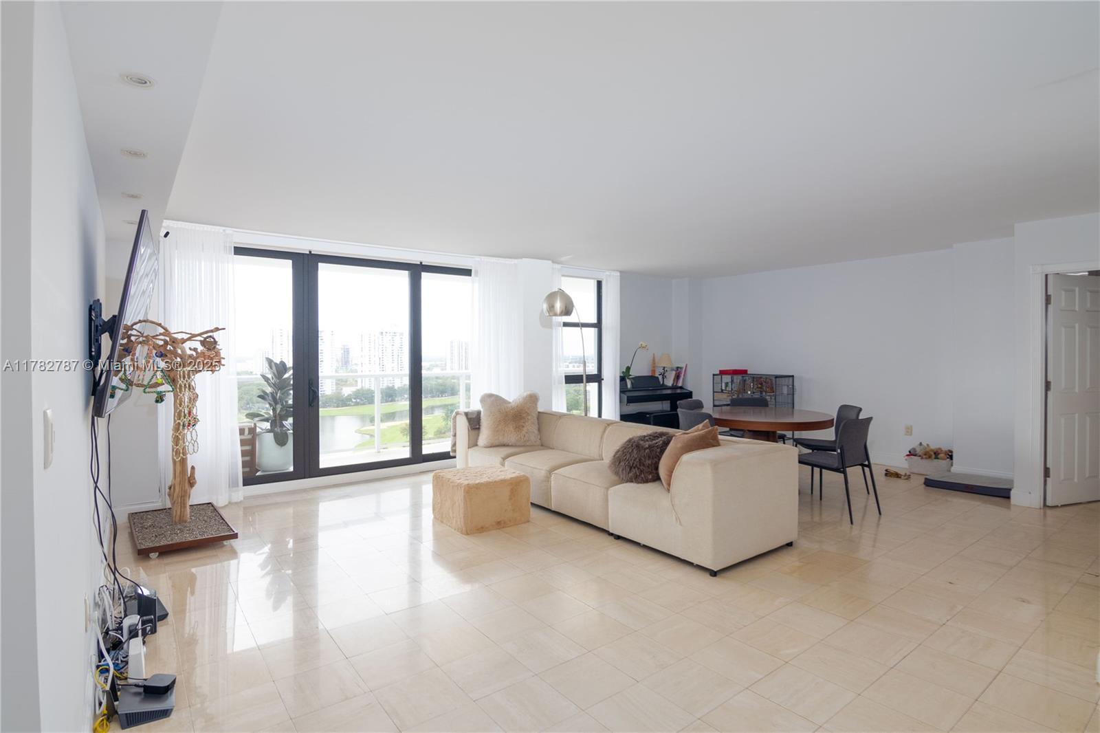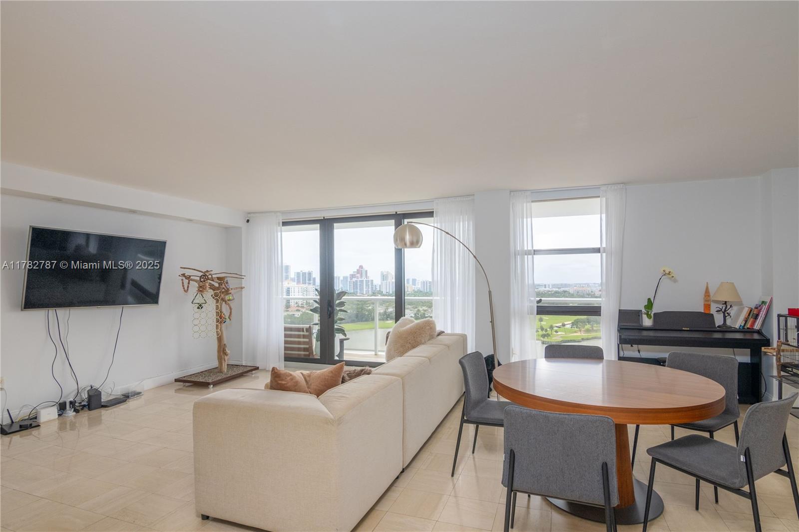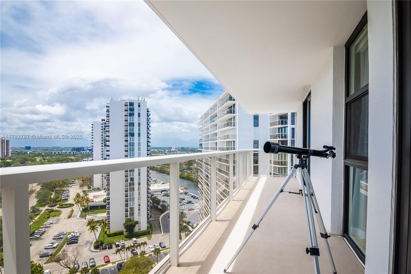 Soaring from the 19th floor, this 3-bed, 3-bath condo offers stunning golf and city views in a bright, open layout. With 1,465 sqft of tile-floored living space, the home features a well-equipped kitchen with an electric range, microwave, refrigerator, washer, and dryer in the unit. Enjoy morning coffee or sunset wine on the spacious open balcony. Central cooling and ceiling fans ensure year-round comfort, while a doorman provides added security. The waterfront building offers assigned and guest parking, blending convenience with elevated living. This high-rise retreat is perfect for those seeking comfort, style, and serene views in every direction.
