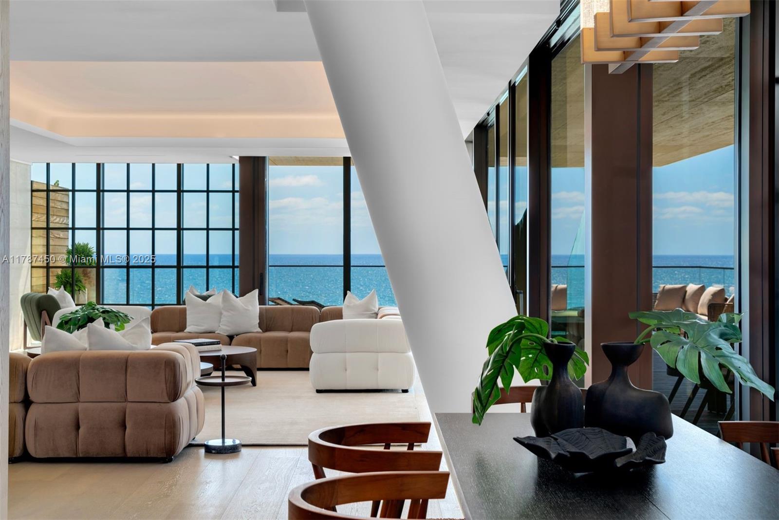Welcome to oceanfront living at ARTE Surfside by Antonio Citterio Residence No. 702, located at 8955 Collins Ave. This 3,136 sq ft flow-through residence features 3 beds and 3.5 baths. Enjoy floor-to-ceiling windows with exposures offering ocean and sunset views. The custom Poliform kitchen comes w/Gaggenau appliances, including a gas stove and wine cooler. Greek Marble countertops and elegant finishes elevate the space. The primary suite includes a natural stone soaking tub and a triple vanity. The 2,158 sq ft private wrap-around terrace is perfect for entertaining. Resort-style amenities include a rooftop tennis court, outdoor and indoor pools, spa, gym, and clubhouse. Direct beach access and services like concierge, doorman, valet parking, and security complete this exclusive lifestyle.