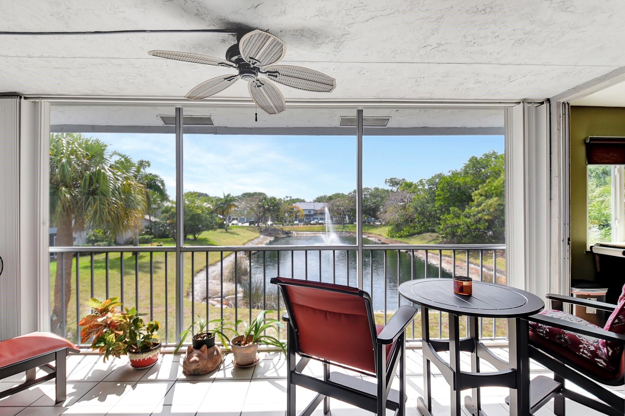 TENANT OCCUPIED UNTIL 9/2026 - INSTANT INCOME! 2nd floor residence in a prime Boynton Beach location only 10 minutes to the beach. Meticulously maintained home with expansive lake views from nearly every room. Soaring vaulted ceilings and an open-concept layout create a bright and airy feel throughout. Upgraded vinyl and tile flooring run seamlessly throughout the home. Renovated kitchen has solid wood cabinetry, newer appliances and ample counter space for entertaining. Spacious primary bedroom features a large walk-in closet with custom shelving and remodeled ensuite bath complete with an exquisite walk-in shower. Guest room w/custom murphy bed. Enjoy sunsets from your covered and screened-in balcony overlooking the lake. Impact windows, accordion shutters and private attached garage!