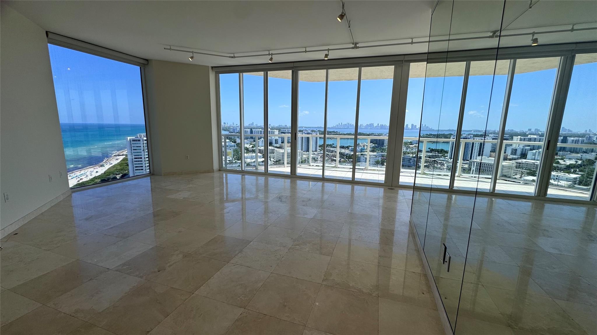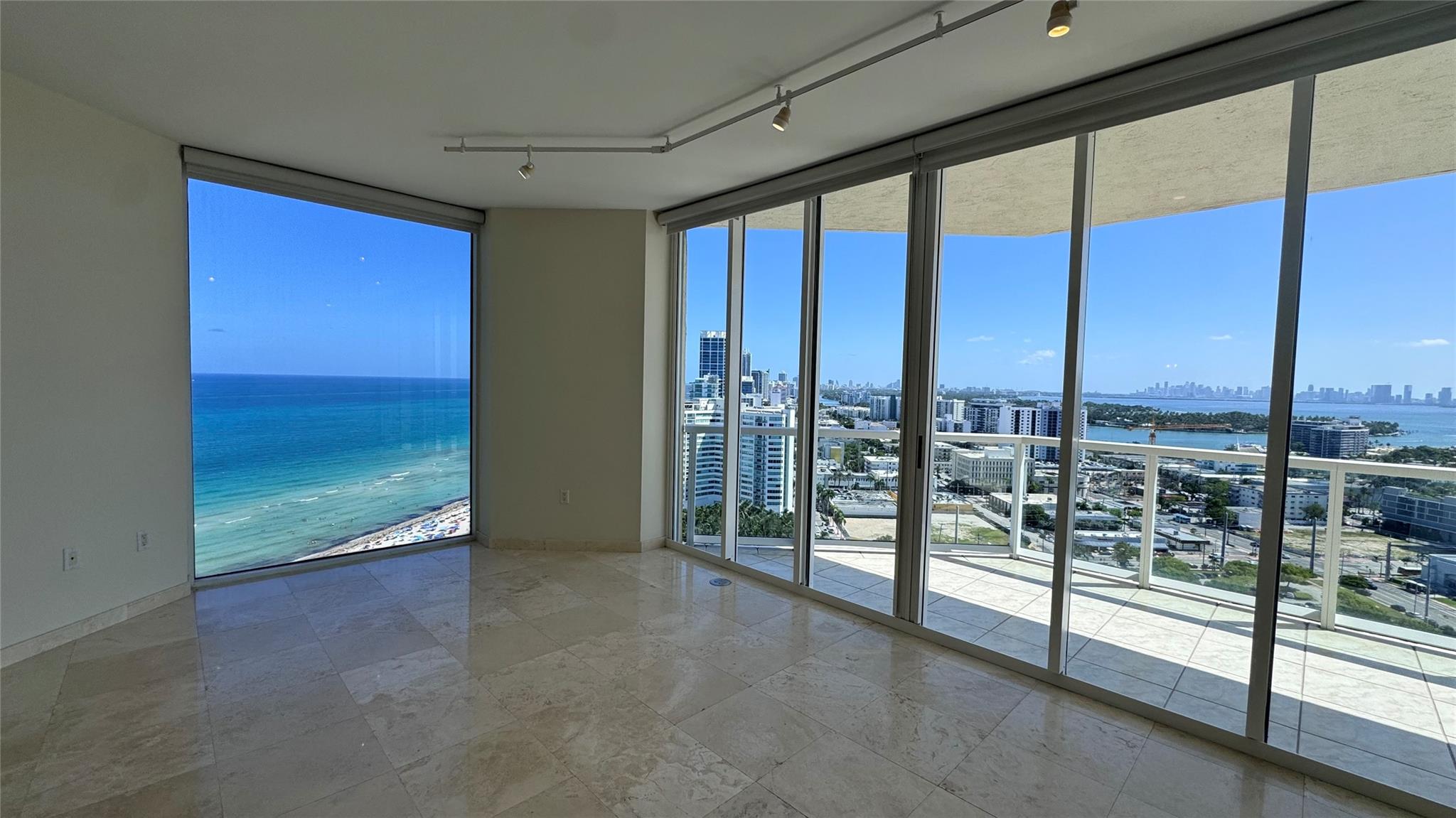 Wake up to sweeping 180-degree views of ocean and Miami skyline in this oceanfront corner penthouse at the Saint Tropez Ocean. This rare 25th floor unit boasts marble flooring, dual balconies, and floor-to-ceiling windows. Elevated ceilings and two side-by-side parking spaces are penthouse features. Luxury amenities include a fully renovated 5th floor rooftop pool and jacuzzi (scheduled for July 2025) and state-of-the-art fitness center. The building, built in 1999, is in excellent mechanical and financial condition, and a nearly complete $15 million park redevelopment awaits in front. Further developments will not obstruct views in the coveted “C-line". The unit is fully move-in ready including new appliances, A/C, HWH, window shades, bedroom flooring, and interior/ exterior paint!