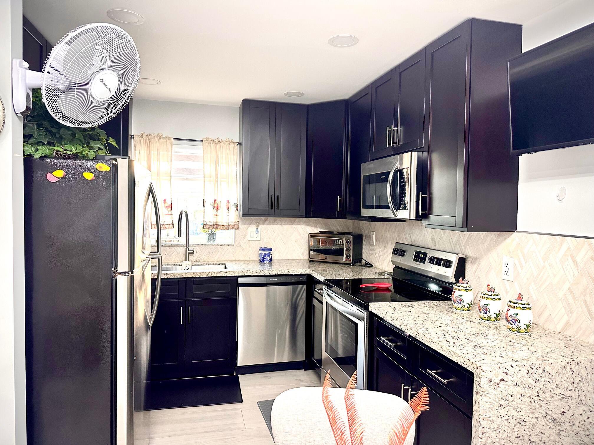 This stunning unit boasts an updated kitchen complete with stainless steel appliances. Every detail has been thoughtfully updated. Both bathrooms showcase modern ceiling-to-floor tile finishes. Enjoy energy-efficient LED recessed lighting throughout in the kitchen and living room to set the perfect mood. Additional upgrades include a 4 year old A/C unit and water heater, stylish Zebra blind window treatments. Impact-resistant windows have been installed in the kitchen, bedroom, and both bathrooms for added peace of mind. Step outside to a beautifully updated patio area with newly installed pavers. This immaculate unit is a must-see and won't be on the market for long!
