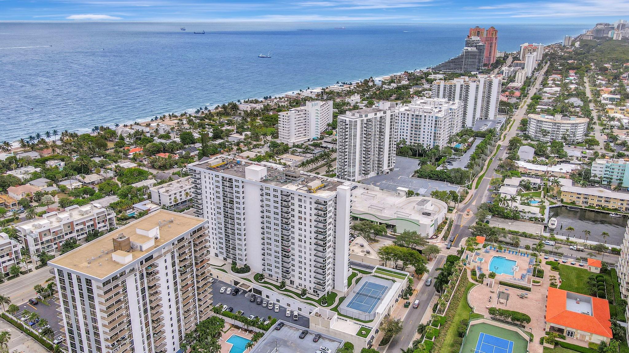 Direct ocean view from your living room, kitchen & balcony. bright, spacious unit. NE corner. Updated kitchen. Tiled throughout the unit. Impact windows/doors. Move in condition. Watch the pool and beautiful 2nd deck. View of galt ocean all the way north to lighthouse. Walk to the beach, shops, many popular restaurants, Publix across the street. Garage pkg. 24hr front desk svc. guest pkg outside. Glass balcony. 2025 roof. 50yr milestone done, water cooler. Hoa includes, water, sewer, trash pick up, basic cable, high speed fiber optic internet, pest control. You only pay electric. Extra storage & Laundry facility on same floor. Bike storage in the garage. Great place to live. great location to be in. Bayview school boundary. A rated elementary. all ages. Easy to show. NON smoking bldg.