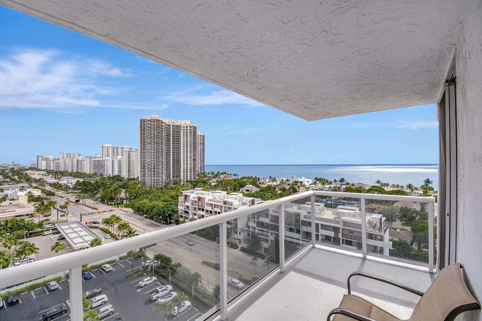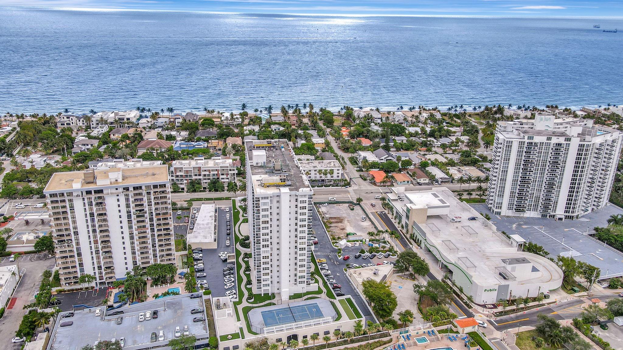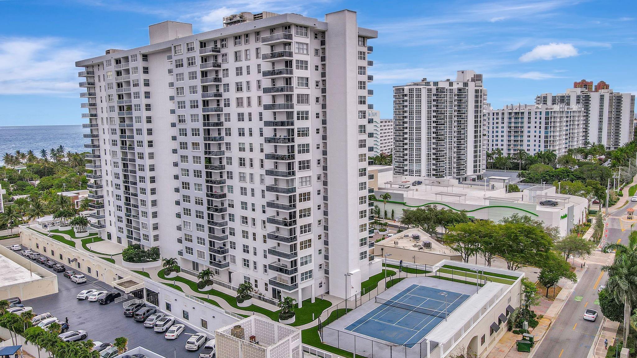 Direct ocean view from your living room, kitchen & balcony. bright, spacious unit. NE corner. Updated kitchen. Tiled throughout the unit. Impact windows/doors. Move in condition. Watch the pool and beautiful 2nd deck. View of galt ocean all the way north to lighthouse. Walk to the beach, shops, many popular restaurants, Publix across the street. Garage pkg. 24hr front desk svc. Lots of guest pkg outside. Glass balcony. 2025 roof. 50yr milestone completed. Hoa includes, water, sewer, trash pick up, basic cable, high speed fiber optic internet, pest control. You only pay electric. Extra storage & Laundry facility on same floor. Bike storage in the garage. Great place to live. great location to be in. Bayview school boundary. A rated elementary. all ages. Easy to show. NON smoking bldg.