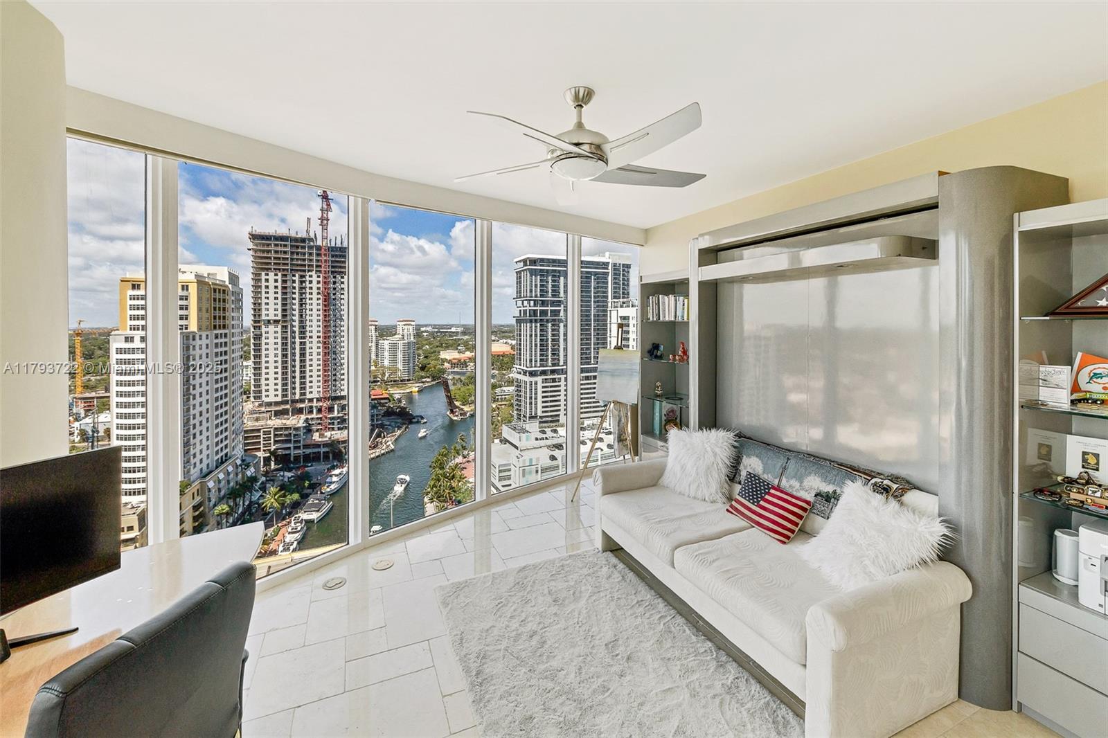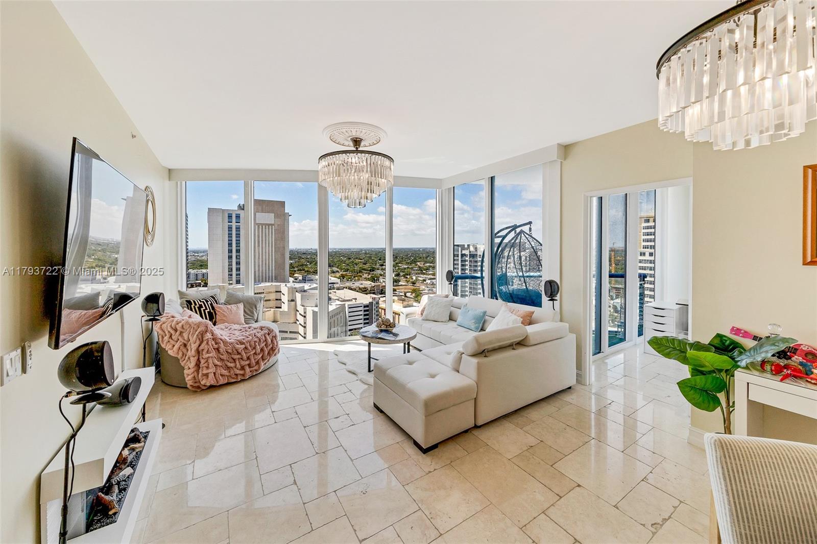 Welcome to the Las Olas River House – Where Location Meets Modern Luxury. Perched high on the 24th floor, this stunning 2-bedroom, 2-bathroom residence offers breathtaking views of the New River and Downtown Fort Lauderdale. Ideally located just off the elevator lobby, this unit provides convenience, comfort, and style the moment you arrive. Step inside to discover elegant marble tile flooring that flows throughout the main living, dining, and kitchen areas. To your right, the open-concept kitchen is designed to impress, featuring granite countertops, upgraded cabinetry, and stainless steel appliances – perfect for entertaining or enjoying a quiet night in. Floor-to-ceiling windows flood the space with natural light and frame the expansive skyline and river views,