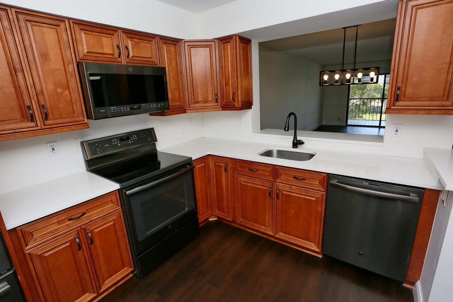 Storm Smart Screen provides hurricane protection for gusts up to 150 mph on the balcony. A/C 2021, water heater 2022. Lancaster model 2 bedroom, 2 bath condo with lake views. Updated kitchen features soft close wood cabinetry, quartz countertops, GE Profile fingerprint-resistant black stainless appliances, and a pantry with pull-out drawers. Duralux waterproof luxury vinyl flooring throughout the entire unit, offering both style and durability. Primary suite includes an updated en suite bath, 2 walk-in closets and direct access to the balcony. Updated 2nd bath provides access from both the second bedroom and hallway, enhancing functionality and privacy. Sit and enjoy your morning coffee or