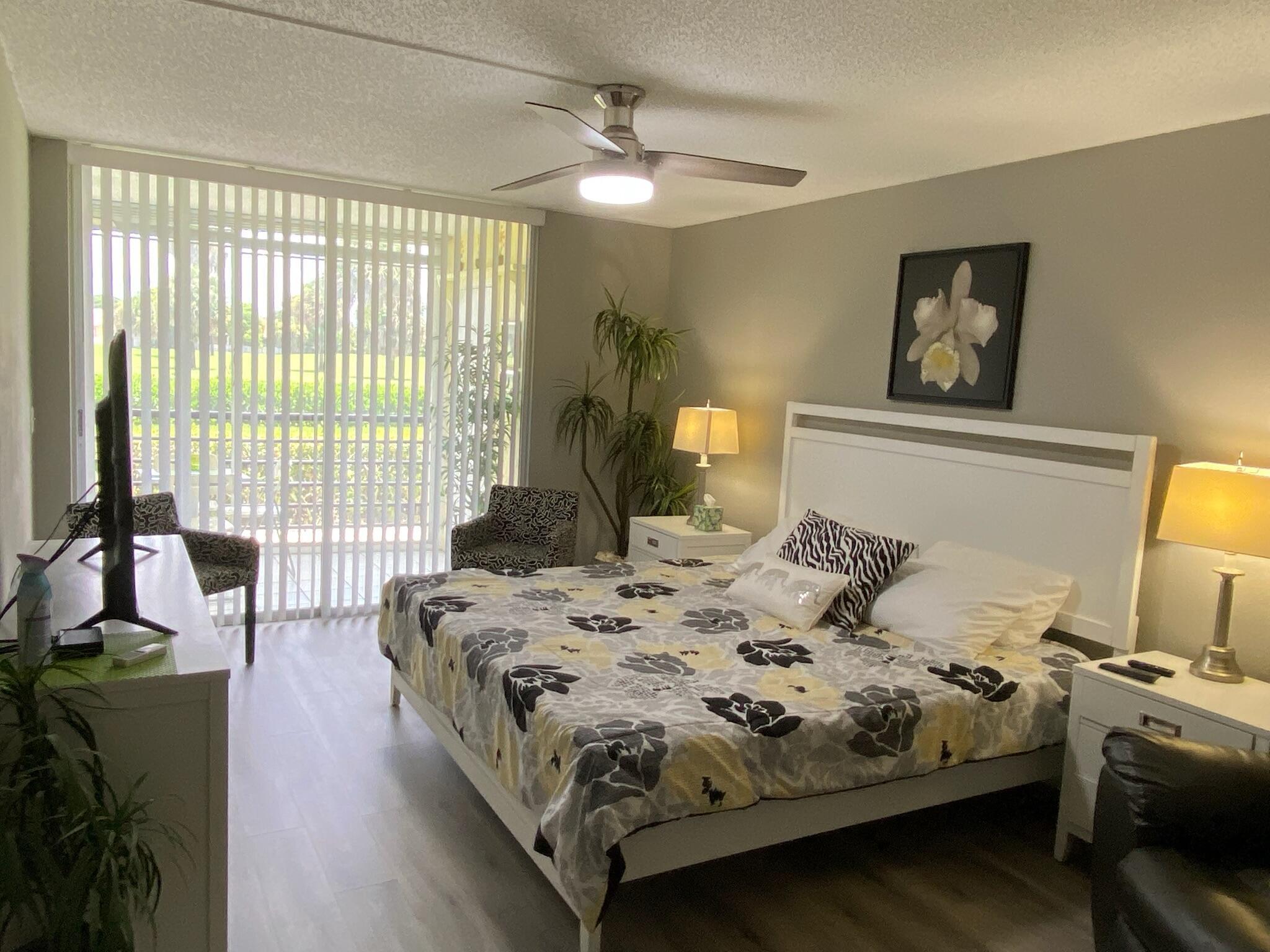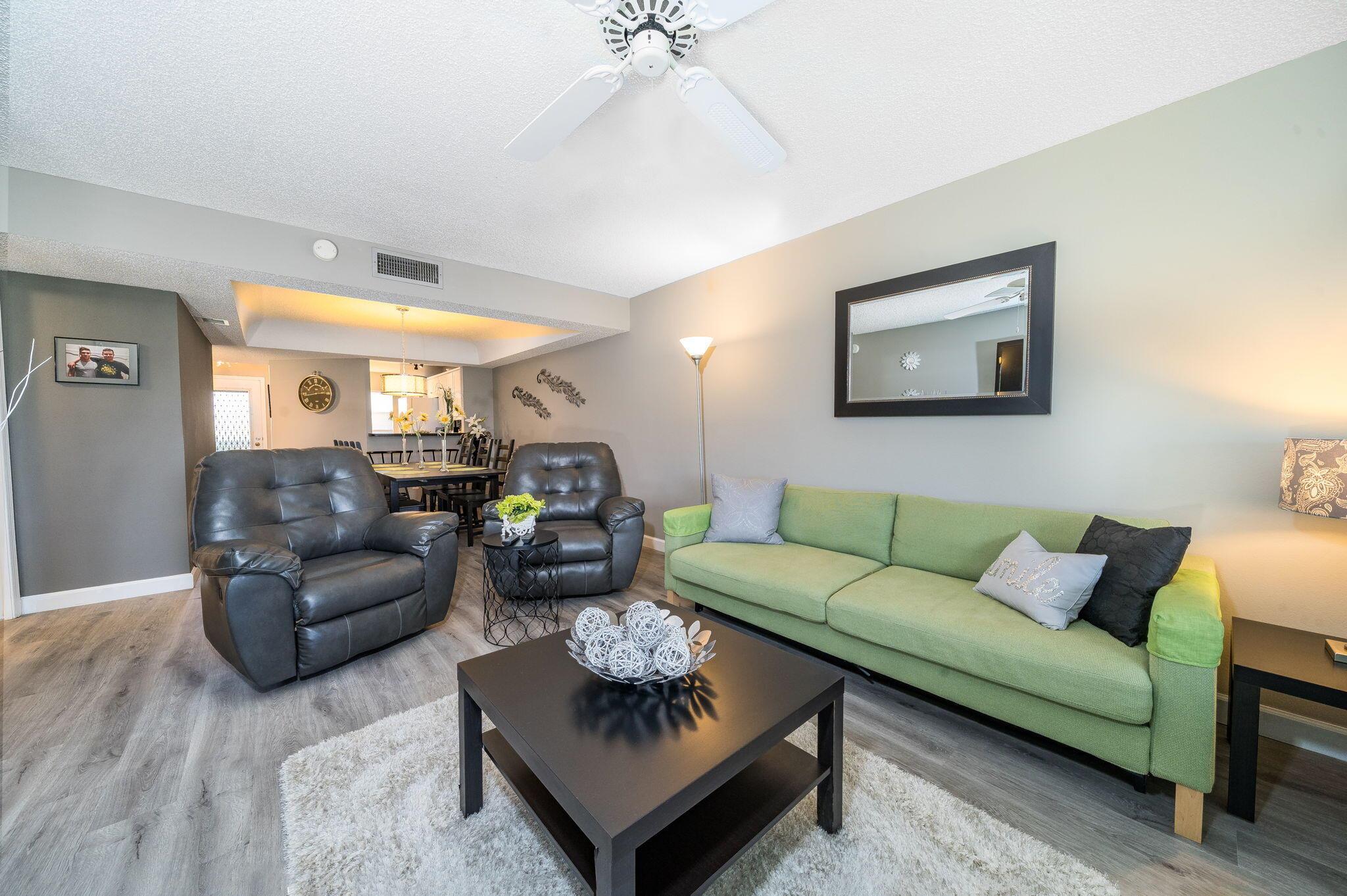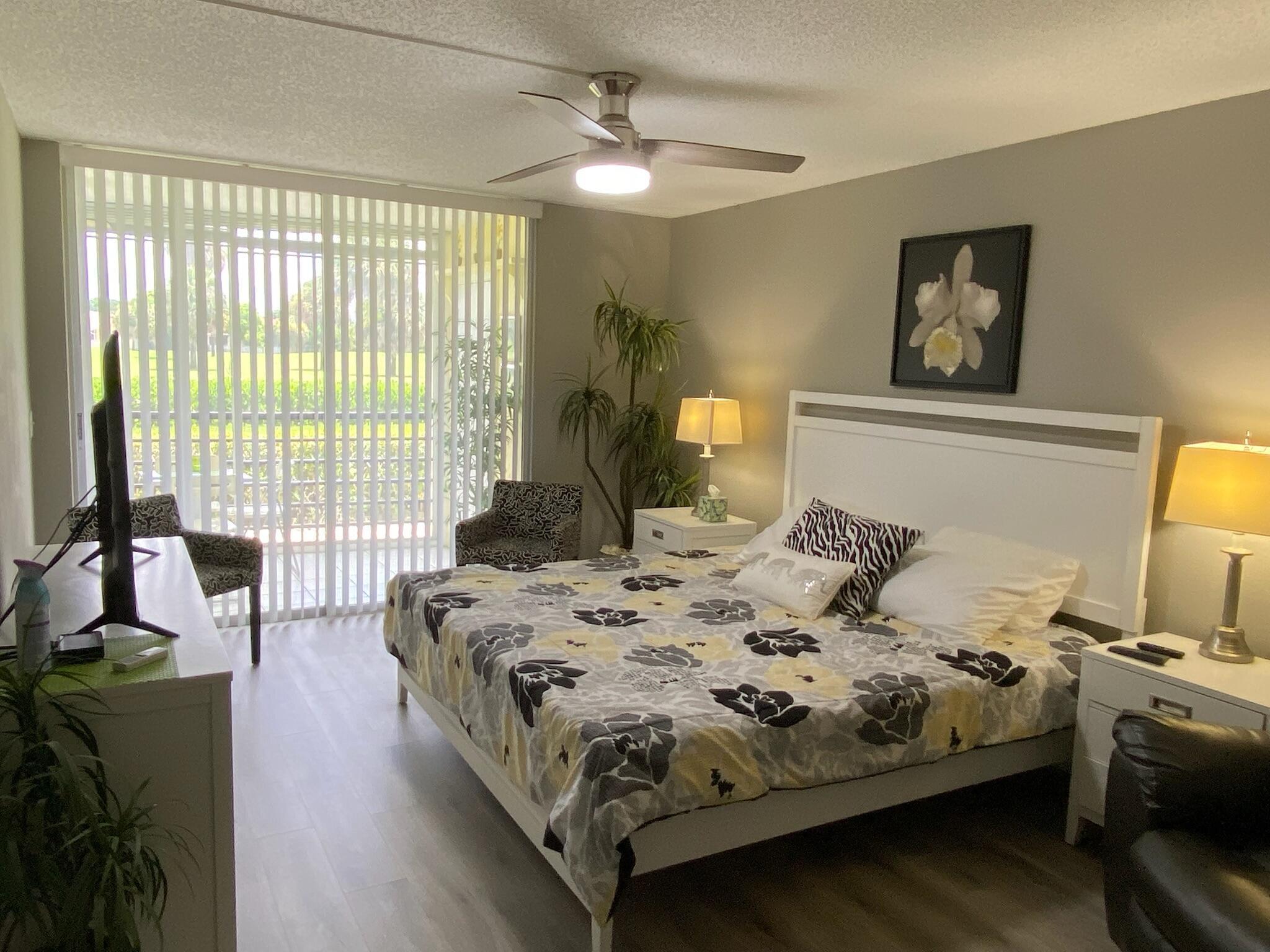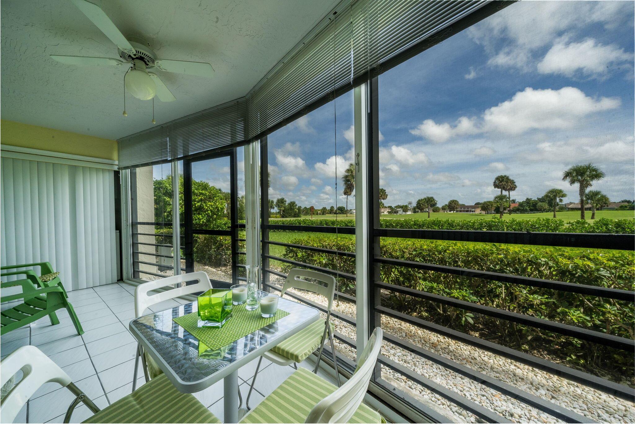 Gorgeous golf view to enjoy for the winter or all year! Ready now for quick closing! Enclosed patio with extra sliders to watch the golfers go by with your morning coffee or happy hour, use as extra room or open for the breeze! Updated first floor 2 BR/2 BA condo with modern furnishings (negotiable), upgraded cabinets, vanities, lighting, ceiling fans, high end vinyl plank flooring, Full size washer & dryer off patio. Covered carport in front of unit. Have fun at the community pool, tennis, pickleball, clubhouse, central fountain. Close to shopping, bus routes, major highways. Short drive to the beach. Milestone inspection completed for this building, seller paid assessment. COME HOME TO BOCA BARWOOD!