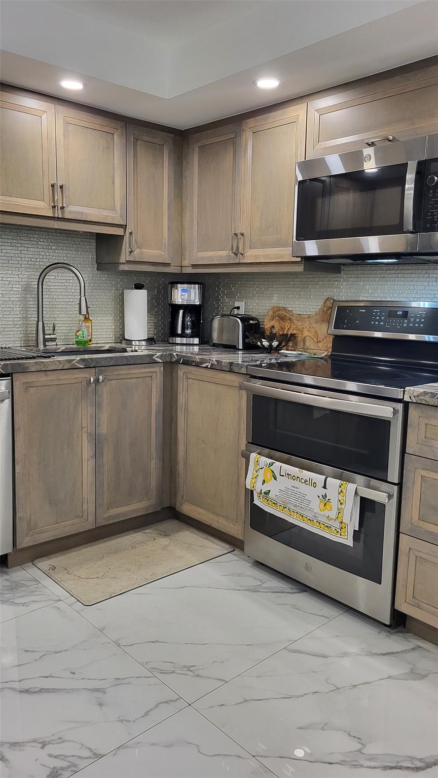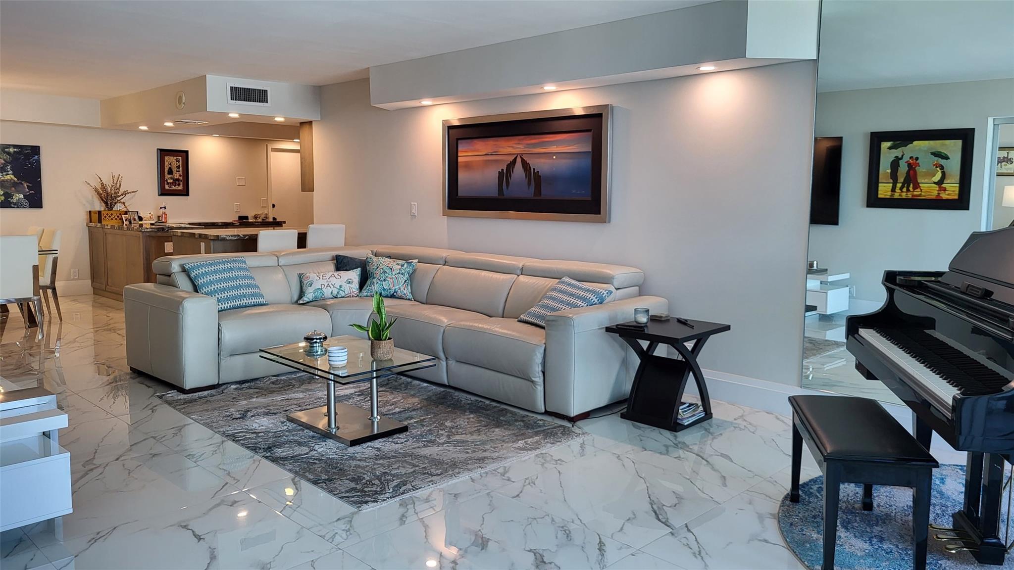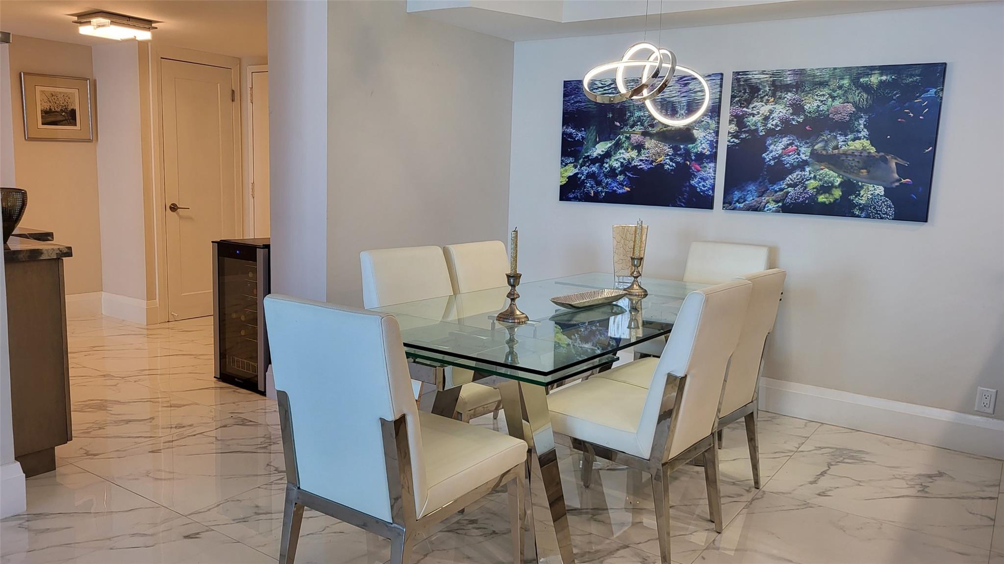 Elegance exudes from opening the front door of this remodeled & furnished 2/2 you have been looking to call your home! The foyer greets with custom, high end marble floors, custom cabinetry & gorgeous finishes which carry throughout the entire unit. The owner spared no expense, creating an exquisite unit with outstanding views. A few more steps in opens up into an expansive living dining area leading to a parlor grand piano & balcony. A chef's kitchen appointed with GE Profile appliances including a double oven & generous elegant top of the line stone counter tops. Both bathrooms are also fitting the most discriminating taste. Enjoy beautiful ocean view from the entire main bedroom and its large walk-in closet with built-ins as well. The guest bedroom has a cool bonus desk/reading alcove.