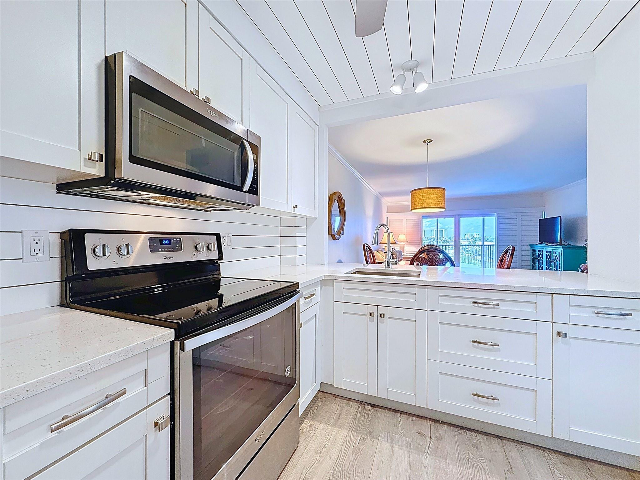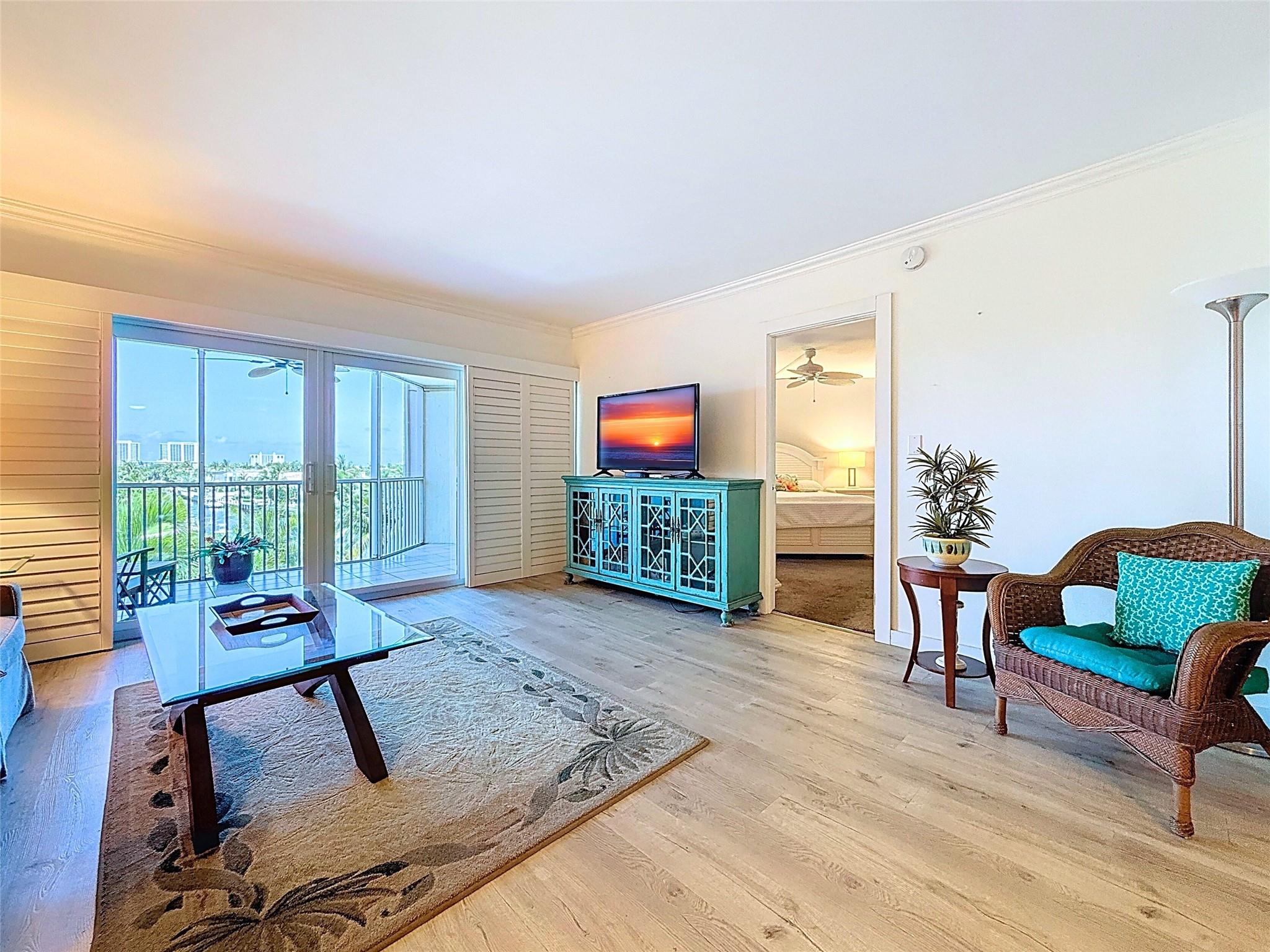 Amazing views from the moment you enter this tastefully updated unit. Large screened patio to enjoy the beautiful water views and sunrise from the 5th floor location. Kitchen is opened up with white cabinetry, quartz countertops and SS appliances all in great shape. Hurricane Impact glass throughout, newer AC and hot water heater- RHT association has nice dockage (upon availability) tropical pool area. The 40 years inspection is complete, assessment paid by Seller- great time to purchase in this wonderful community.