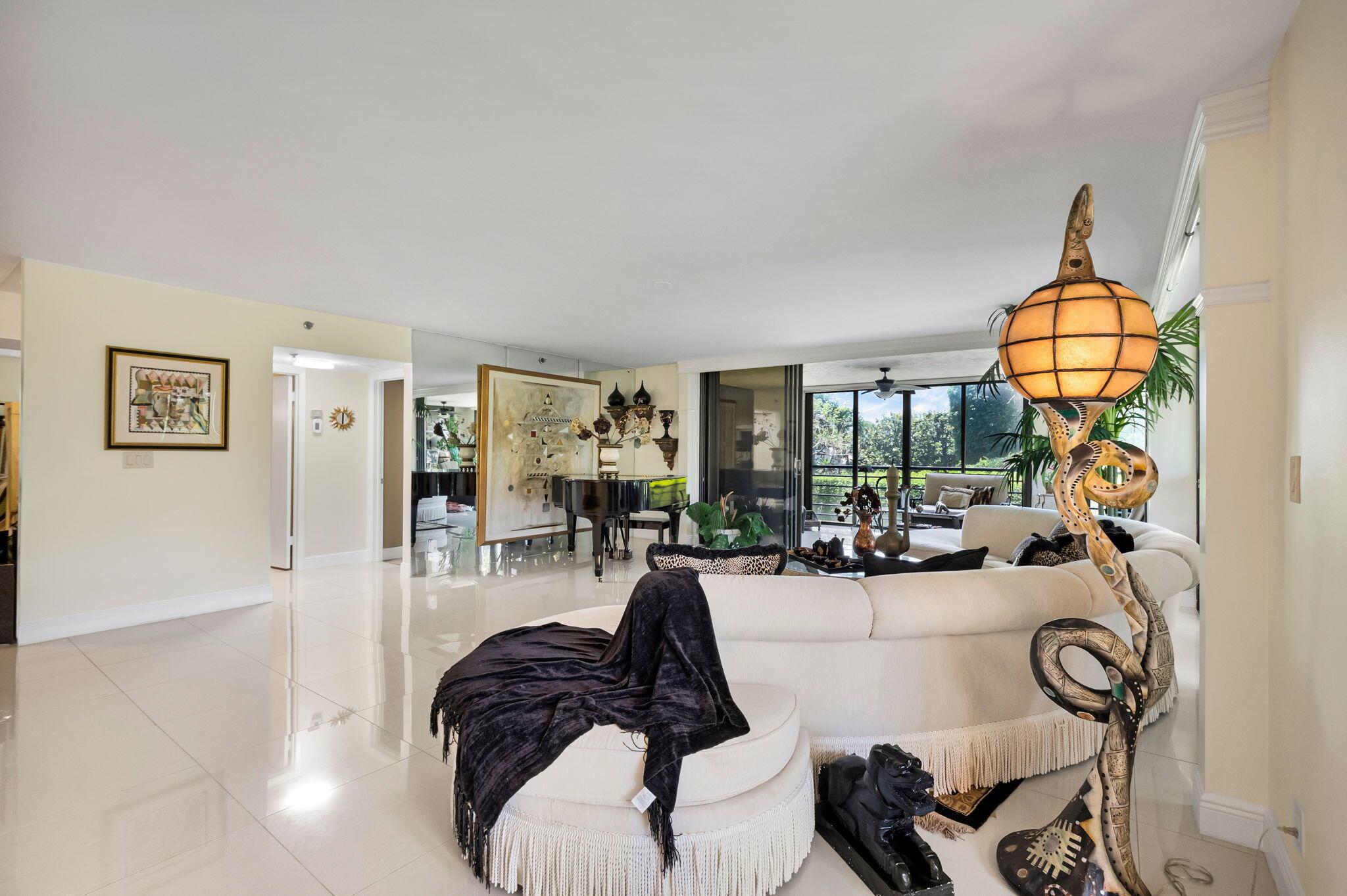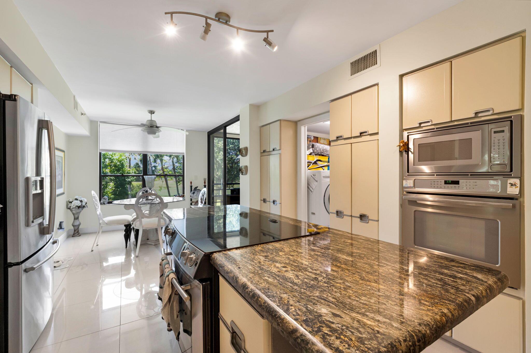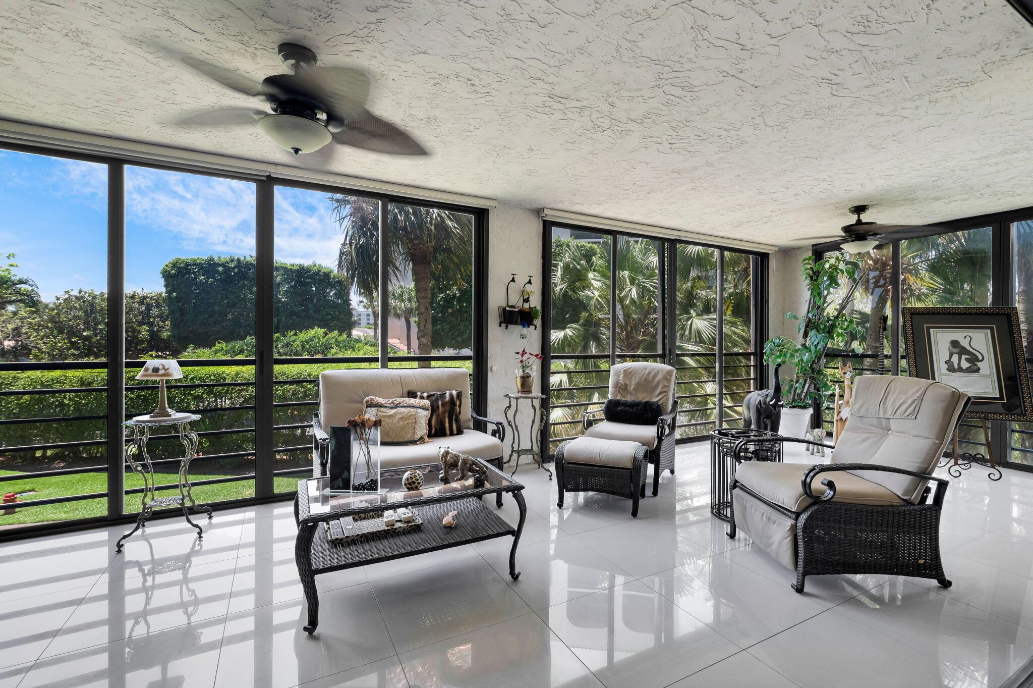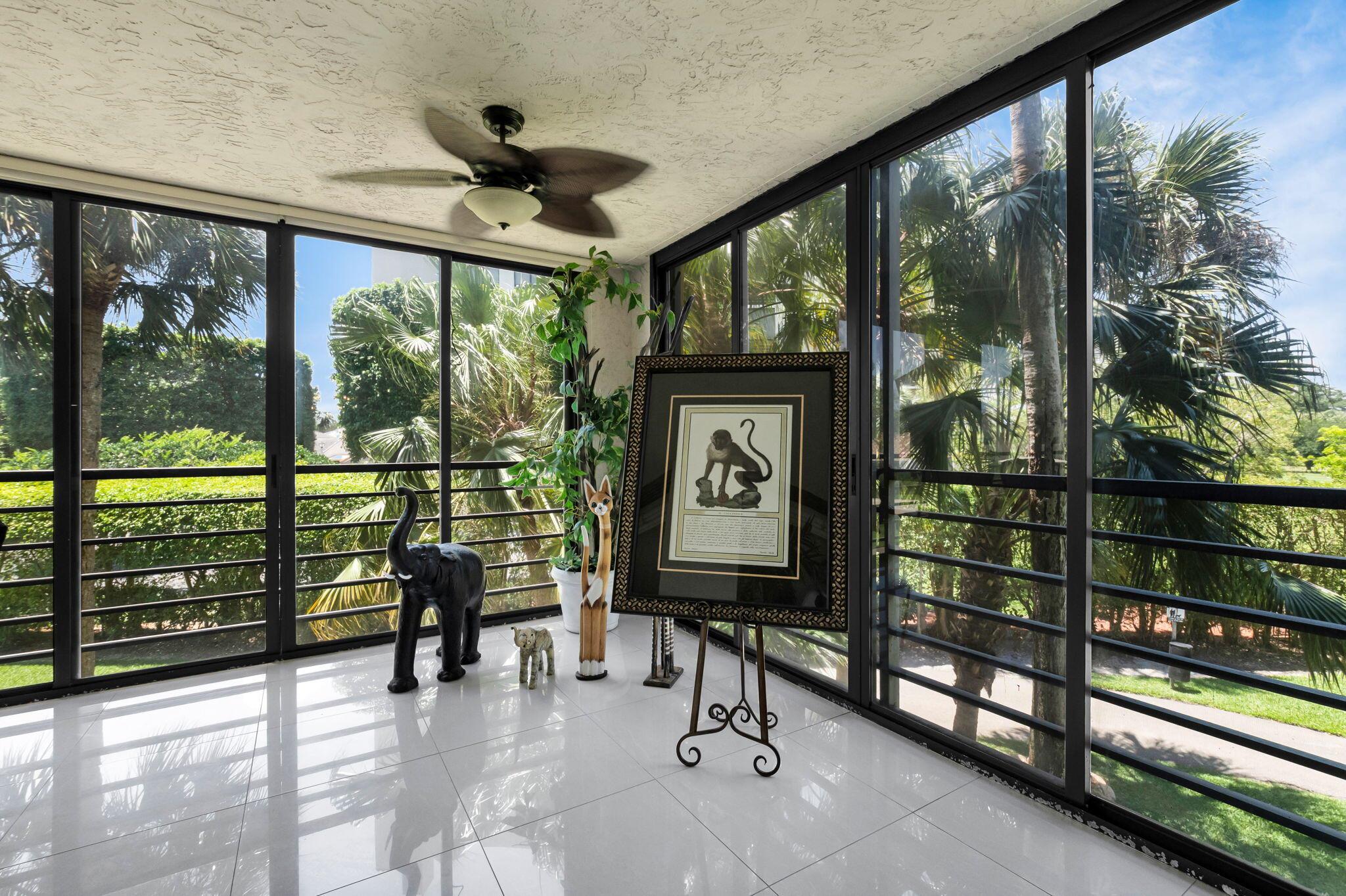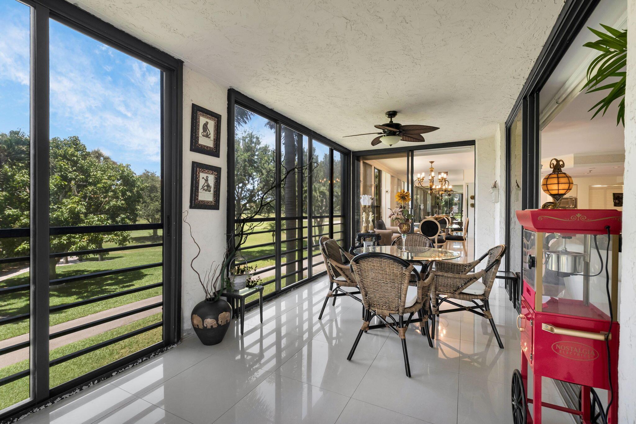Spacious condo with over 2,400 sq. ft., plus a large glass-enclosed wraparound patio! 3rd bedroom currently used as open den. Serene garden views with golf course in the distance. Main living areas feature large neutral tile flooring, 2nd bedroom has wood floors and master bedroom has laminate flooring. Kitchen boasts granite countertops, stainless steel appliances, pass-through to the living room, and storage closet. Separate laundry room has front-loading washer and dryer plus sink. Living room features a built-in bar and formal dining area. Smooth ceilings throughout. Powder room updated with cabinet and glass bowl sink. Master suite includes double-sinks, separate tub and shower with updated glass enclosure. Close, covered parking spot and second-level cabana by community pool.
