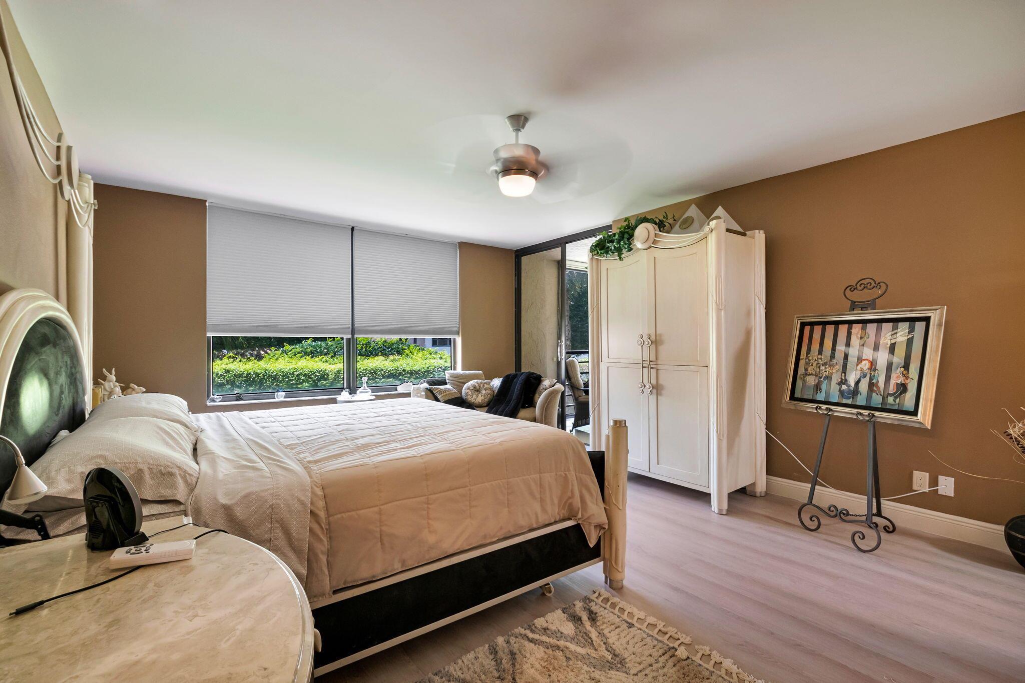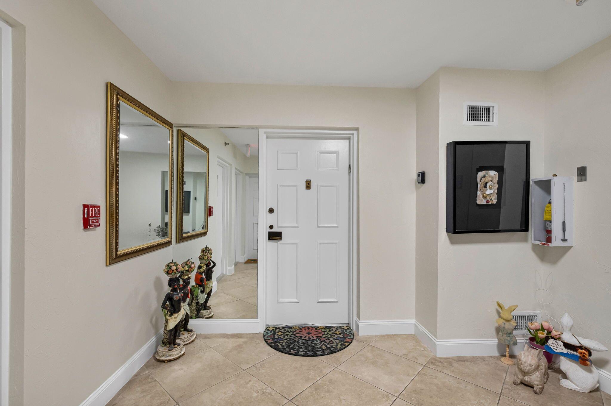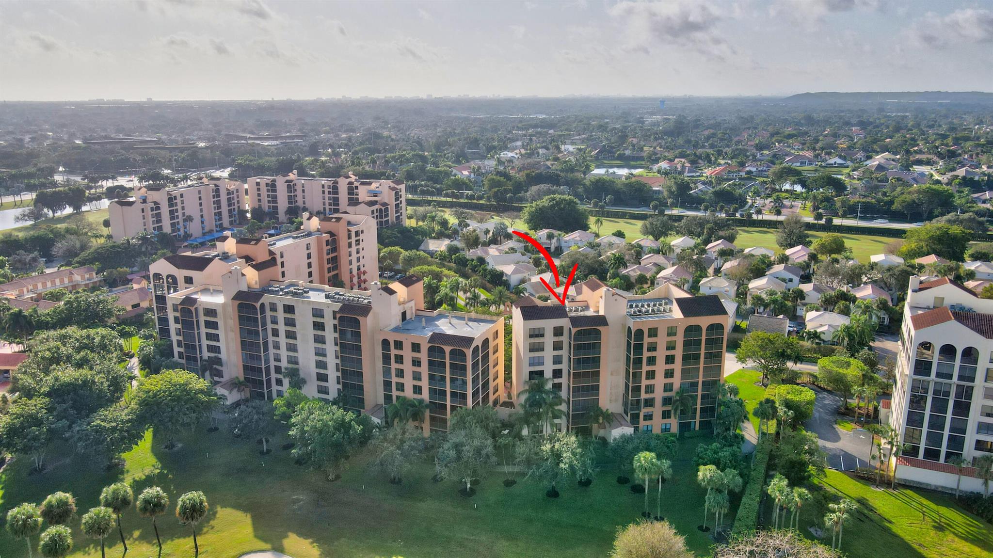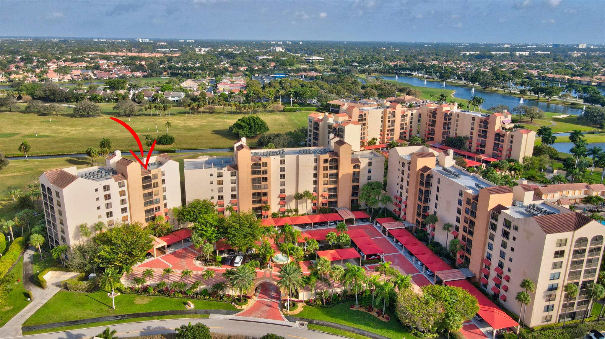 Spacious condo with over 2,400 sq. ft., plus a large glass-enclosed wraparound patio! 3rd bedroom currently used as open den. Serene garden views with golf course in the distance. Main living areas feature large neutral tile flooring, 2nd bedroom has wood floors and master bedroom has laminate flooring. Kitchen boasts granite countertops, stainless steel appliances, pass-through to the living room, and storage closet. Separate laundry room has front-loading washer and dryer plus sink. Living room features a built-in bar and formal dining area. Smooth ceilings throughout. Powder room updated with cabinet and glass bowl sink. Master suite includes double-sinks, separate tub and shower with updated glass enclosure. Close, covered parking spot and second-level cabana by community pool.