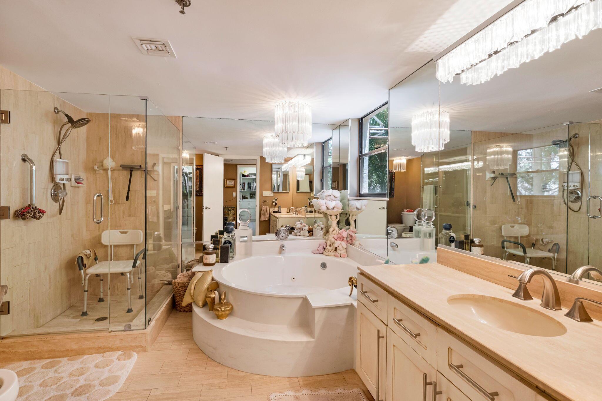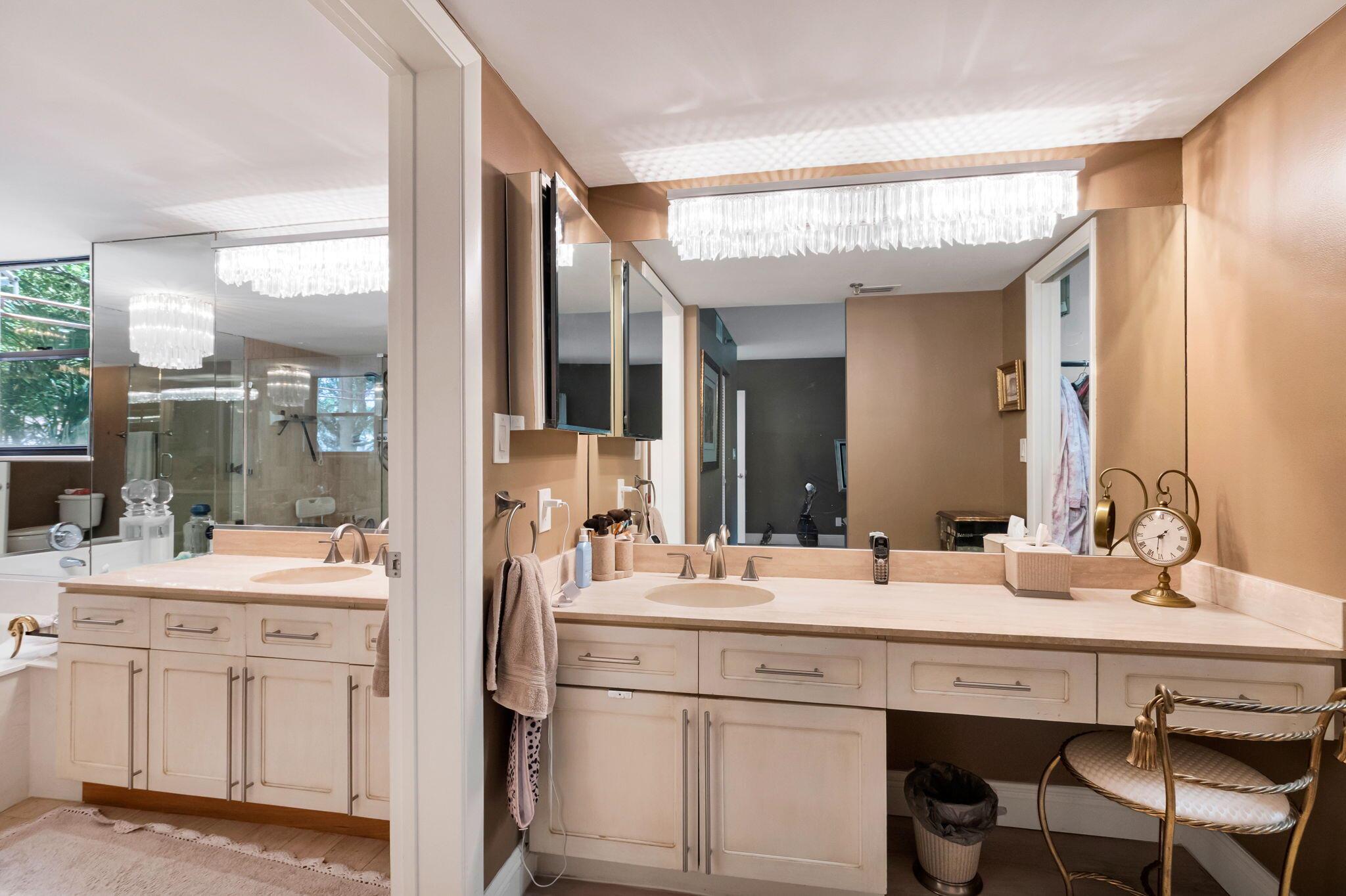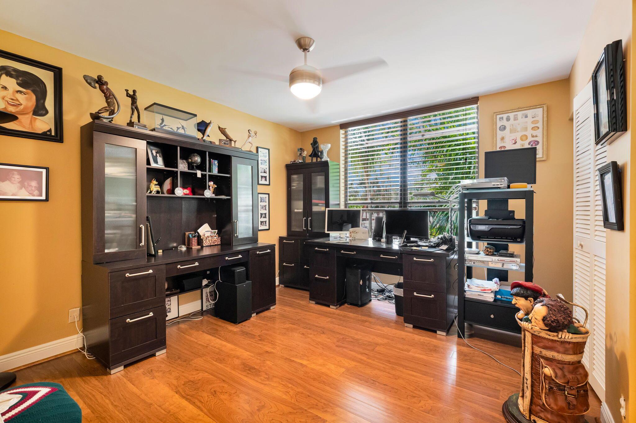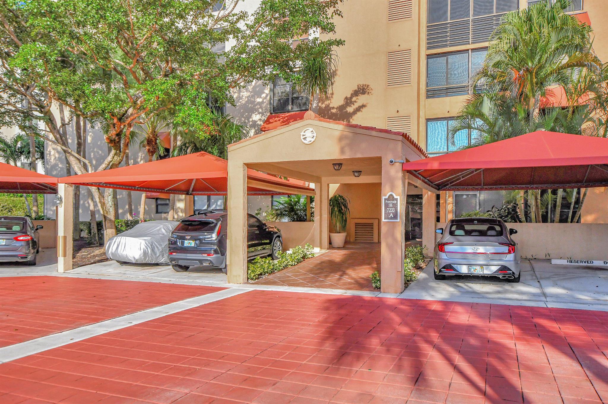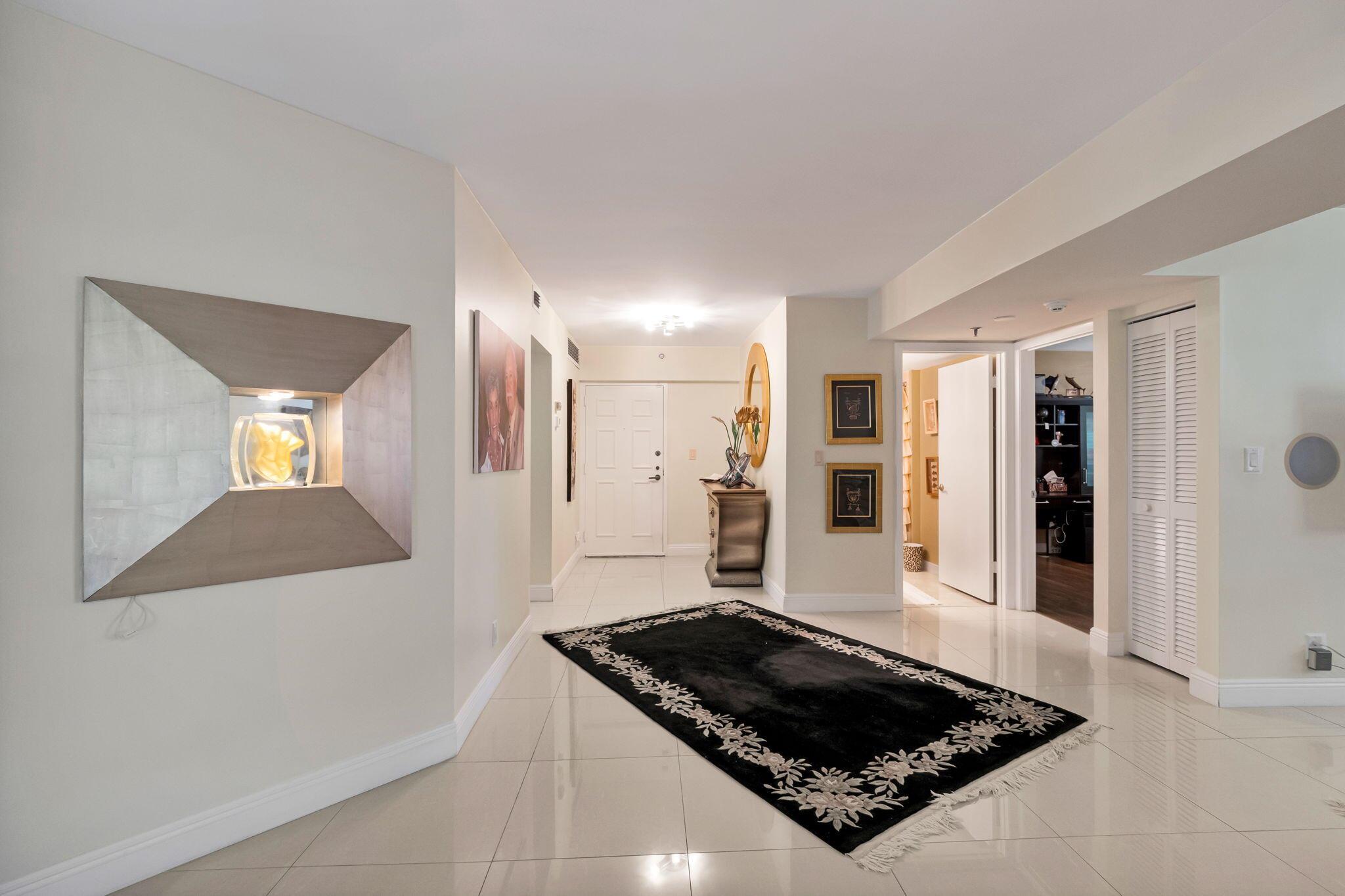 Spacious condo with over 2,400 sq. ft., plus a large glass-enclosed wraparound patio! 3rd bedroom currently used as open den. Serene garden views with golf course in the distance. Main living areas feature large neutral tile flooring, 2nd bedroom has wood floors and master bedroom has laminate flooring. Kitchen boasts granite countertops, stainless steel appliances, pass-through to the living room, and storage closet. Separate laundry room has front-loading washer and dryer plus sink. Living room features a built-in bar and formal dining area. Smooth ceilings throughout. Powder room updated with cabinet and glass bowl sink. Master suite includes double-sinks, separate tub and shower with updated glass enclosure. Close, covered parking spot and second-level cabana by community pool.