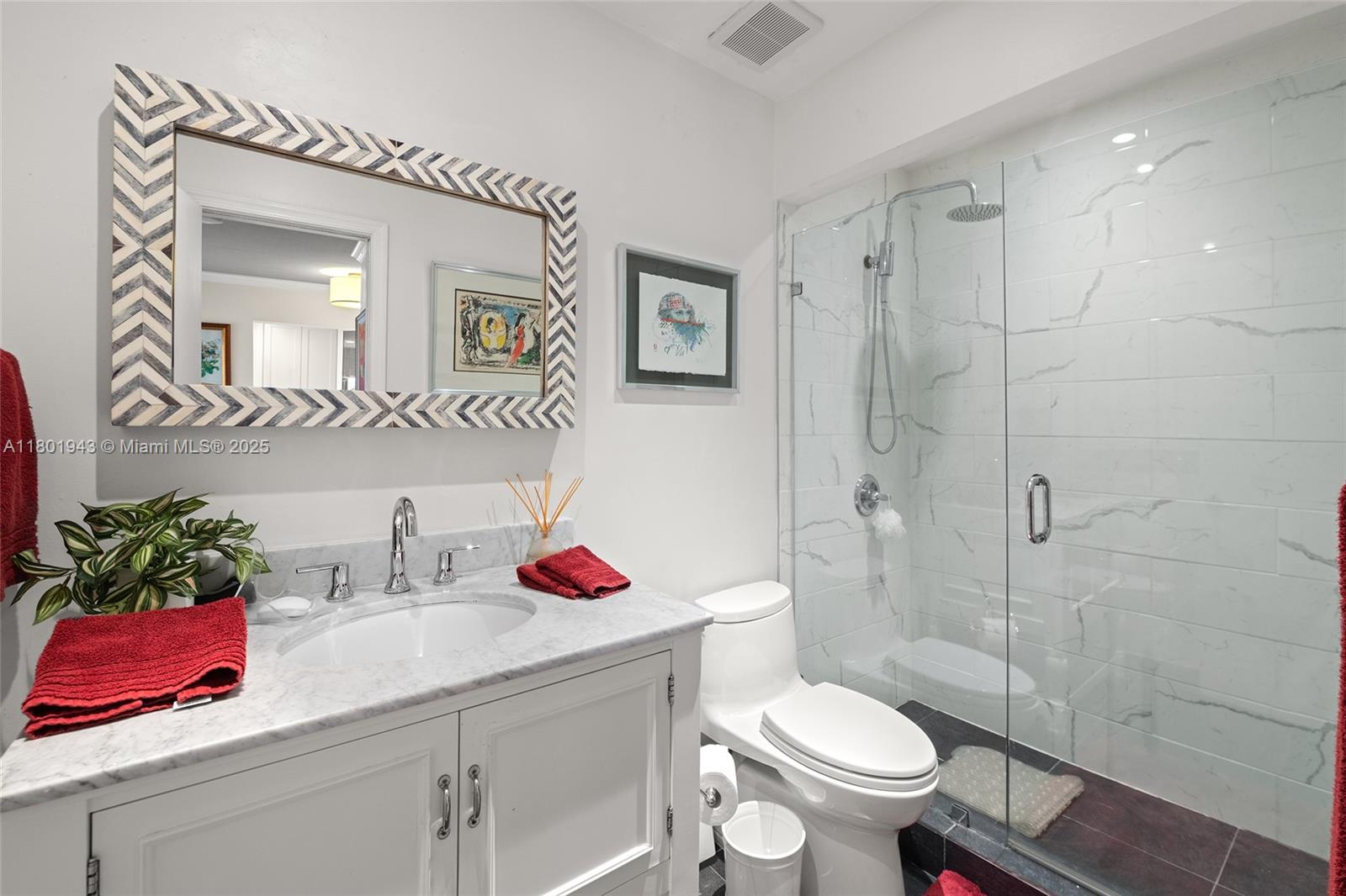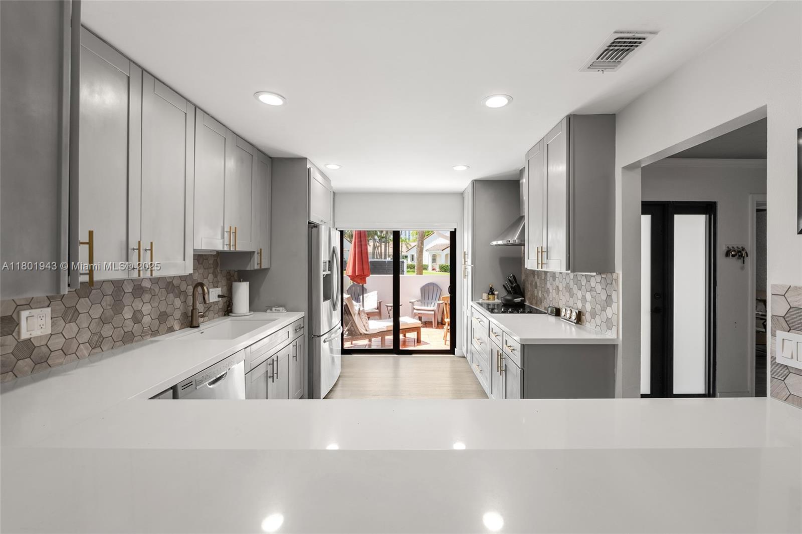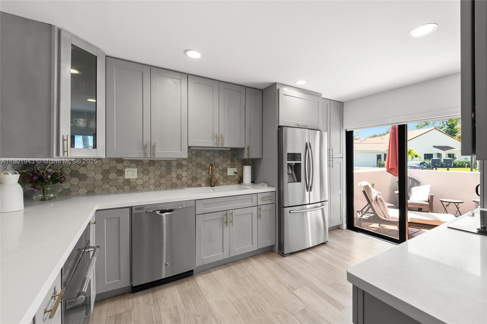Beautiful one-story residence, completely renovated, features an open floor plan and high ceilings. Large living and dining area with screened in Florida room. Dream kitchen with custom cabinetry overlooking patio courtyard. Huge primary suite with generous closet space, and renovated bathroom with skylight. Split plan second bedroom, full guest bathroom, and large laundry room with storage. Plus garage conversion to a flex room: den/extra guestroom/playroom. 2 parking spaces in private driveways plus additional guest parking. Unique one-story villa-condo community steps to the Waterways shops, close to Don Sofer High School, Aventura Mall, Brightline trains to Miami and Fort Laud. Guard gated community, well-managed with reserves. Community has a lovely pool area. Pet friendly.