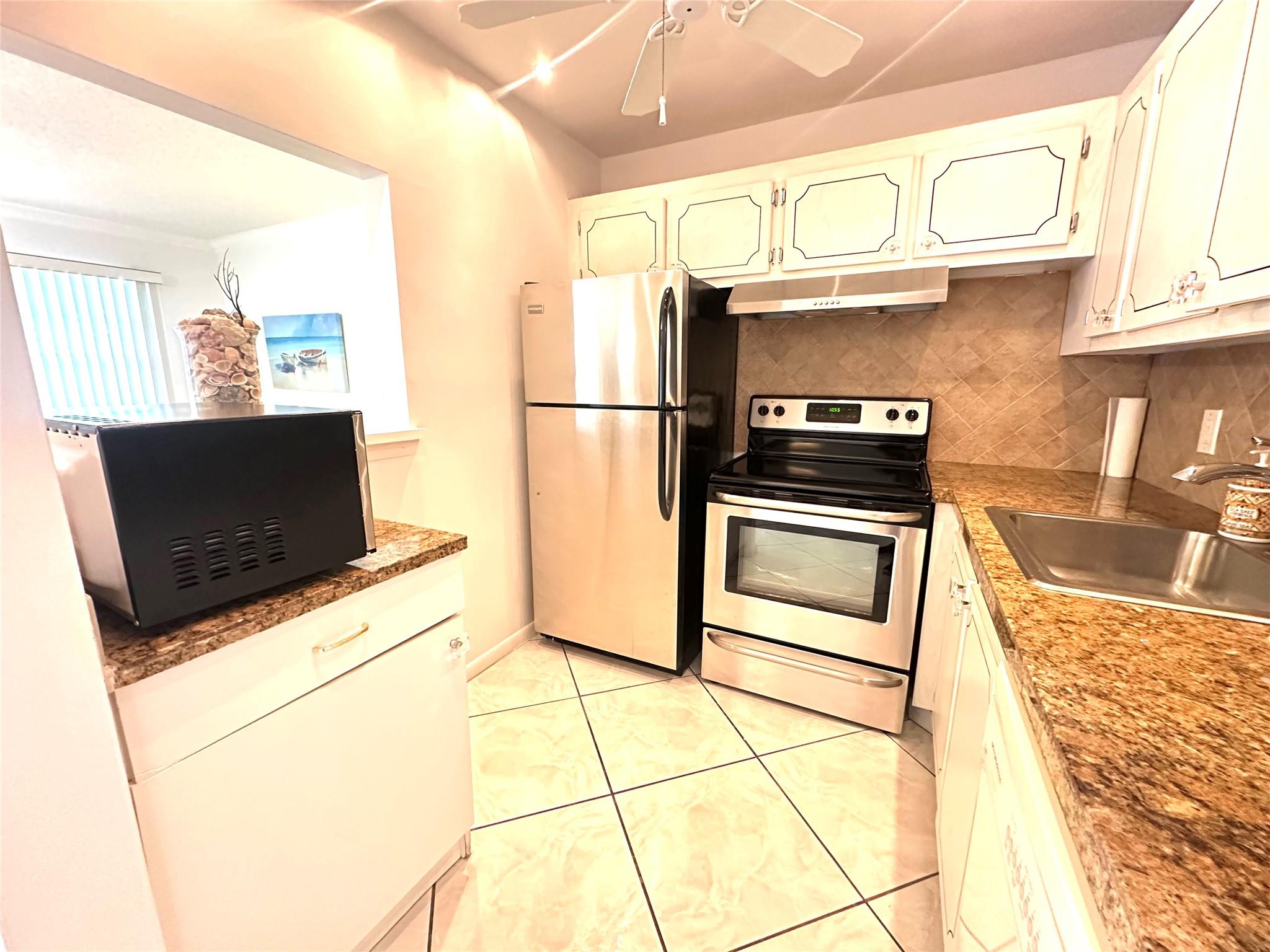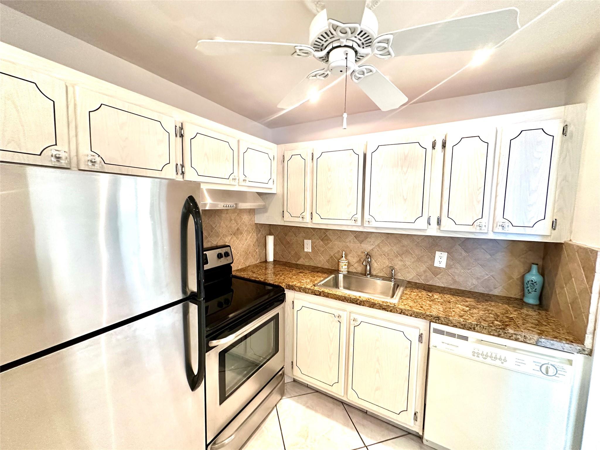 GORGEOUS LAKE VIEW! This 1 bedroom, 1.5 bath condo on the 1ST FLOOR is FULLY FURNISHED & ready to move right in! Just steps to the pool, pkg. rt in front & next to laundry.. it doesn't get better than THIS! Many upgrades incl. hurricane impact front dr, granite cntr tops & dishwasher in kit, Ceramic tile flrs front to back & remodeled primary bath w/glass shower drs & tile walls. Enjoy amazing sunsets from your encl patio w/sliding glass windows & exit door to the beautiful water view w/fountain! 5 Star Clubhouse w/fitness cntr, 2.5 walking/jogging path under the trees, clubs, classes, pools, tennis, pickleball, shuffleboard, putting green, free transportation, 24 hr sec & much more. Close to fabulous shopping, restaurants & 10 min to the beach! YOU WILL LOVE LIVING HERE! Assoc. Claims 55+