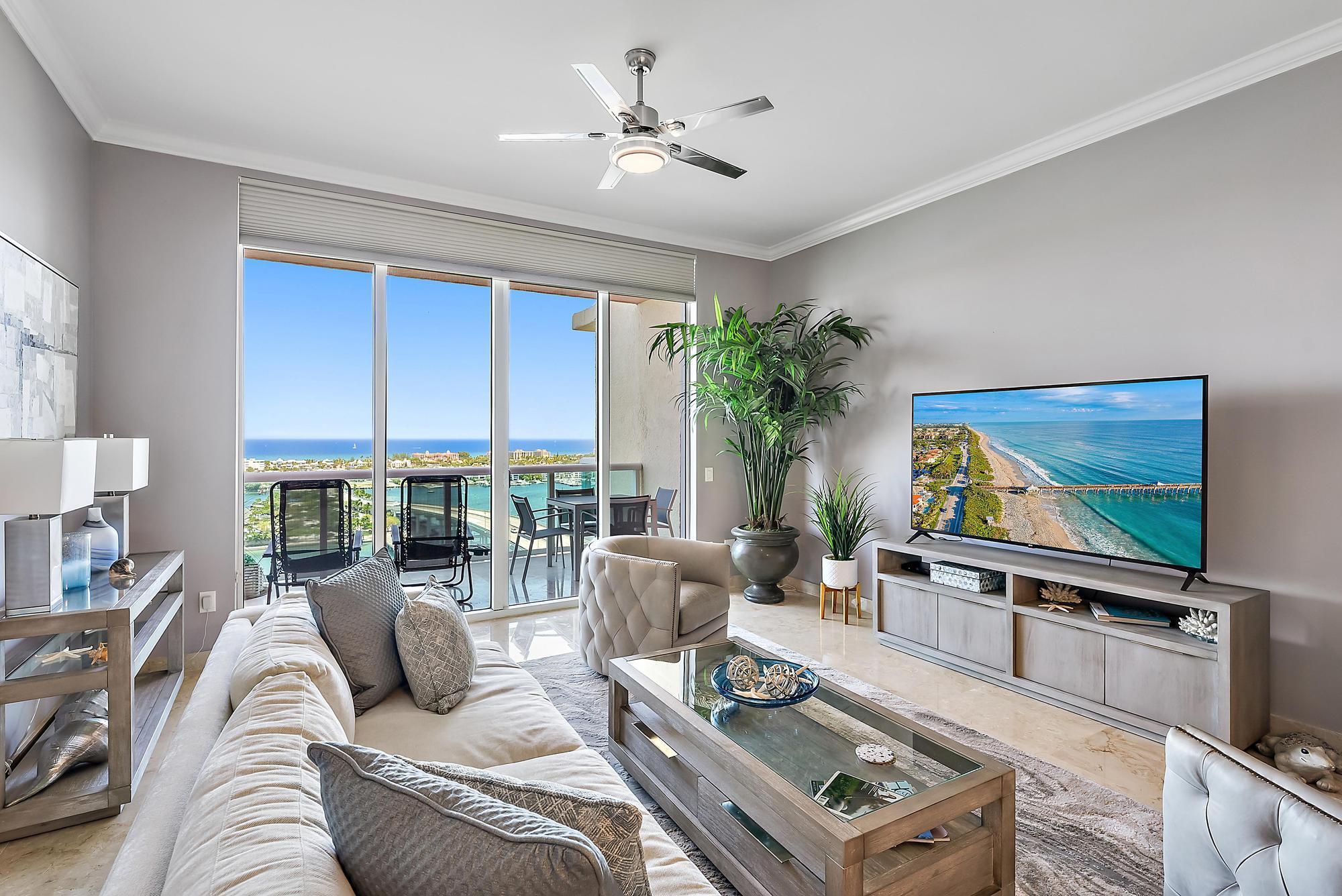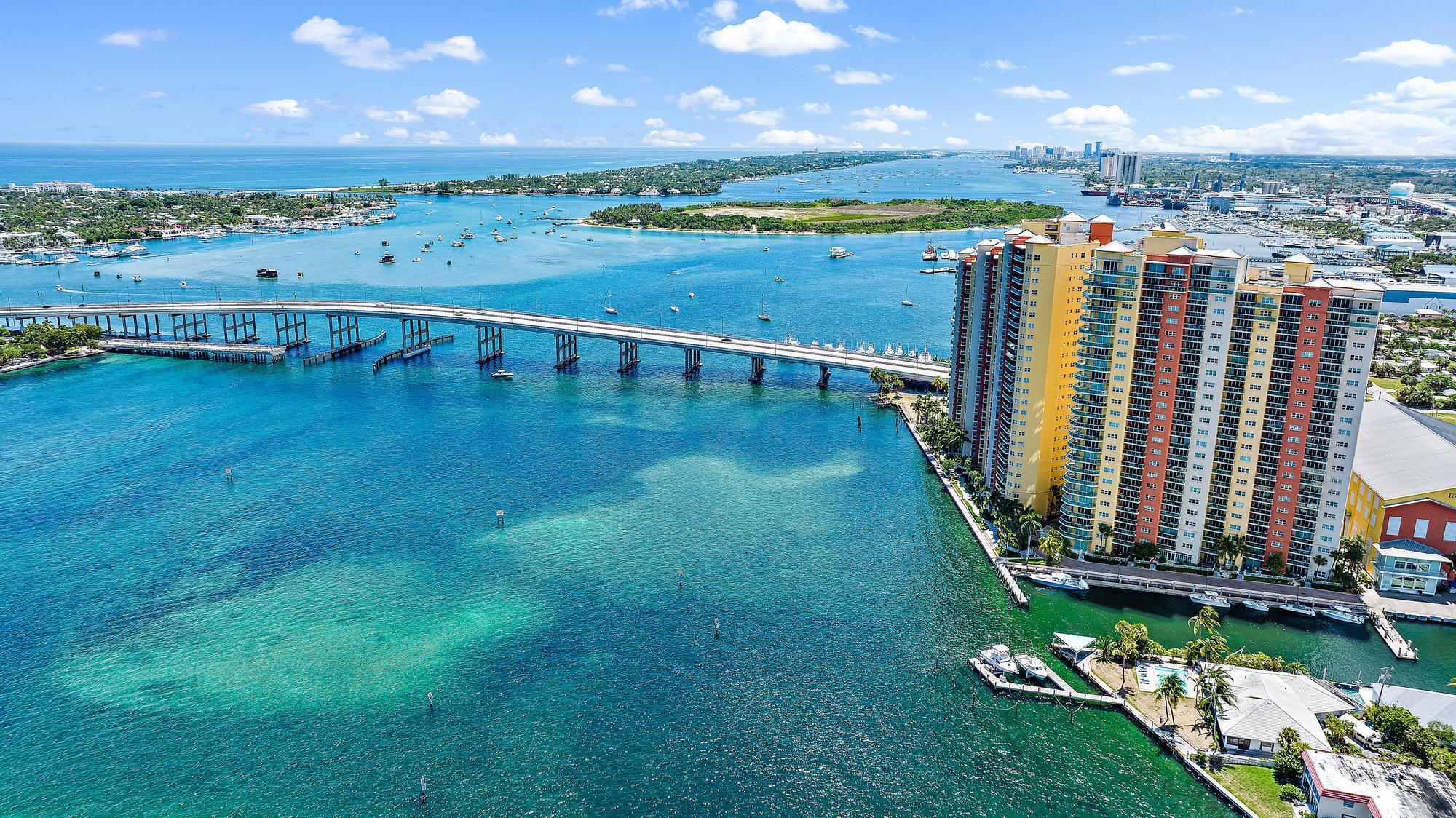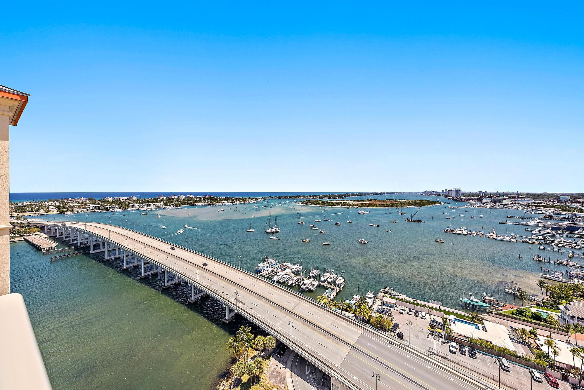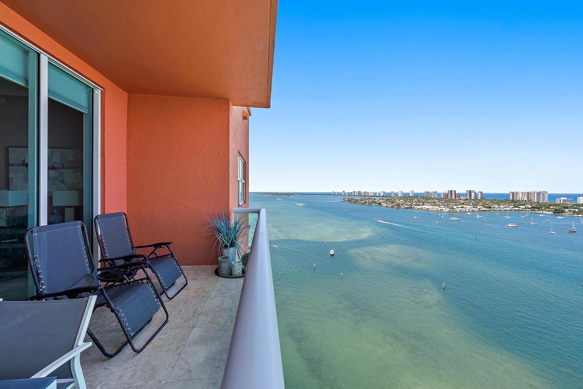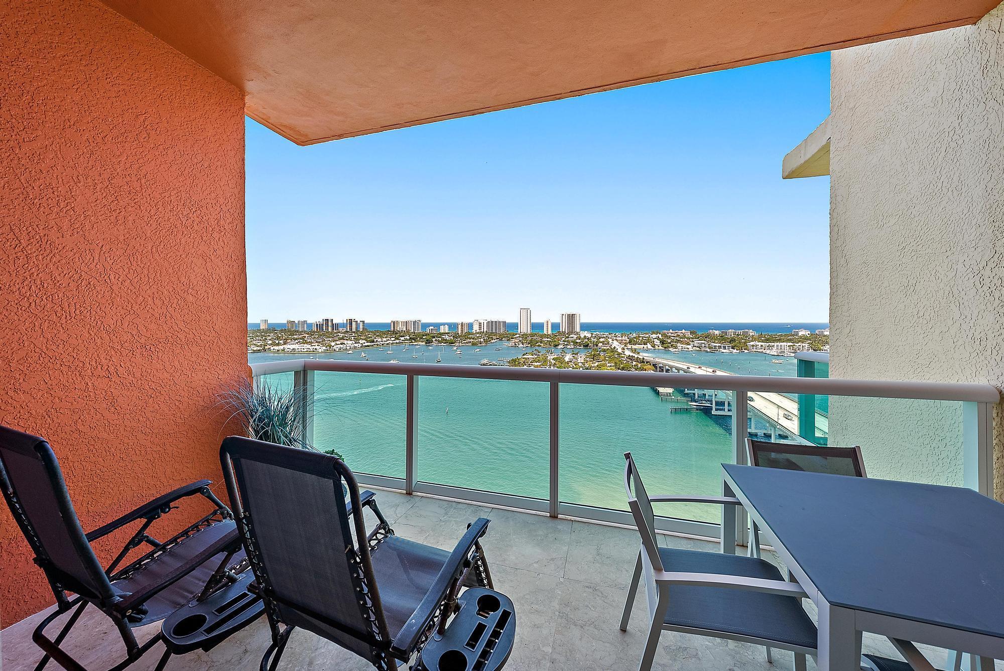 Discover luxury living at the Marina Grande Ocean Tower. This PENTHOUSE condo boasts 2 bedrooms, 2.5 bathrooms, and 1,637 square feet of open living space, featuring Italian marble floors, HIGH CEILINGS WITH SKYLIGHTS, and panoramic views of the Intracoastal, Atlantic Ocean and Singer Island.The spacious PRIVATE BALCONY is perfect for relaxing or entertaining. The gourmet kitchen is equipped with granite countertops, and stainless steel appliances. The master suite offers dual sinks, a jet tub, and separate walk-in closets. Impact-resistant windows and doors ensure peace of mind. This turn key unit is move-in ready, as it will come completely furnished upon request. Enjoy resort style amenities including a newly renovated roof top pool, jacuzzi, fitness center, tennis/ pickle ball court