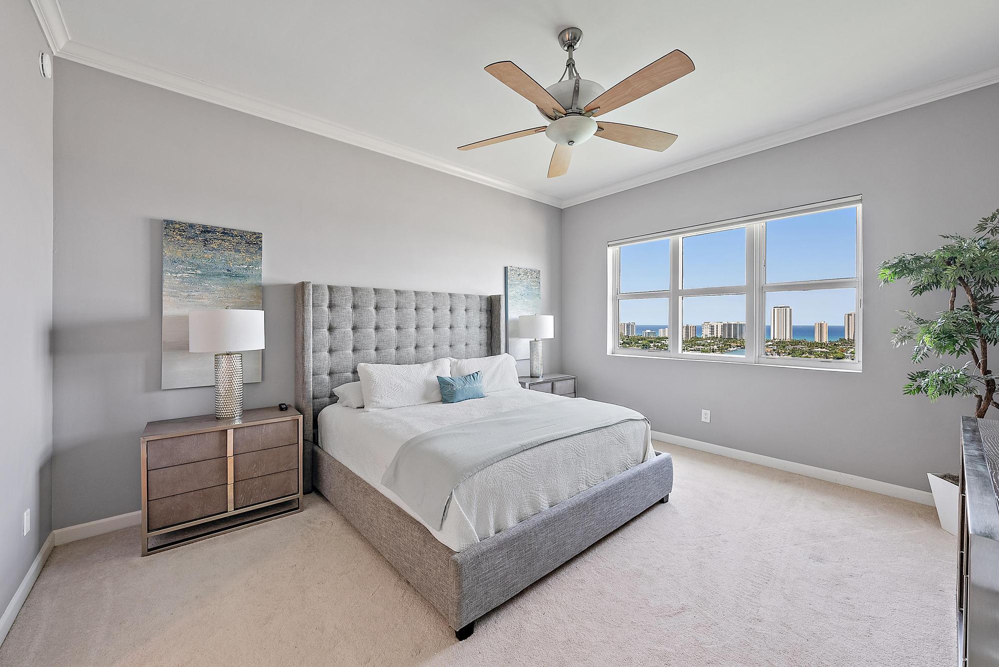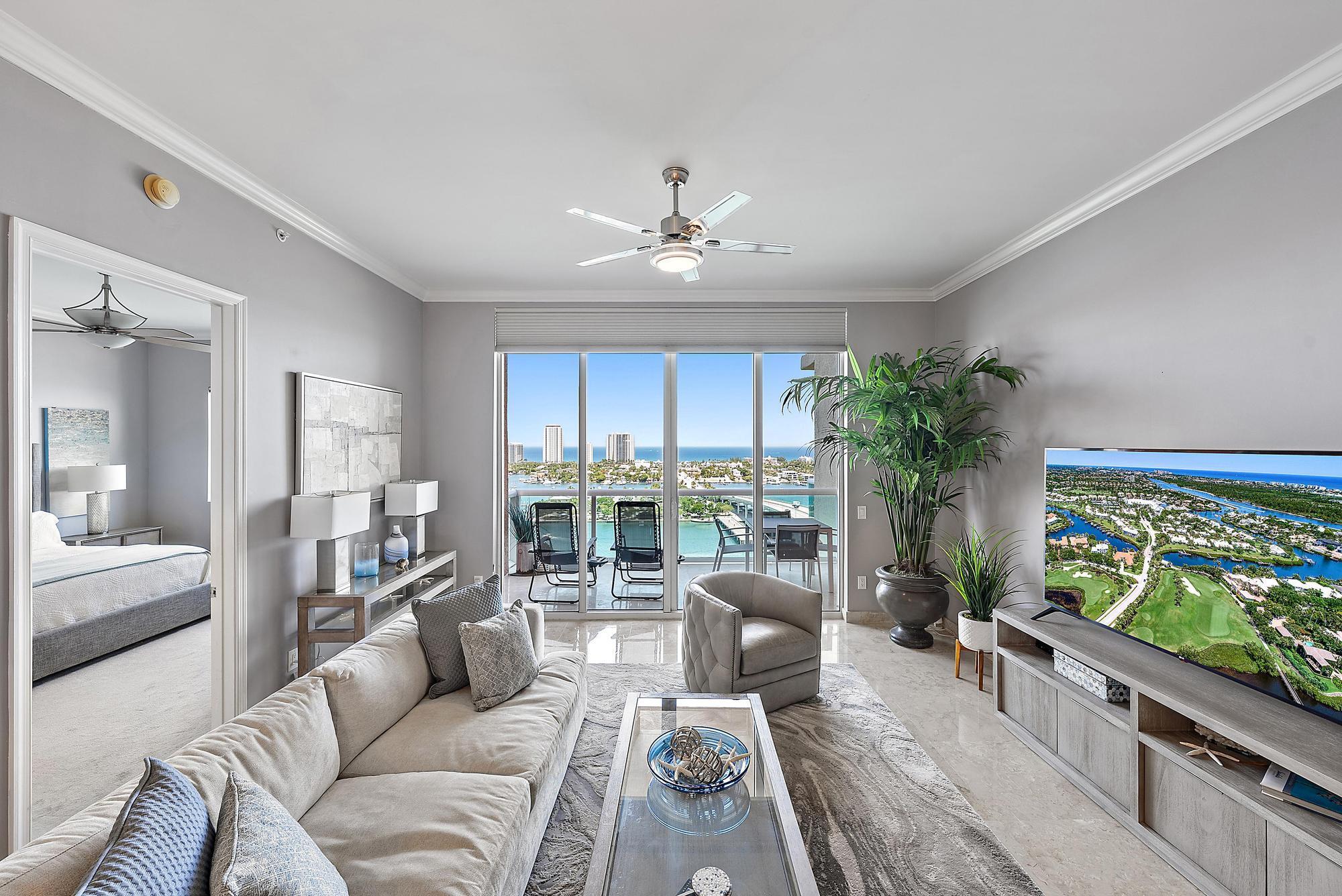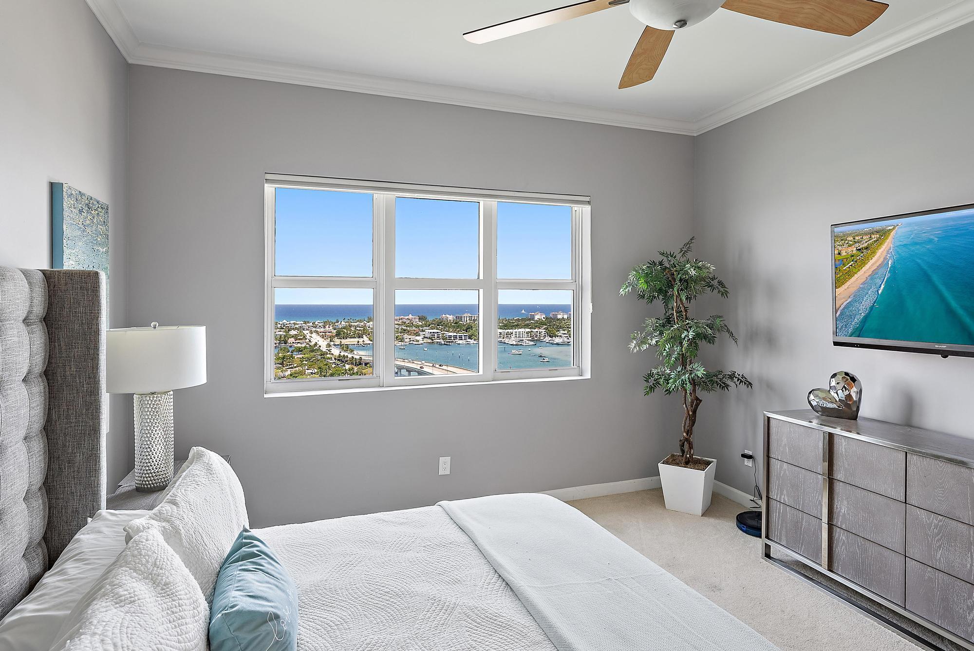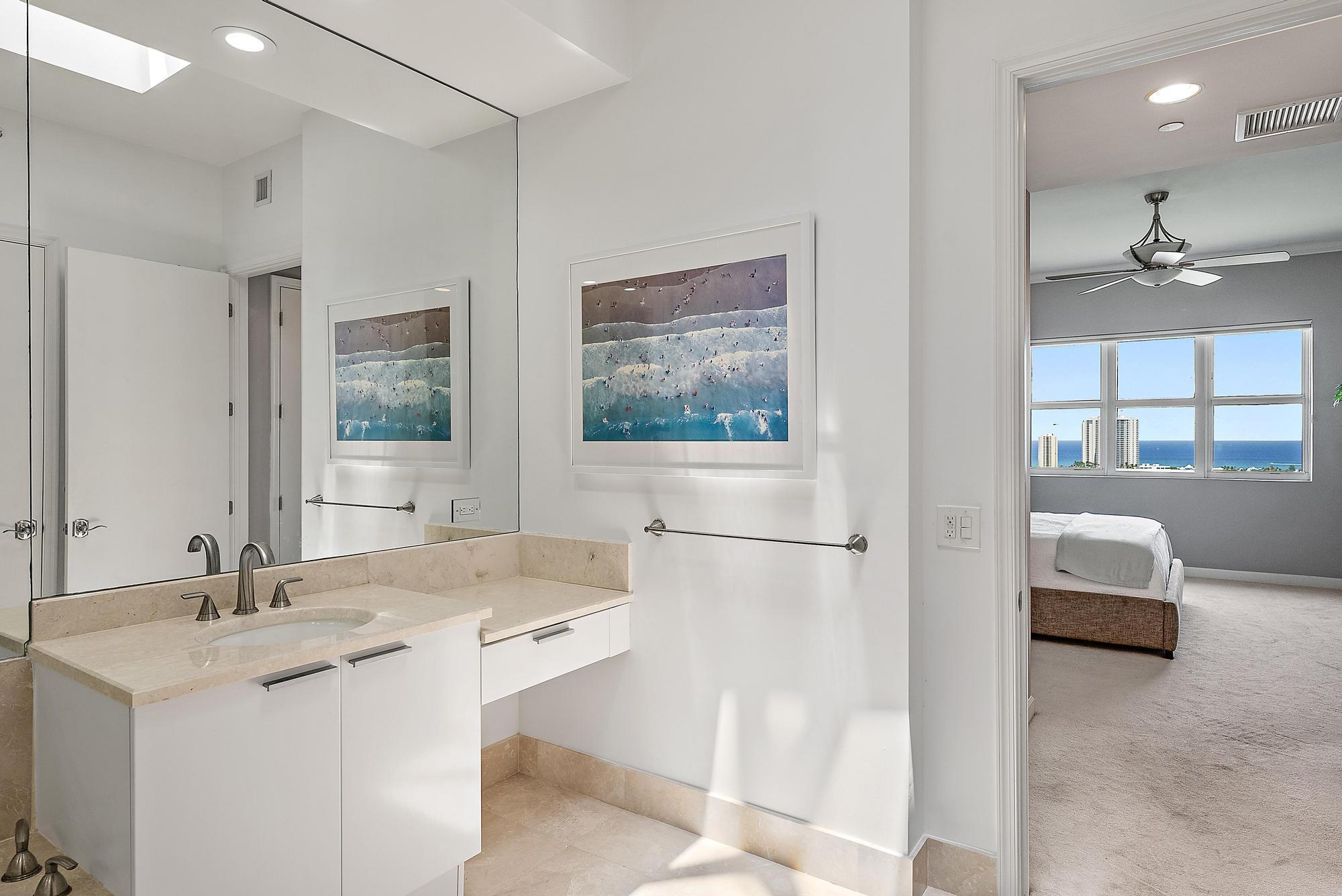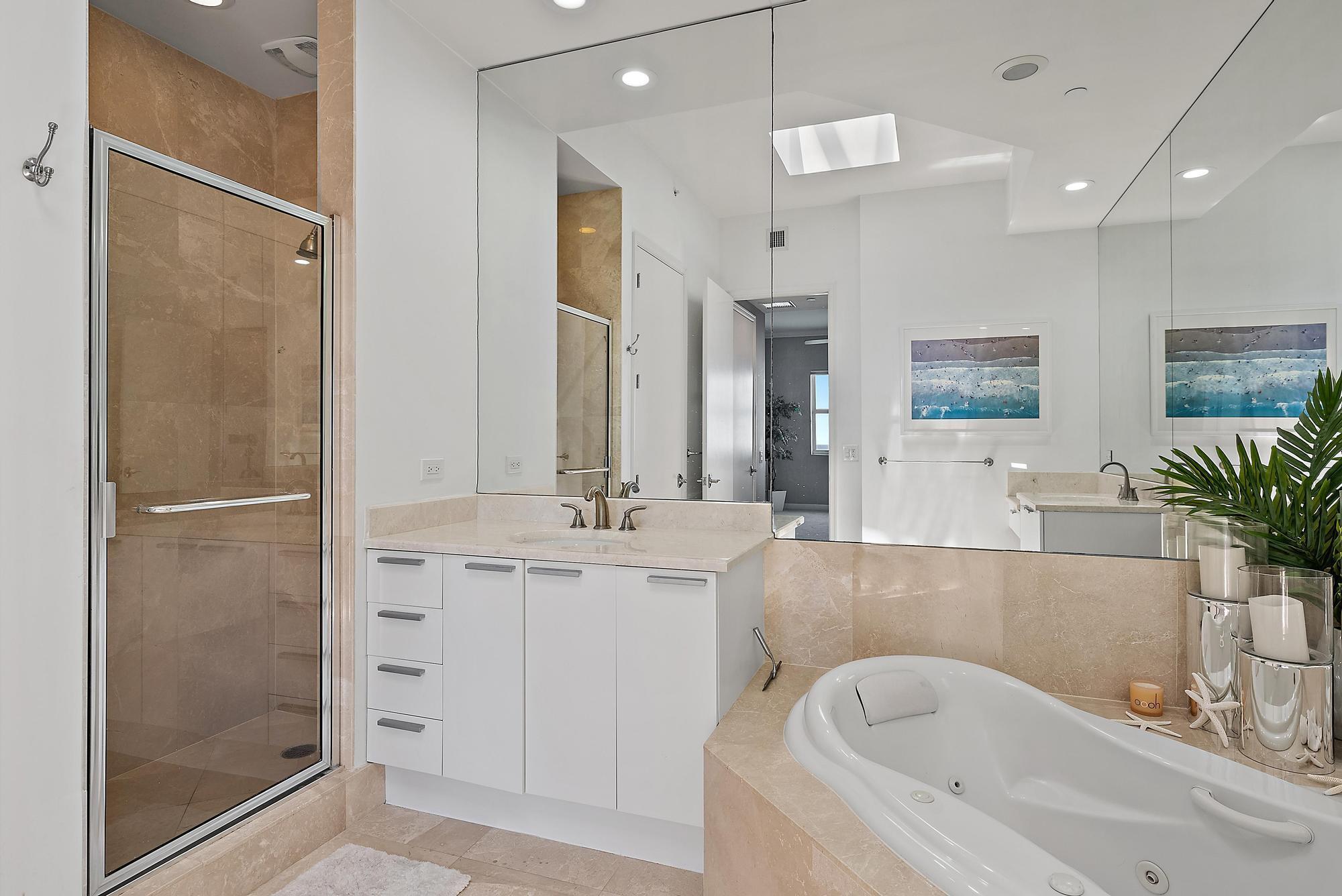 Discover luxury living at the Marina Grande Ocean Tower. This PENTHOUSE condo boasts 2 bedrooms, 2.5 bathrooms, and 1,637 square feet of open living space, featuring Italian marble floors, HIGH CEILINGS WITH SKYLIGHTS, and panoramic views of the Intracoastal, Atlantic Ocean and Singer Island.The spacious PRIVATE BALCONY is perfect for relaxing or entertaining. The gourmet kitchen is equipped with granite countertops, and stainless steel appliances. The master suite offers dual sinks, a jet tub, and separate walk-in closets. Impact-resistant windows and doors ensure peace of mind. This turn key unit is move-in ready, as it will come completely furnished upon request. Enjoy resort style amenities including a newly renovated roof top pool, jacuzzi, fitness center, tennis/ pickle ball court