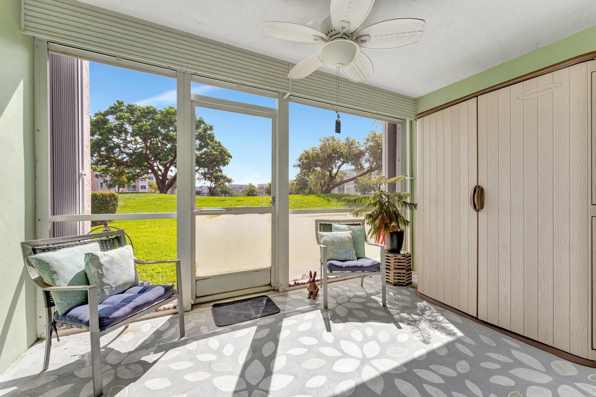 Welcome to your dream retirement home in the heart of Sunrise Lakes! This rarely available first-floor corner unit on the golf course is a spacious 3-bedroom, 2-bathroom home. It offers first-floor convenience, golf course views from your private patio, reserved parking just steps from your front door, and plenty of natural light. Both bathrooms have been remodled. Washer and dryer in the unit! Maintenance includes water, sewer, garbage, and internet. Golf is $10 a year. The recreation fee covers 5 pools, activity centers, a gym, theater, and golf course maint.