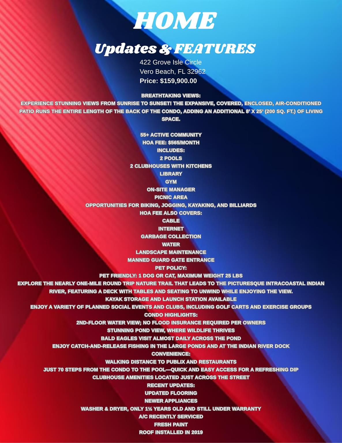 HUGE REDUCTION! NOW $159,900! Best Pond View in the Community! Welcome to this 2nd-floor gem in a vibrant 55+ community where nature, comfort, and convenience meet. Enjoy breathtaking pond views and frequent bald eagle sightings. Cast a line for catch-and-release fishing or relax at the private Indian River deck, perfect for sunrise coffee or sunset reflections.The HOA ($565/month) covers nearly everything--cable, internet, water, garbage, landscaping, guard gate, plus amenities: two pools, two clubhouses, library, gym, picnic areas, biking, jogging, billiards, kayaking, and endless social events. Best of all, you will love the enclosed 8' x 25' panoramic view patio that adds 200 sq ft, bringing your total air-conditioned space to 1,113 sq ft--your sanctuary for sunrise-to-sunset views.