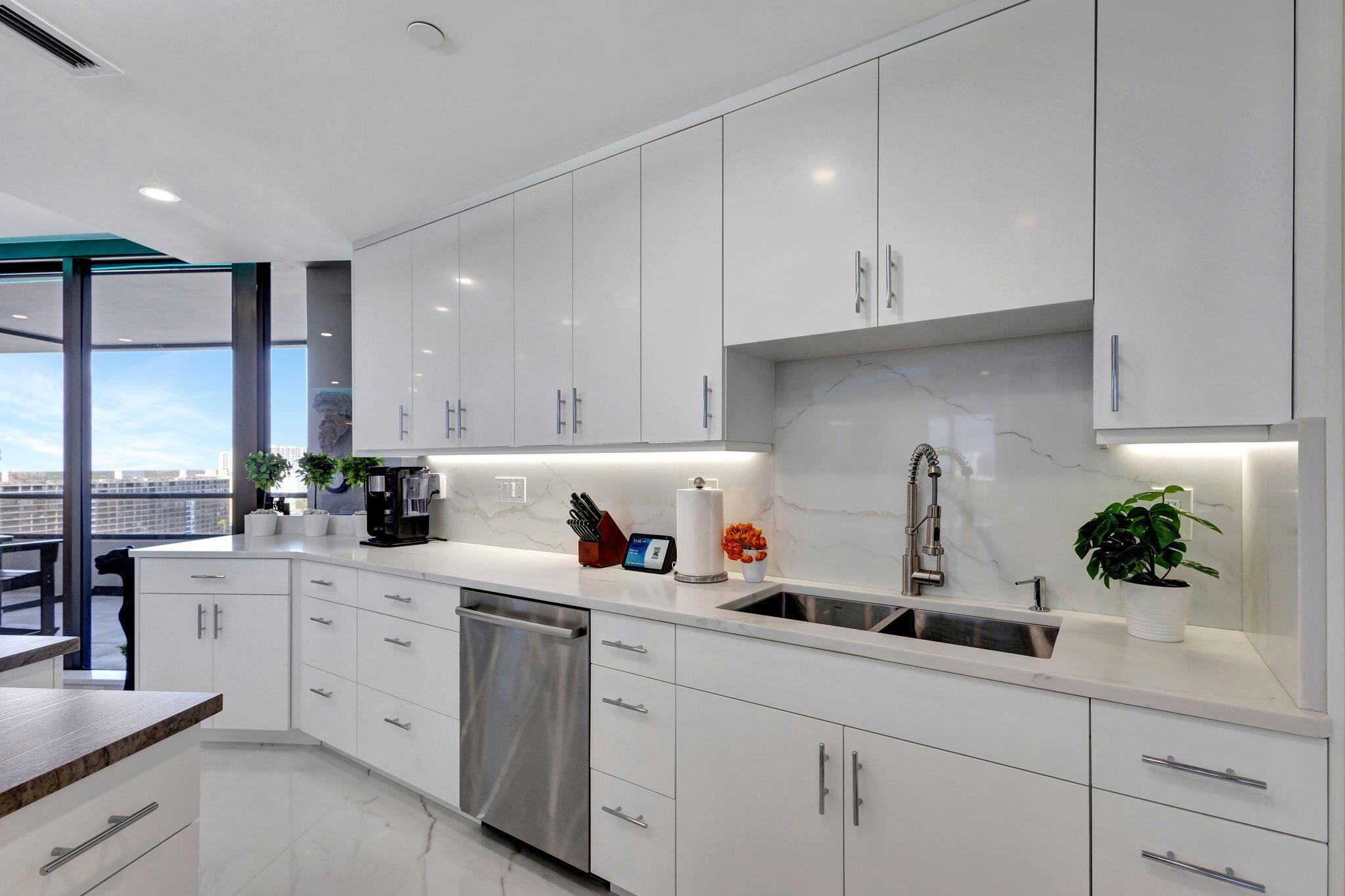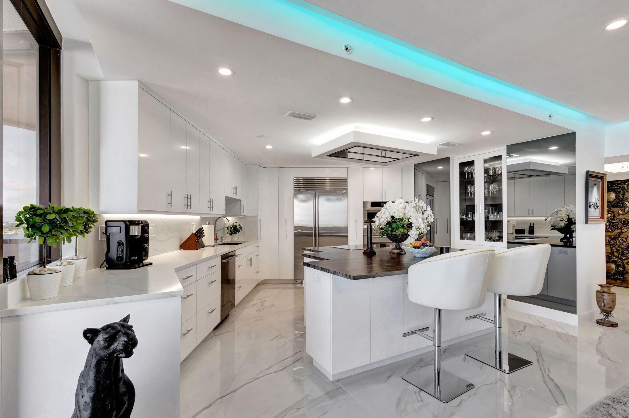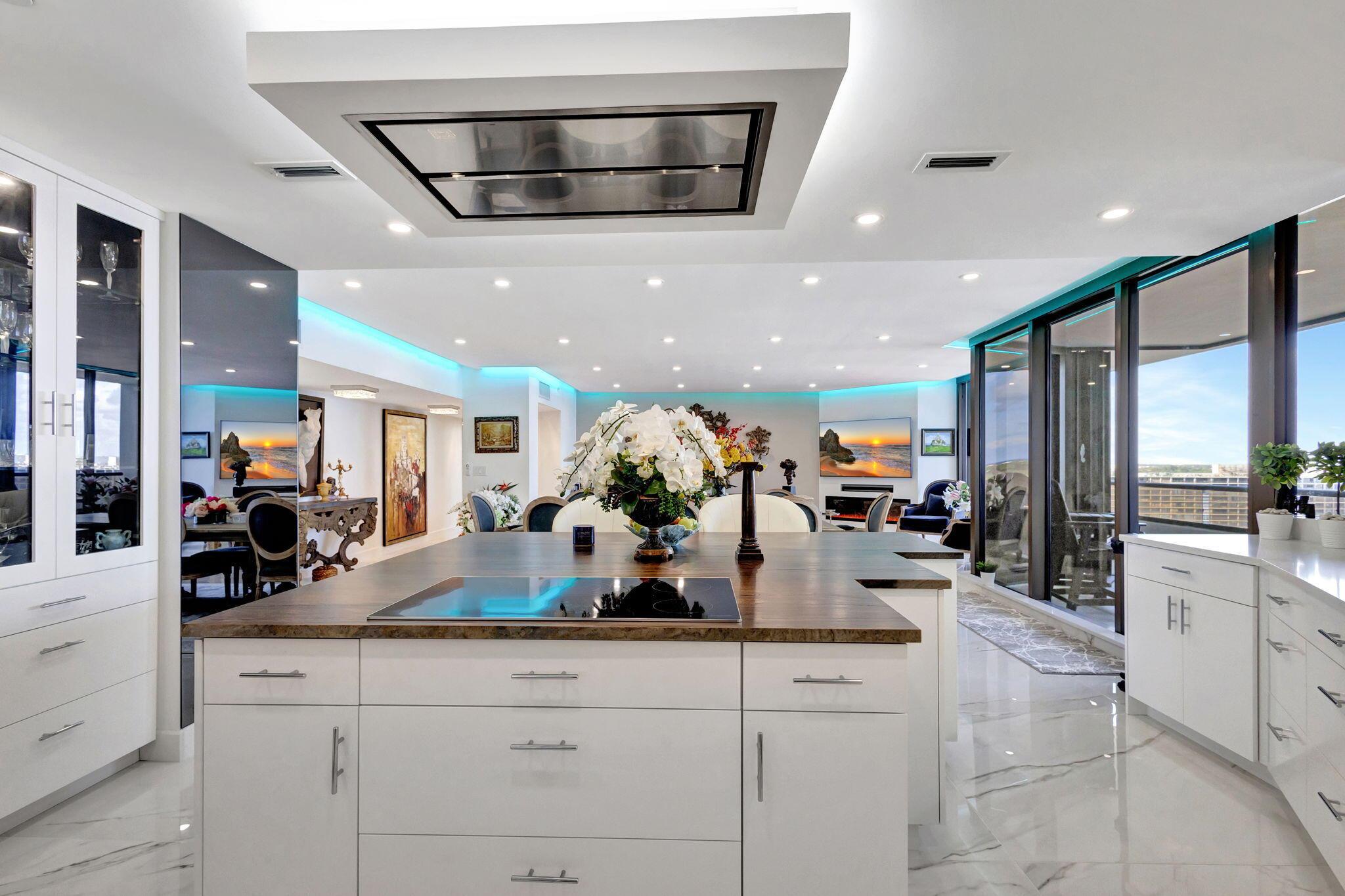 Welcome to Luxury living in Lake Point Tower. This stunning 2 bedroom, 2.5 bath condo offers breathtaking marina, intracoastal and ocean views. The north facing exposure is truly exceptional, offering year-round enjoyment without the need to shield your windows and obstruct the view. Enjoy a comfortably cool interior thanks to the desirable positioning of this condo, with reduced direct sun exposure creating a naturally temperate living space. Thoughtfully designed recessed LED lighting on dimmers brightens the home as needed, offering both energy efficiency and ambiance. The living room features custom cove lighting with over 2,000 color options, allowing you to set the perfect mood for any occasion. A sleek electric heater is integrated into a one-of-a-kind diagonally built accent wall,