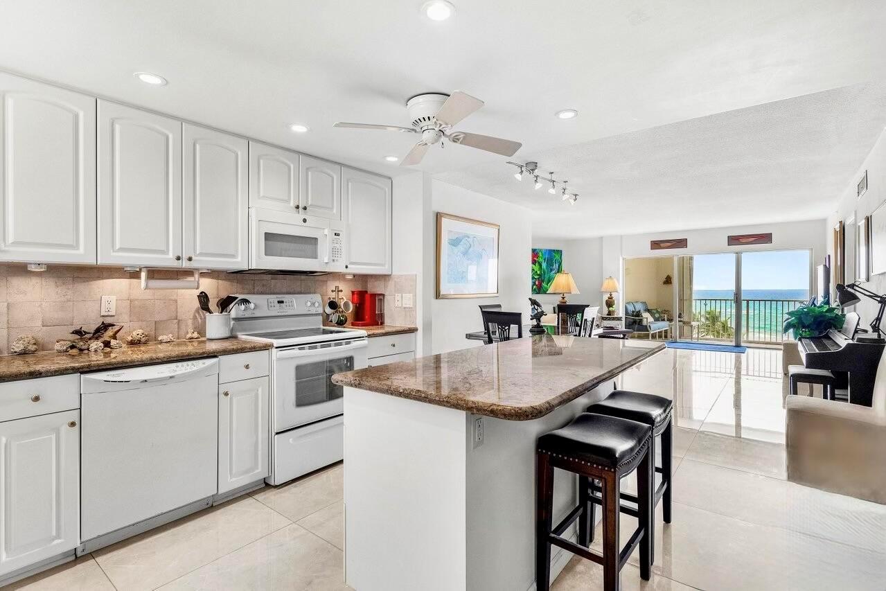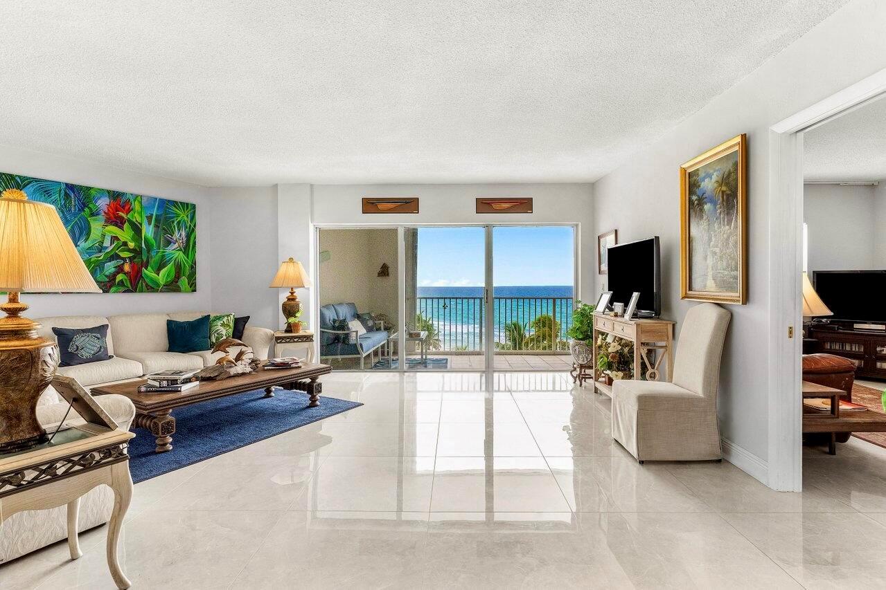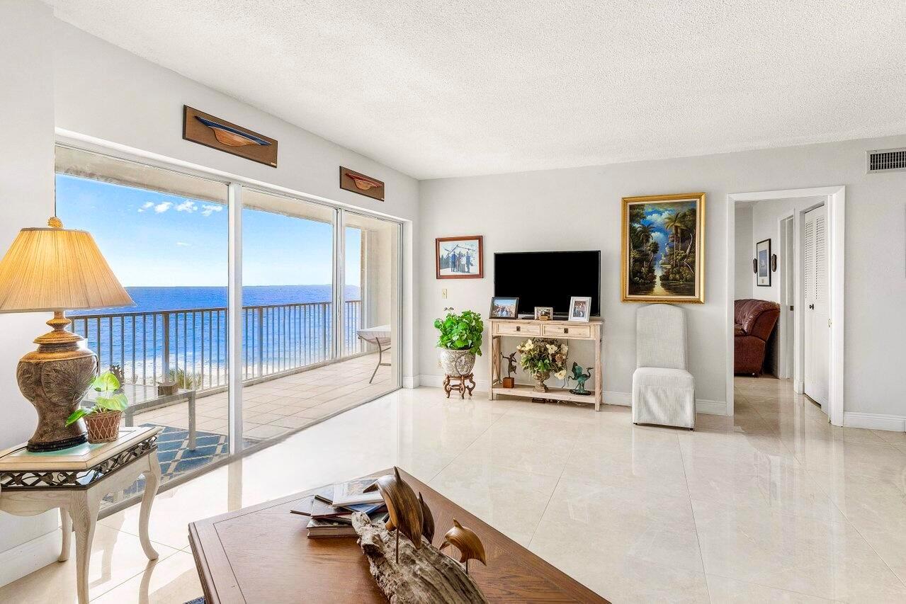 WOW! NEWLY-PRICED TO SELL! Penthouse Towers has only two available of the largest ''elbow'' residences and this two-bedroom, two-bath is the highest on Floor 7! It also boasts a desirable SE location, right ON THE SAND with 400 feet of ''private beach'' offering uninterrupted views of the ocean -- amazing sunrises, magical moonrises and fabulous winter season breezes! Spacious living areas feature new porcelain-marble flooring throughout, exquisite OPEN KITCHEN complete with center island, impact glass door and windows (south side) as well as accordion shutters on the 26'x8' covered dining balcony with storage closet. A warm, community atmosphere includes countless amenities for its friendly active residents to enjoy in addition to many scheduled social events throughout the year!