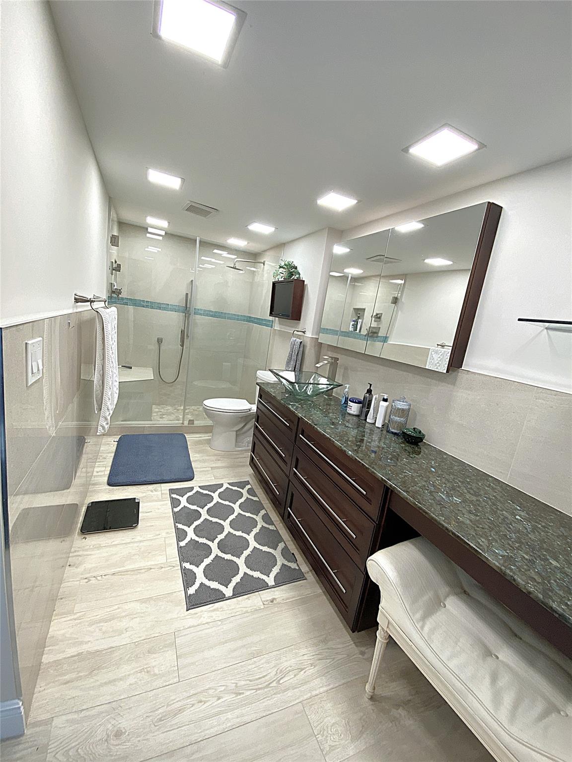 Cozy upgraded condo in the sought-after gated community of Lands of the President offers excellent views of the Banyan Cay Jack Nicklaus Signature Golf Course, downtown WPB & lakes. This open concept features modern kitchen, granite countertop, wood cabinet, SS appliances, LED lights, Wash/Dryer, & built-in TV. Porcelain tiles throughout. Newer AC, hurricane shutters & floor-to-ceiling sliding doors. Each bedroom has a bathroom. A storage room outside of the unit and 2 assigned parking spots. Building offers a saltwater pool, fitness center, party room, library & kitchen. Conveniently located near the Tanger Outlet Mall, Palm Beach International Airport, I-95, & beaches. Quarterly condo fee includes cable, internet, water, trash, amenities, exterior maintenance, landscaping, & insurance.