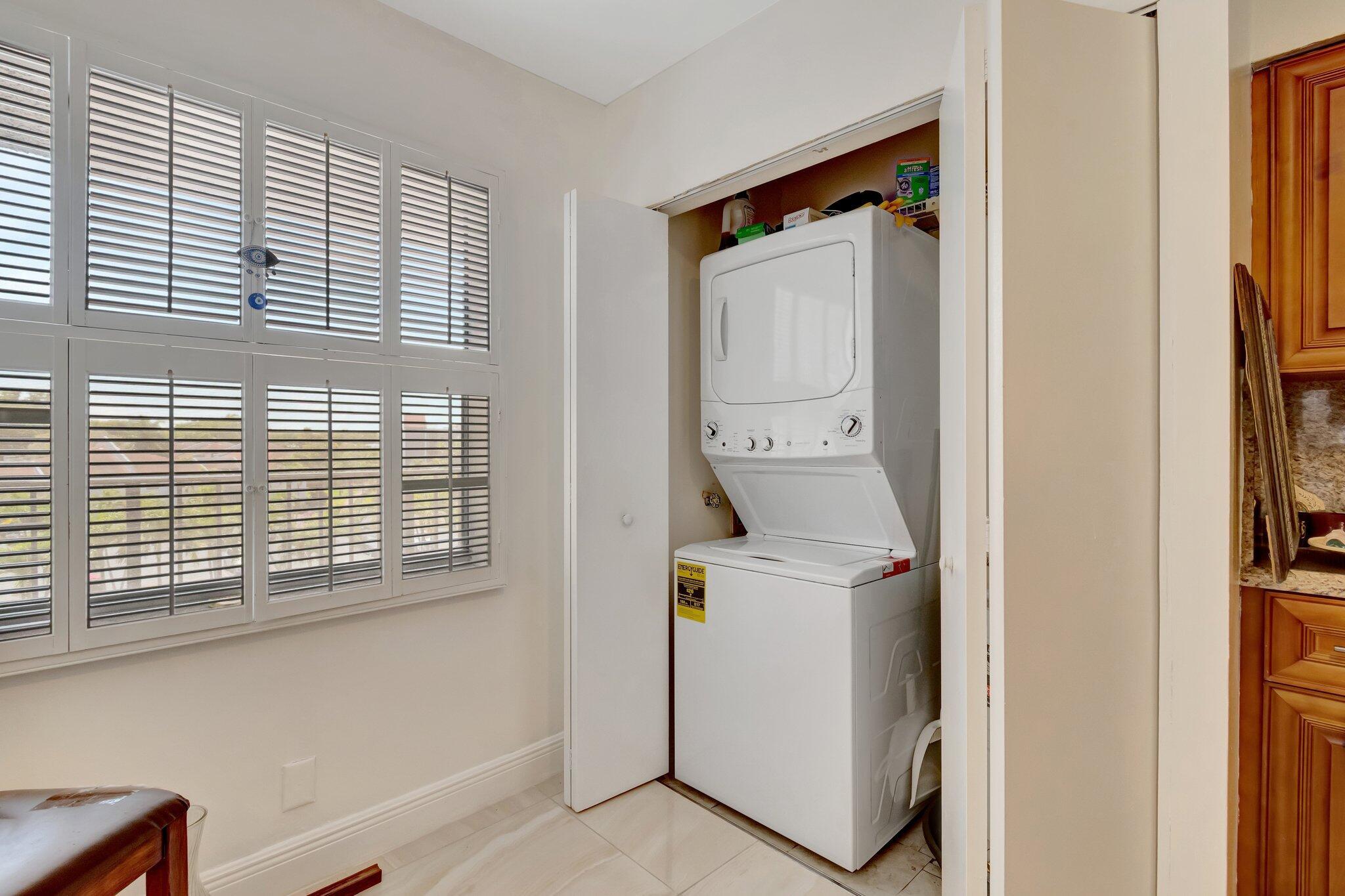 This 1 bedroom/ 2 bath condo is well maintained with tile throughout and a new kitchen with updated contemporary bathrooms. Washer and Dryer in unit. Serene lake view with fountain from the 4th floor. No 5th floor, as you are penthouse level with no-one above you. Elevator building (new elevator being installed this summer!) and a dedicated parking space and plenty of guest spaces. NEW STATE OF THE ART CLUBHOUSE with RESORT STYLE POOL and SPA. Gated Entry. Near Delray Market Place, Shops, Restaurants, Starbucks, Library, Glick's Kosher Market, Walk to Shul, Publix, Movies, Easy Turnpike access. Adult Community 55+.