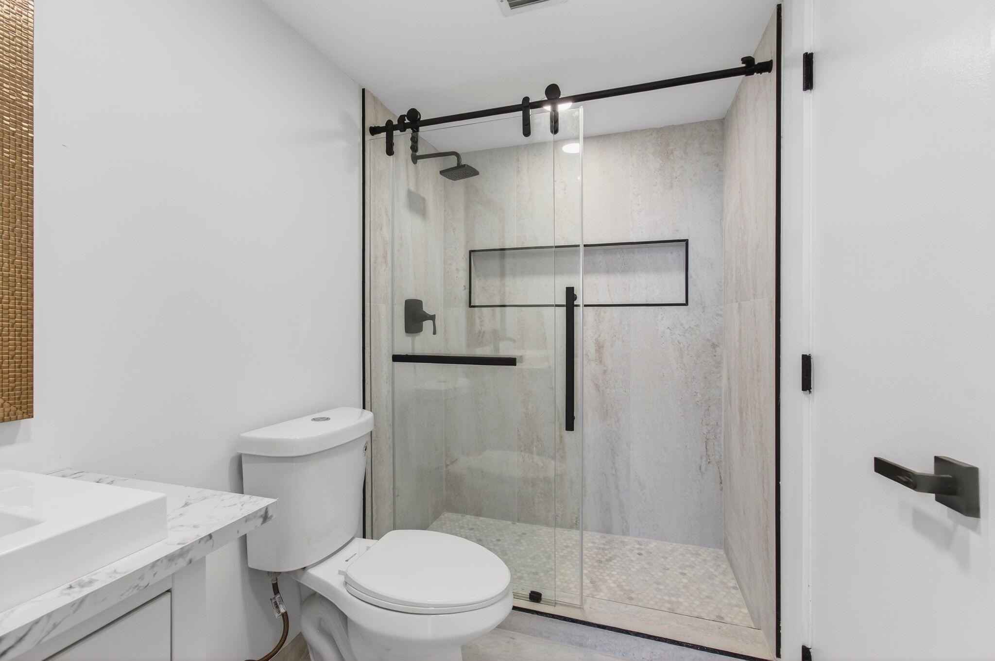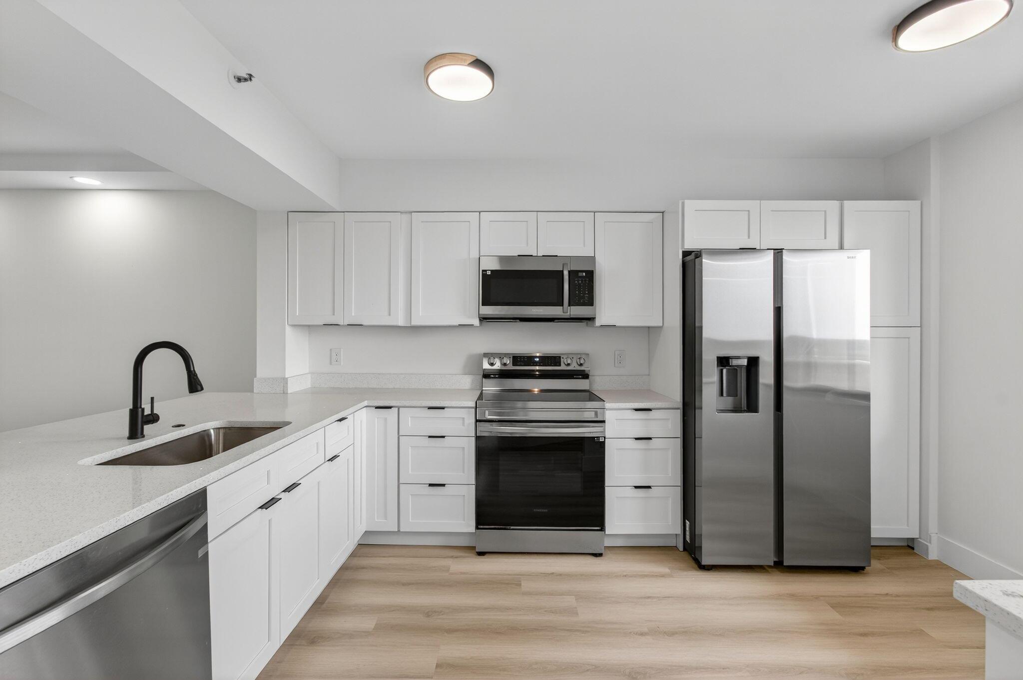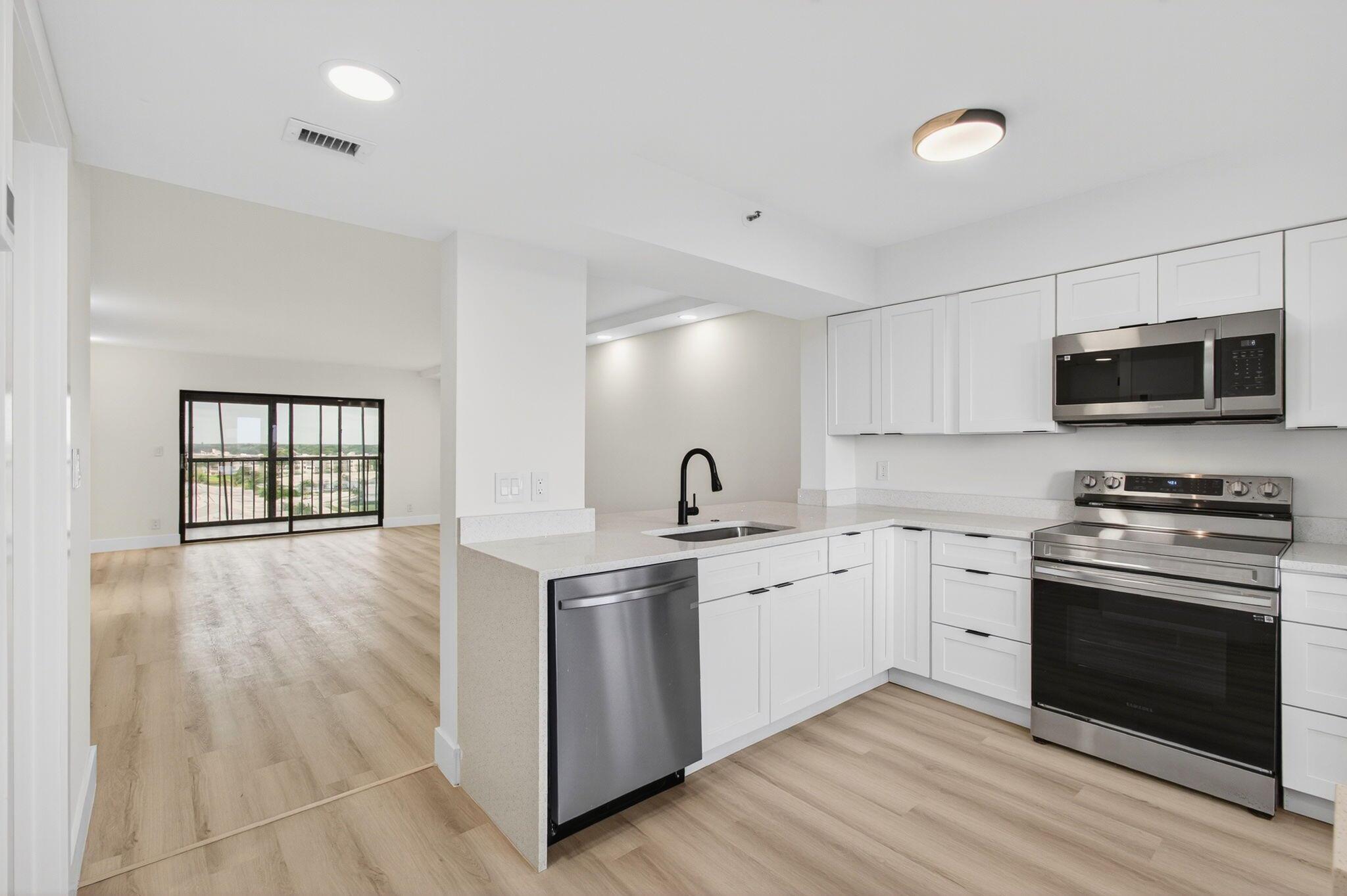 Discover the pinnacle of comfort and sophistication in this fully renovated 7th-floor condo ideally situated in the highly desirable, 55+ community of Huntington Lakes. Step inside and be greeted by an open and airy layout, complemented by abundant natural light and tasteful, modern finishes throughout. The enclosed balcony offers beautiful lake views and is perfect for year-round enjoyment. The thoughtfully designed open-concept kitchen features sleek white shaker cabinetry, quartz countertops, and stainless-steel appliances. A full-sized washer and dryer in the nearby laundry room adds to the convenience of this well-appointed unit. The condo offers two generously sized bedrooms, each with its own private ensuite bathroom, ensuring maximum comfort and privacy. The master suite is a true