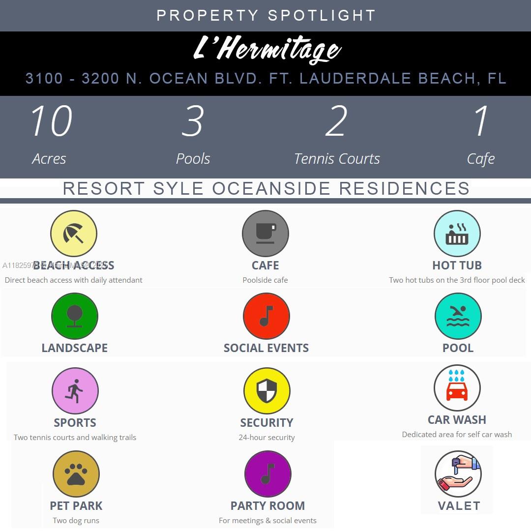 L'HERMITAGE OCEANFRONT RESIDENCE - THE PREMIERE BUILDING ON GALT MILE - Direct Ocean Views. Full-Service Luxury Building - Pet Friendly - Private gated 10 acre fenced complex with Security. Beautiful Marble floors inside and on balcony. NEW FULL-Impact Glass (2025) - 2 Beds 2 FULL Baths - balcony is accessible from EVERY room. Floor Plan Included in photos - Deeded parking spot with optional Valet. Large Storage unit included. Amazon Package Locker on-site. Dry Cleaning Service. Resort style living with two Gyms offering Wet and Dry Saunas - 2 massage rooms - bike storage - Poolside Restaurant & Bar - CLAY Tennis Courts - Concierge - Private Beach with chairs and Cabanas, Grilling area, two Pools with hot-tub - Car Wash area - Pet Park - Free guest Valet - Furniture negotiable. Monthly credit for cafe included in maintenance fees.