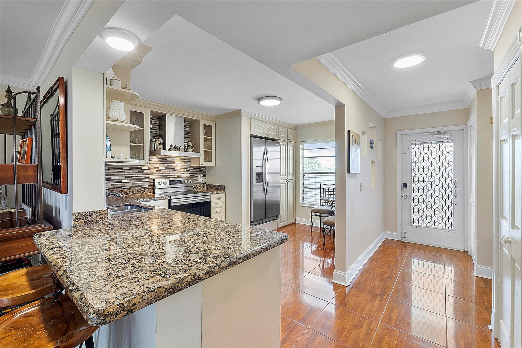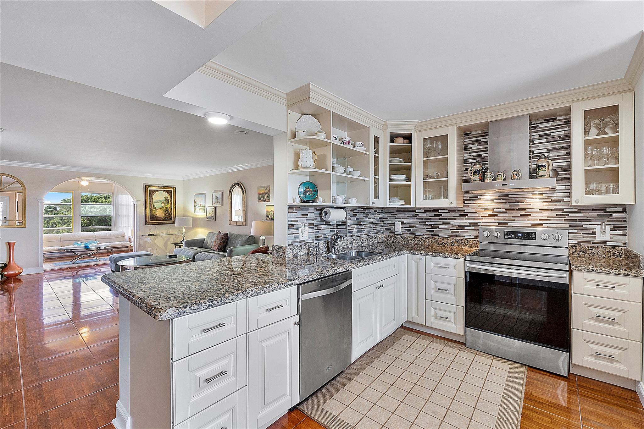 Welcome to a serene 55+ Bonaire Village getaway in Delray Beach! This charming 5th-floor unit offers stunning lake views of the fountain and pond from the enclosed balcony. This turnkey 1-bedroom, 2-bath unit is available fully furnished. Recently renovated, the unit boasts new kitchen cabinets, stainless steel appliances, granite countertops, crown molding throughout, a full-size washer and dryer, a new AC (2023), new electrical panel (2025) and a tankless water heater (2019). The bedroom features a spacious walk-in closet, and direct access to over 7 miles of walking and running trails completes the package! Conveniently located near shopping, dining, the vibrant Delray Beach downtown, beautiful beaches, and more—this property truly has it all!