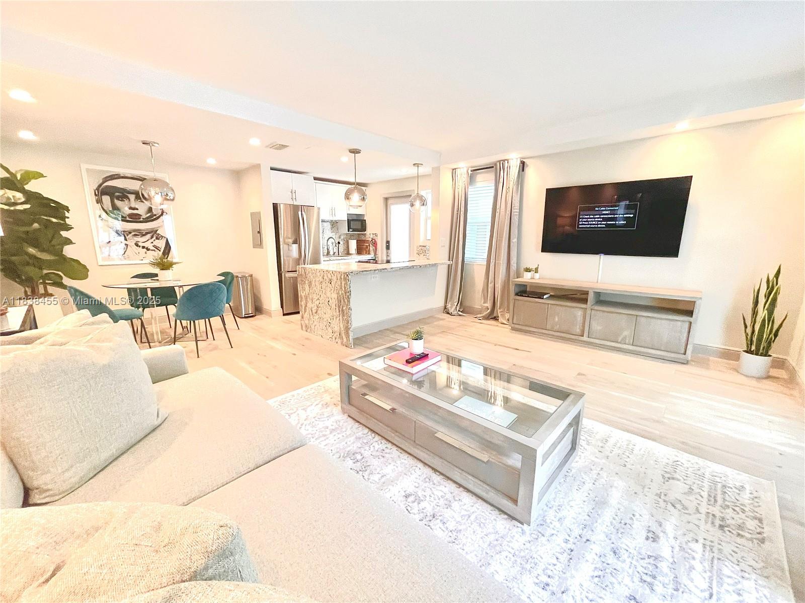 Stylish 780 sq ft Art Deco ground-floor unit with private entrance, giving it a house-like feel. Features a modern open kitchen, spacious balcony with lush greenery, and new flooring that extends outdoors. Recently owner-occupied, it includes new drywall, central A/C, impact windows and doors, and upgraded electrical. Smart home features let you control recessed lighting, thermostat, and locks via phone or voice. Comes with gated parking. Convenient location near markets, dining, dry cleaning, and bike rentals. Rented for $2,850/month. Passed 40-year inspection.