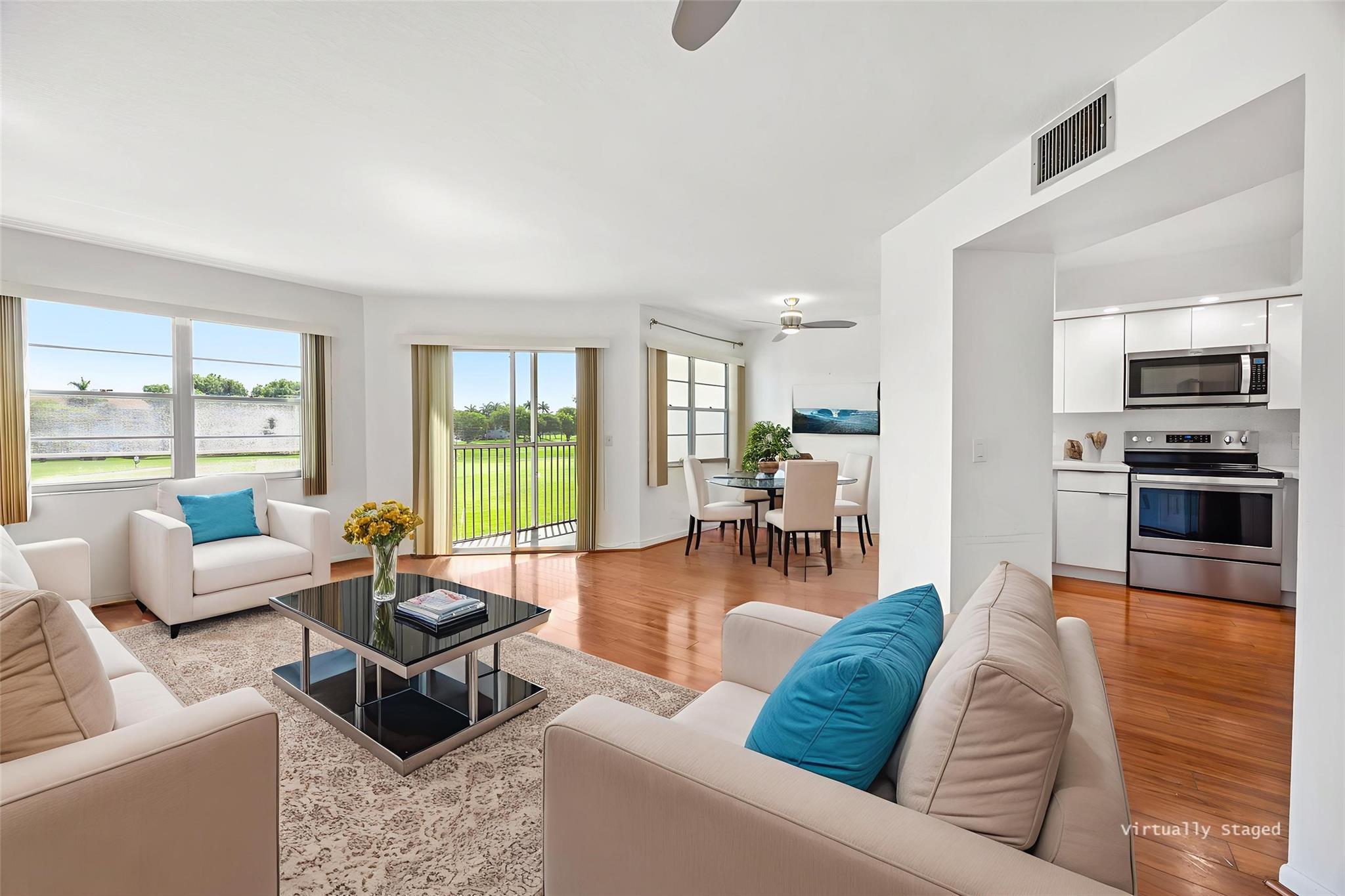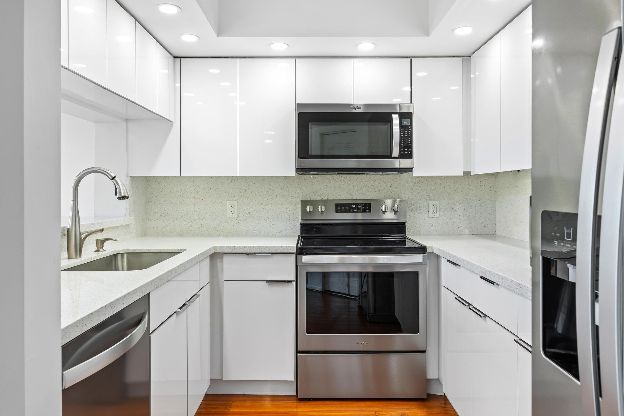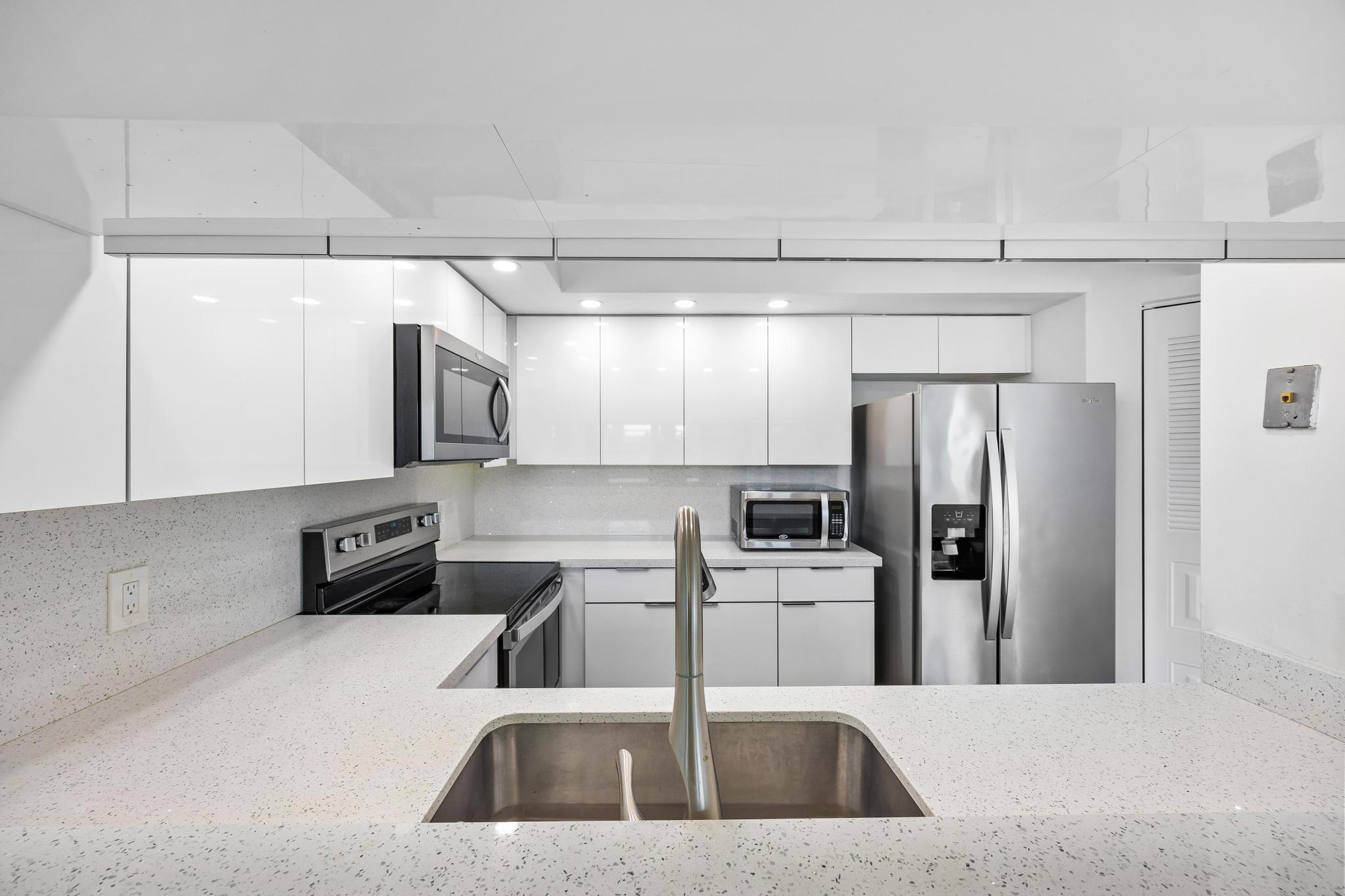 Beautiful and bright condo located in the heart of Pembroke Pines! Walk into this spacious 1 bed 1 bath unit with an amazing view of the golf course and greenery. New kitchen with plenty of cabinet space, stainless steel appliances, quartz countertops, wood floors throughout. Renovated bathroom. Washer and dryer conveniently located inside the unit, assigned parking & plenty of guest parking. Century Village is one of Pembroke Pines most desirable active adult communities, providing incredible resort-style amenities including a state-of-the-art clubhouse, 1000-seat theater with free weekly movies, billiard room, two fitness centers, security gate, 27 pools, 18 tennis courts, and a courtesy bus. Association dues cover water, trash, sewer, cable, internet, clubs. Welcome home!