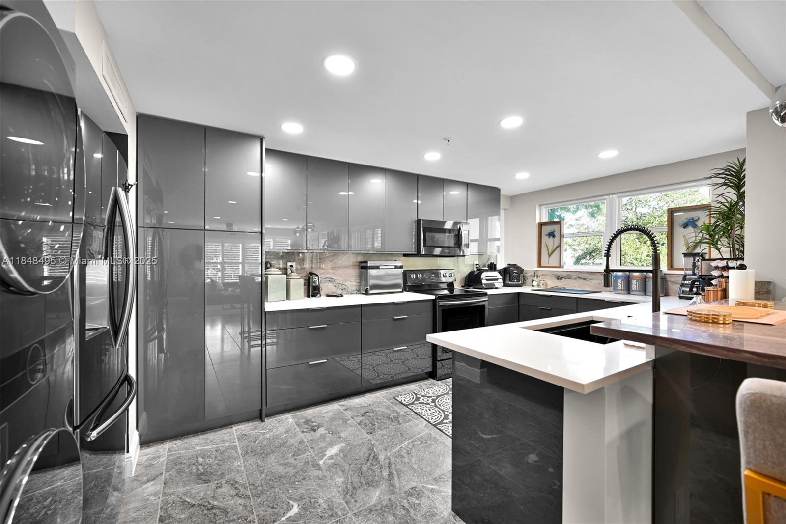 This beautifully remodeled 3-bedroom, 2-bathroom condo offers an exquisite blend of luxury and comfort. The open-concept floor plan creates a seamless flow throughout the home, featuring a stunning waterfall wet bar and a large wine fridge, perfect for both relaxation and entertaining. The kitchen is a true highlight, offering ample cabinetry and a generous space designed for cooking and hosting with ease.Large impact windows, The master bedroom is a serene retreat, complete with spacious his and hers walk-in closets, a dual sink vanity, a luxurious shower with dual showerheads, and a cozy sit-down area. The additional bedrooms are equally impressive, offering ample space and sizable closets.The unit is fully furnished and move-in ready—just bring your suitcase and settle in!