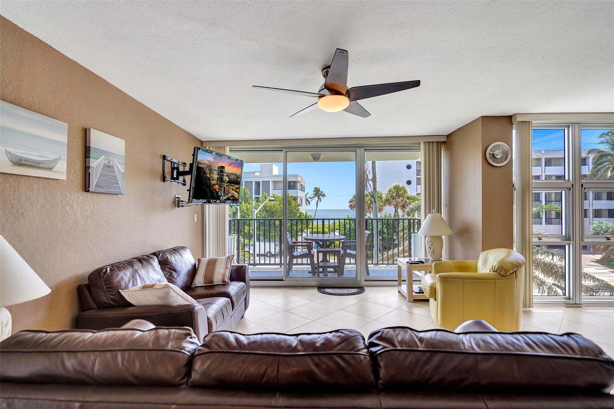 Direct ocean view from your bedroom and living area! North/ East facing. Corner end unit with lots of natural light! Enjoy this updated, fully furnished unit with impact windows and doors and nice open floor plan. Whether you're looking for a second home or primary resident this is your spot. Across the street from the beach, walking distance to all the great restaurants and fishing pier. Garage parking with one deeded parking space. The building has a gym, 2 pools, outdoor BBQ, bocce ball, tennis courts, pickleball, sauna, library, 24/7 security. Plenty of closet space an additional storage unit in the building. Rentals are ok but must hold for 1 year, 3-month min. Laundry facility is on each floor.