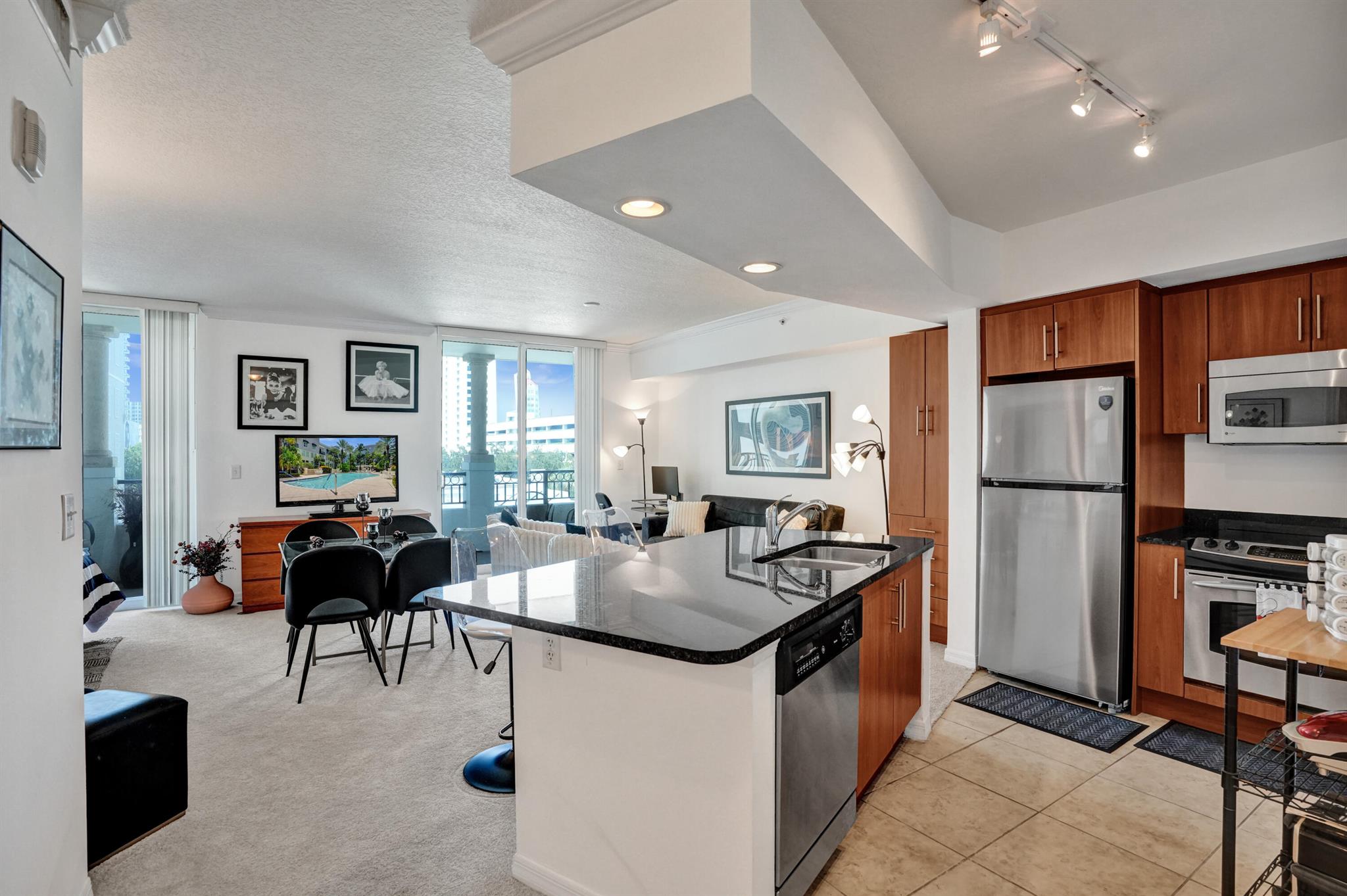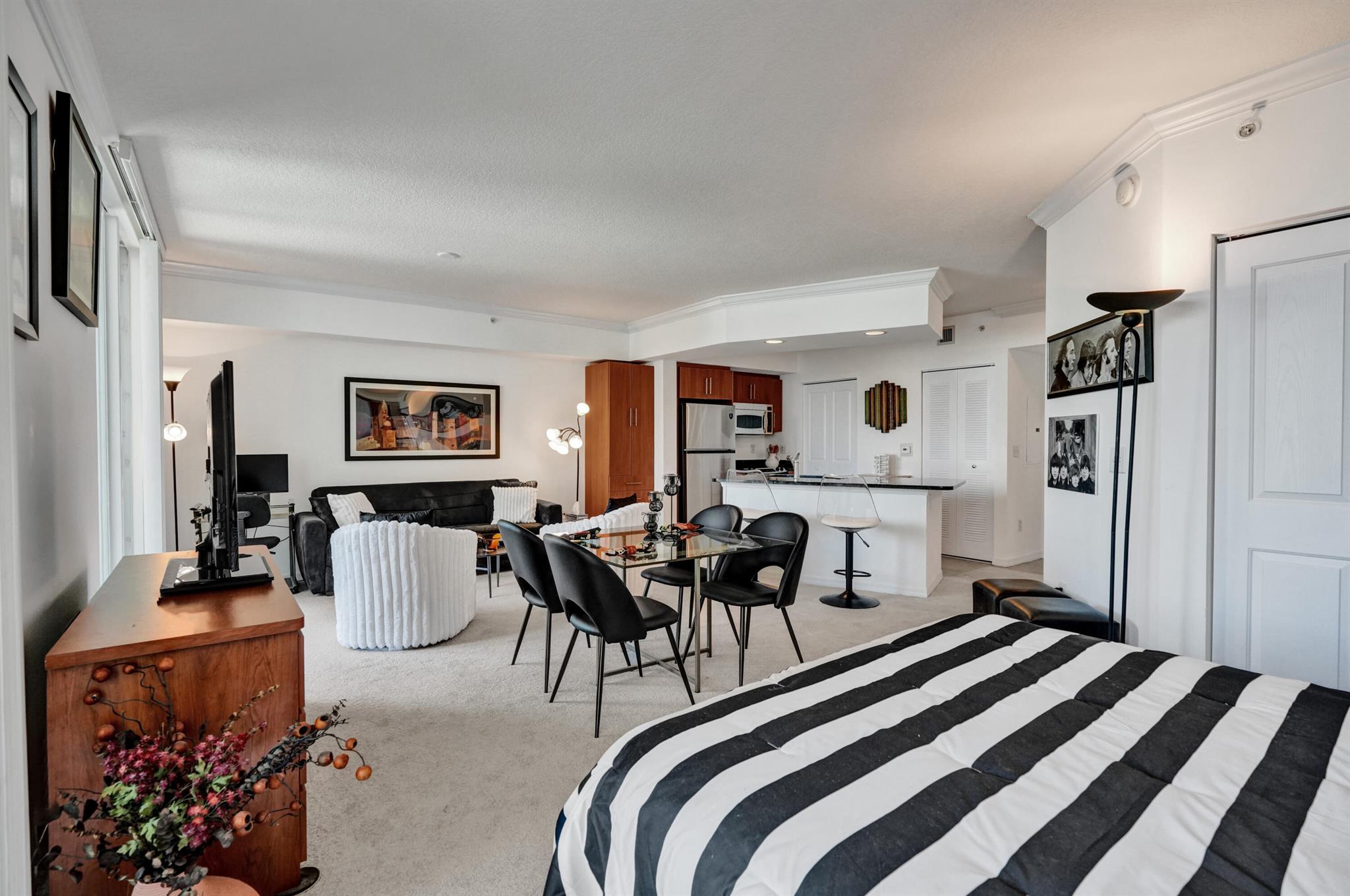 One of a kind Turnkey Fully furnished and move-in ready gem with low maintenance fees. This spacious studio at The Prado offers stylish upscale living in the heart of downtown. Unique rare 25-foot private terrace, ideal for outdoor dining or entertaining . A built-in queen Murphy bed maximizes your living space. A Dining area for more formal meals. The kitchen has stainless steel appliances, a granite island including additional Lucite seating. Separate utility room for washer & dryer. Parking is located on the same floor close to the unit for easy access. The Prado offers resort-style amenities including a courtyard pool & spa, fitness center, and a clubhouse. Located just a short distance from Palm Beach, CityPlace, Clematis Street, Palm Beach Atlantic University, and Brightline.