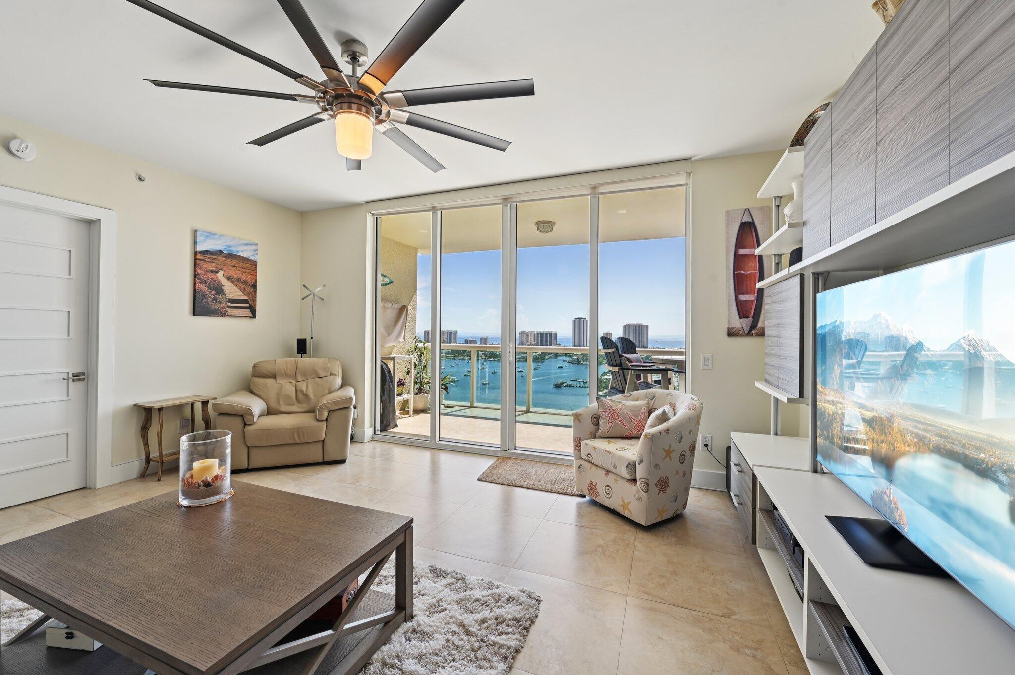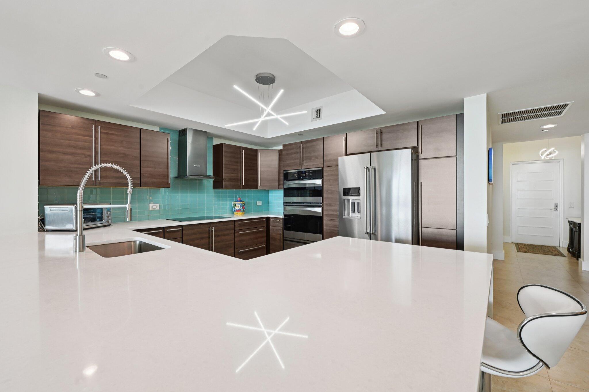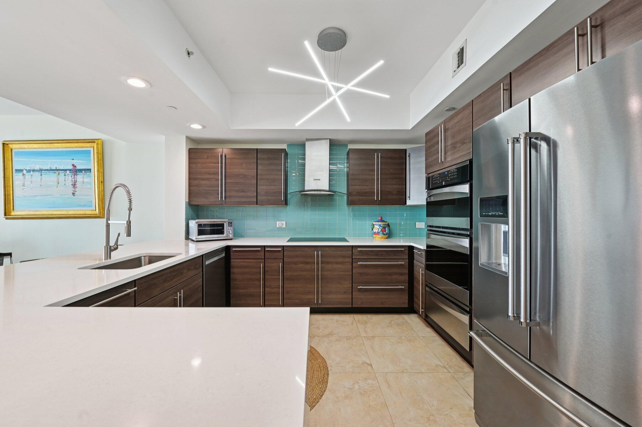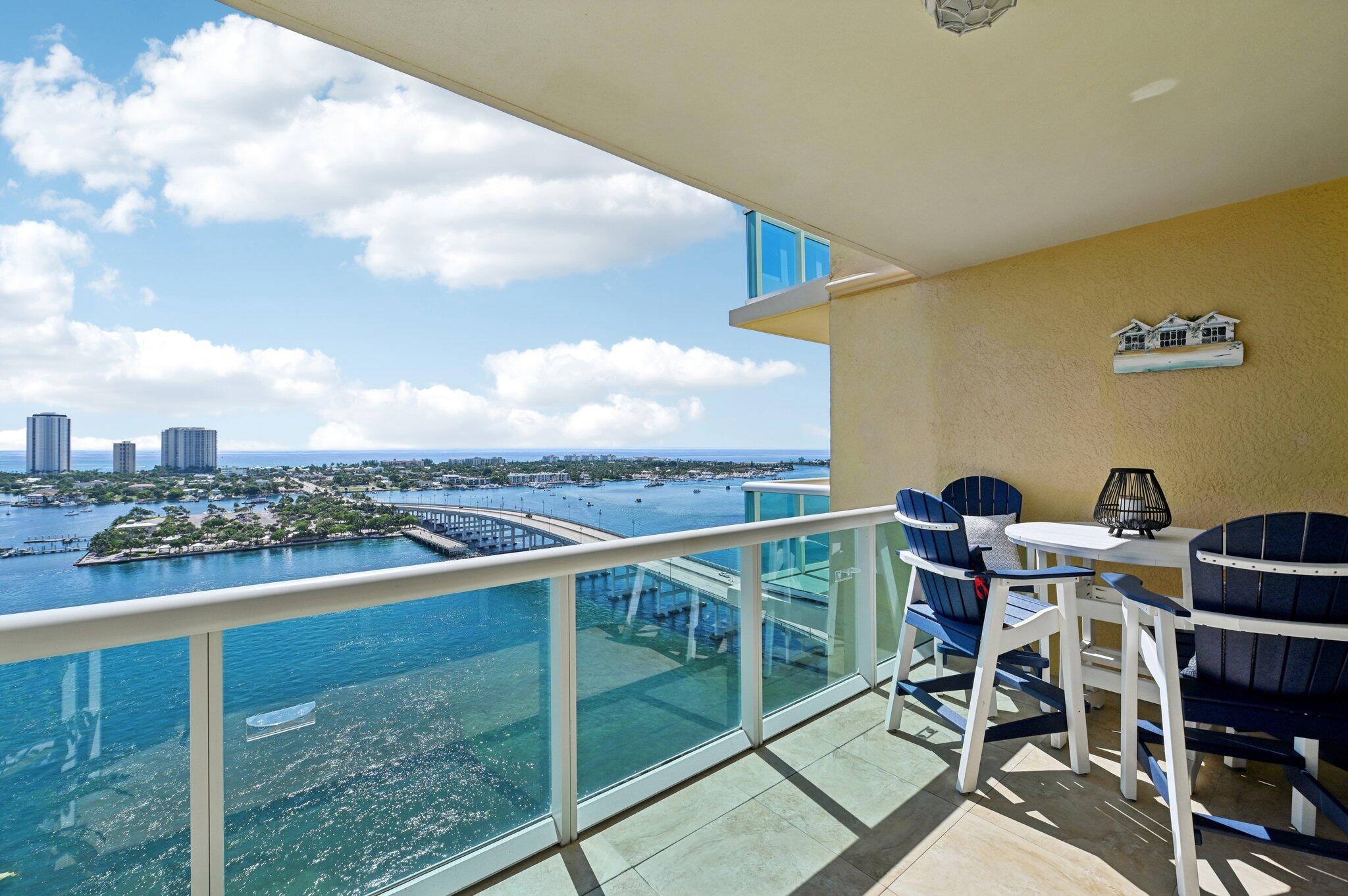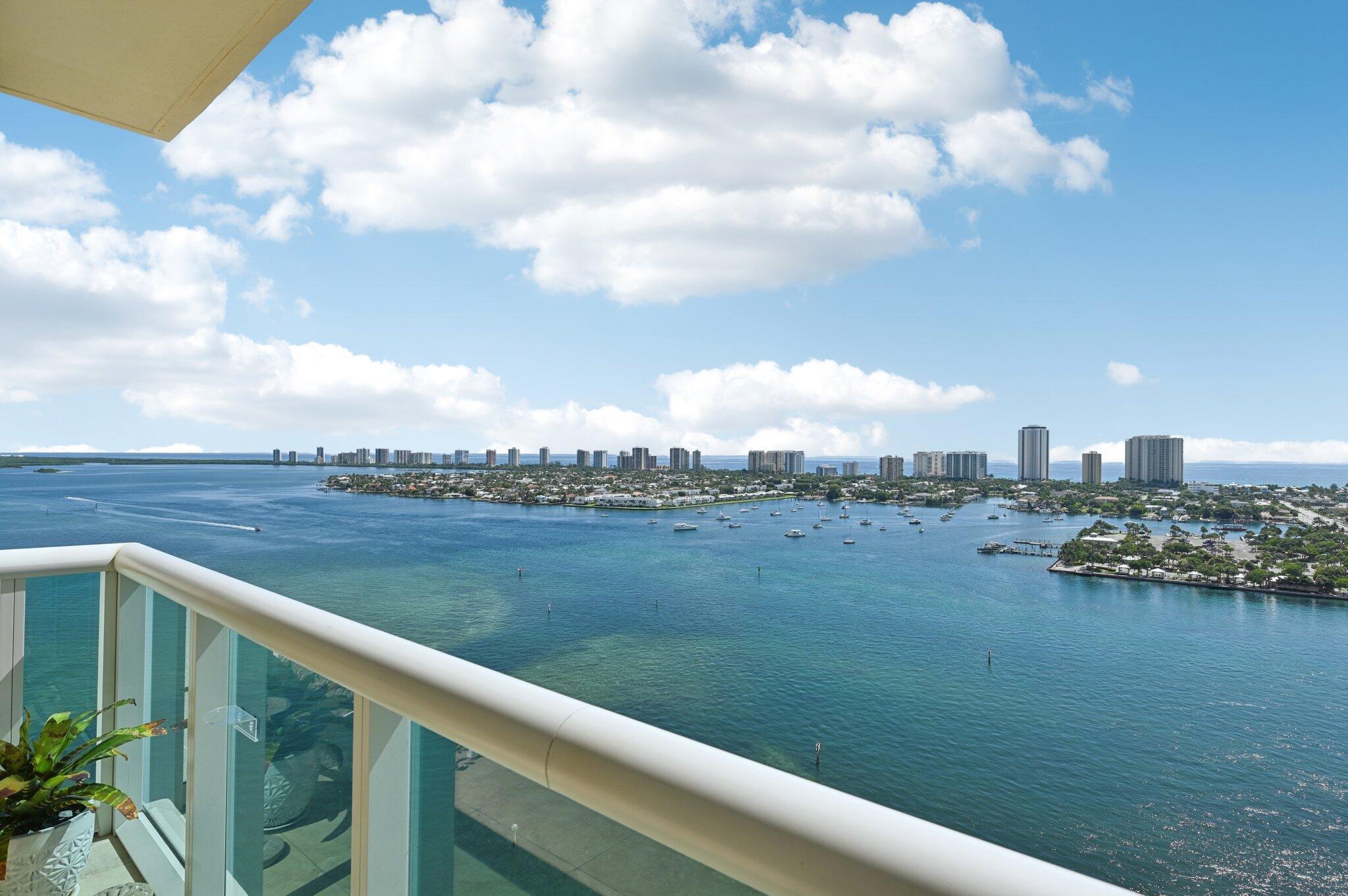 Gorgeous direct, unobstructed views of the Intracoastal Waterway and Atlantic Ocean from this preferred Ocean Tower, 23rd-floor residence at Marina Grande. Enjoy breathtaking sunrises and refreshing ocean breezes from your spacious balcony, living room, and owner's suite. Desirable split floor plan features 2 bedrooms plus a large den--ideal for a home office or 3rd bedroom. The chef's dream kitchen boasts seating for six at the countertop bar, new custom cabinetry, white quartz countertops, a turquoise glass backsplash, and premium Kenmore & KitchenAid stainless steel appliances, including induction cooktop, warming drawer, and convection oven. The owner's suite is a relaxing retreat with dual white custom vanities, a walk-in shower with frameless glass doors, a separate water closet, and