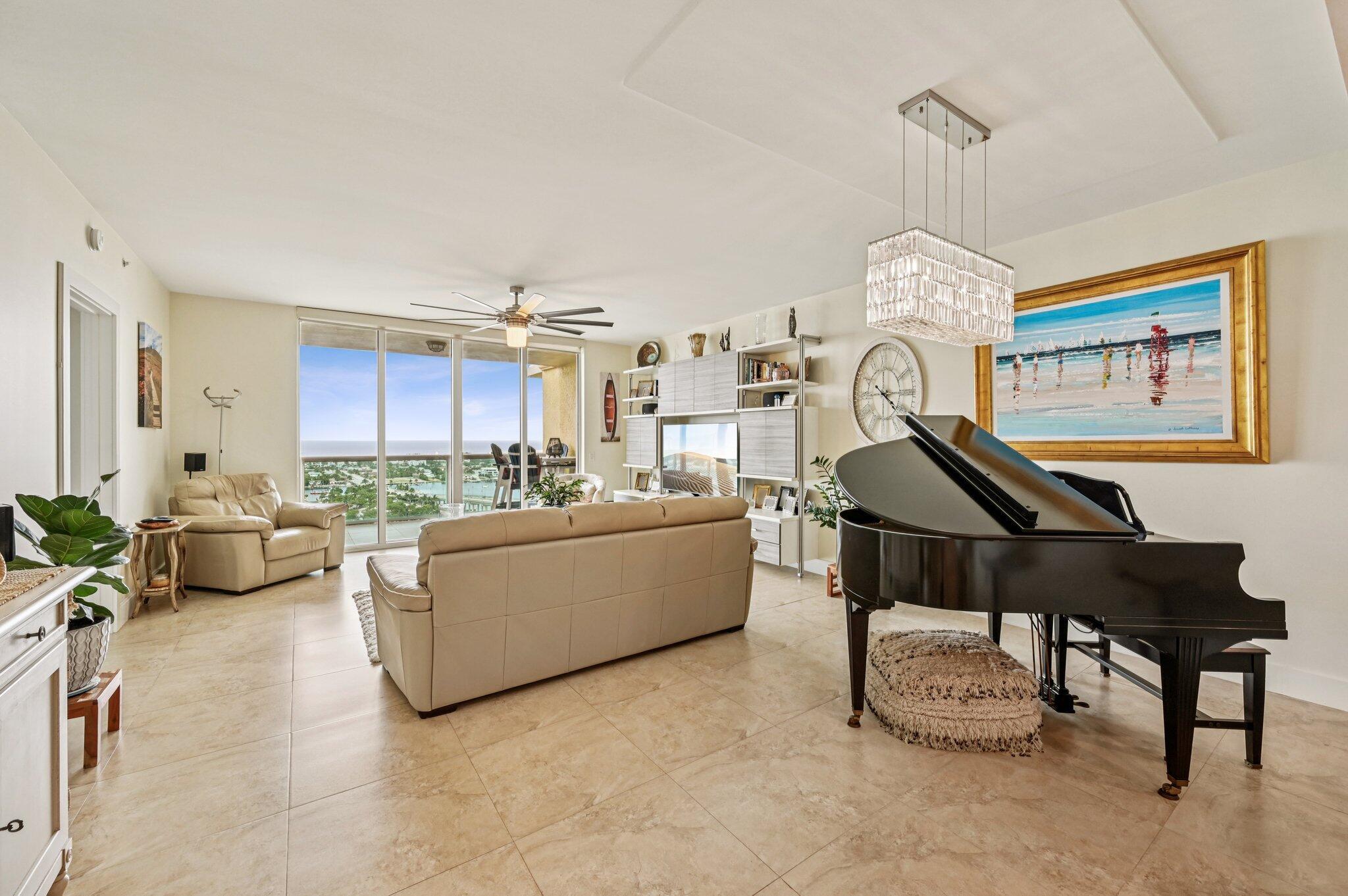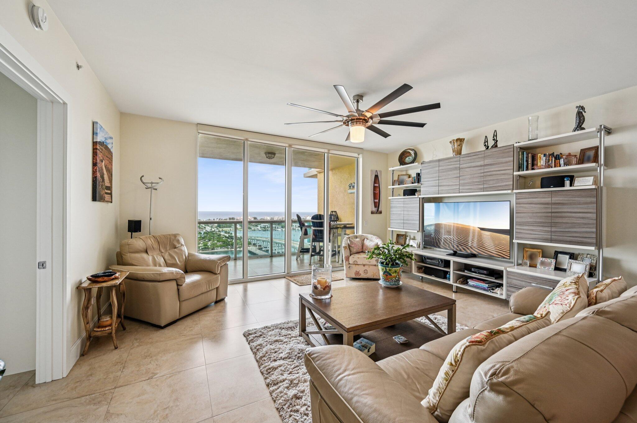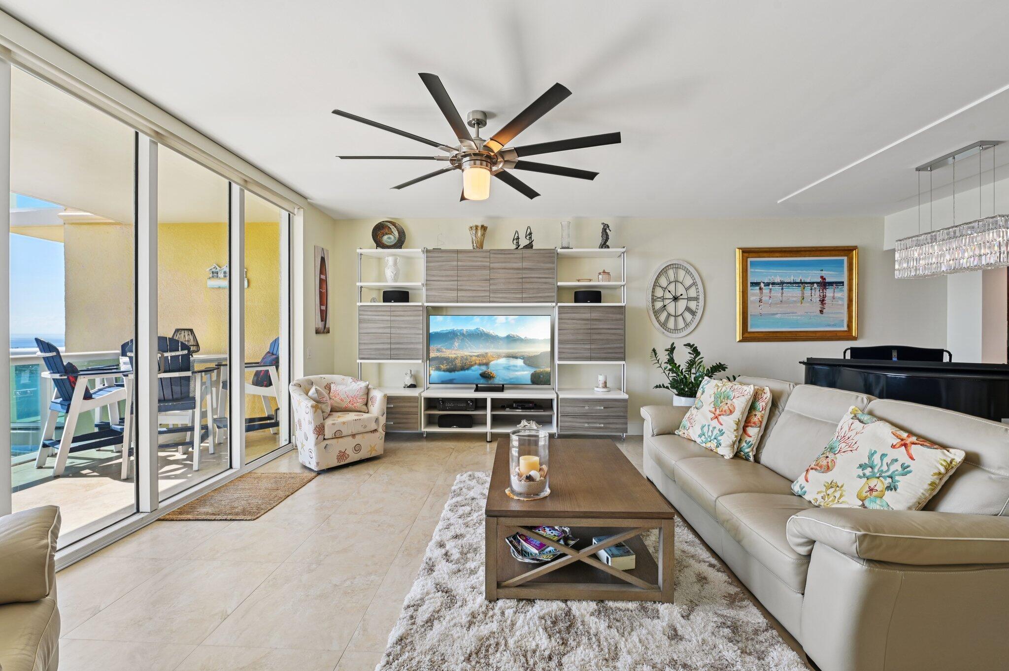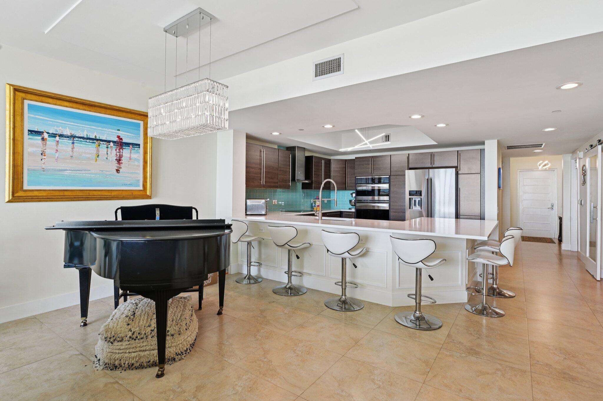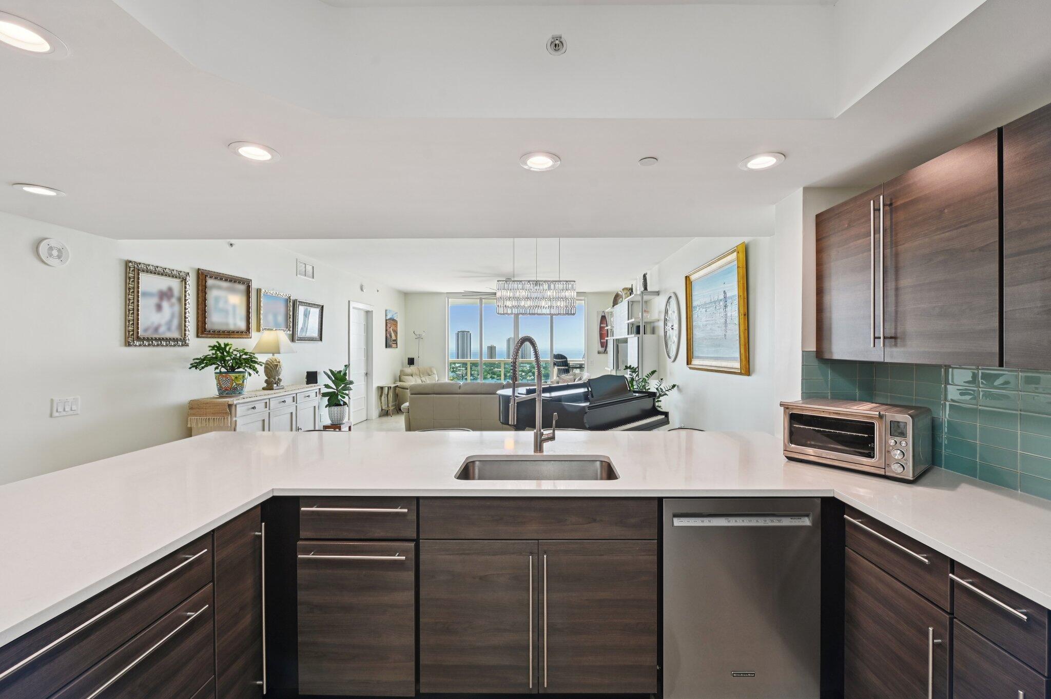 Gorgeous direct, unobstructed views of the Intracoastal Waterway and Atlantic Ocean from this preferred Ocean Tower, 23rd-floor residence at Marina Grande. Enjoy breathtaking sunrises and refreshing ocean breezes from your spacious balcony, living room, and owner's suite. Desirable split floor plan features 2 bedrooms plus a large den--ideal for a home office or 3rd bedroom. The chef's dream kitchen boasts seating for six at the countertop bar, new custom cabinetry, white quartz countertops, a turquoise glass backsplash, and premium Kenmore & KitchenAid stainless steel appliances, including induction cooktop, warming drawer, and convection oven. The owner's suite is a relaxing retreat with dual white custom vanities, a walk-in shower with frameless glass doors, a separate water closet, and