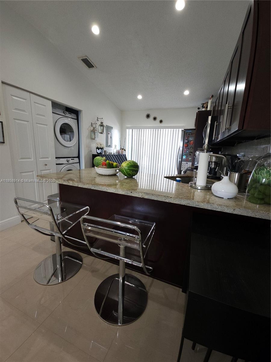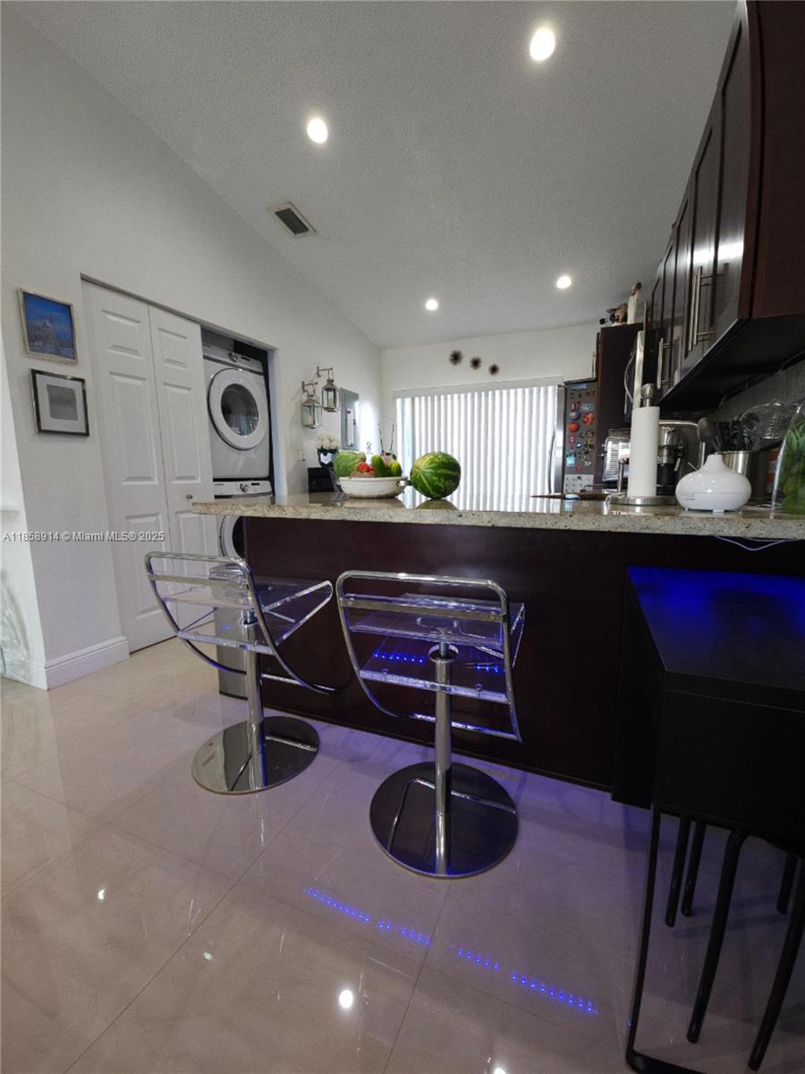 2/2 Nicely updated unit with bright natural light. Decorated with neutral tone colors, porcelain tile throughout home and tile flooring in bathrooms. Split bedroom layout. Primary bedroom (11 x 16) with bath and nice size walk-in closet. Second bedroom (11 x 10) with wall-to-wall closet. Nice size living/dining room space (19 X 12). L-shape kitchen design (19 x 12) with pantry and washer/dryer hook up, sliding glass door and balcony. *Washer and dryer not included with sale. No special assessments at this time. Accordion shutters on all windows. 2 parking spaces!!! Contact agent for additional information.
