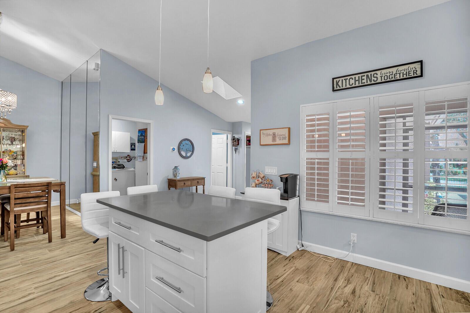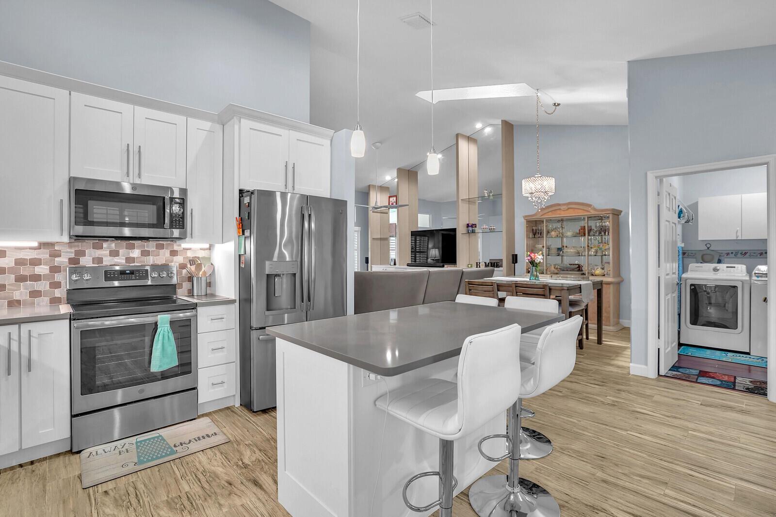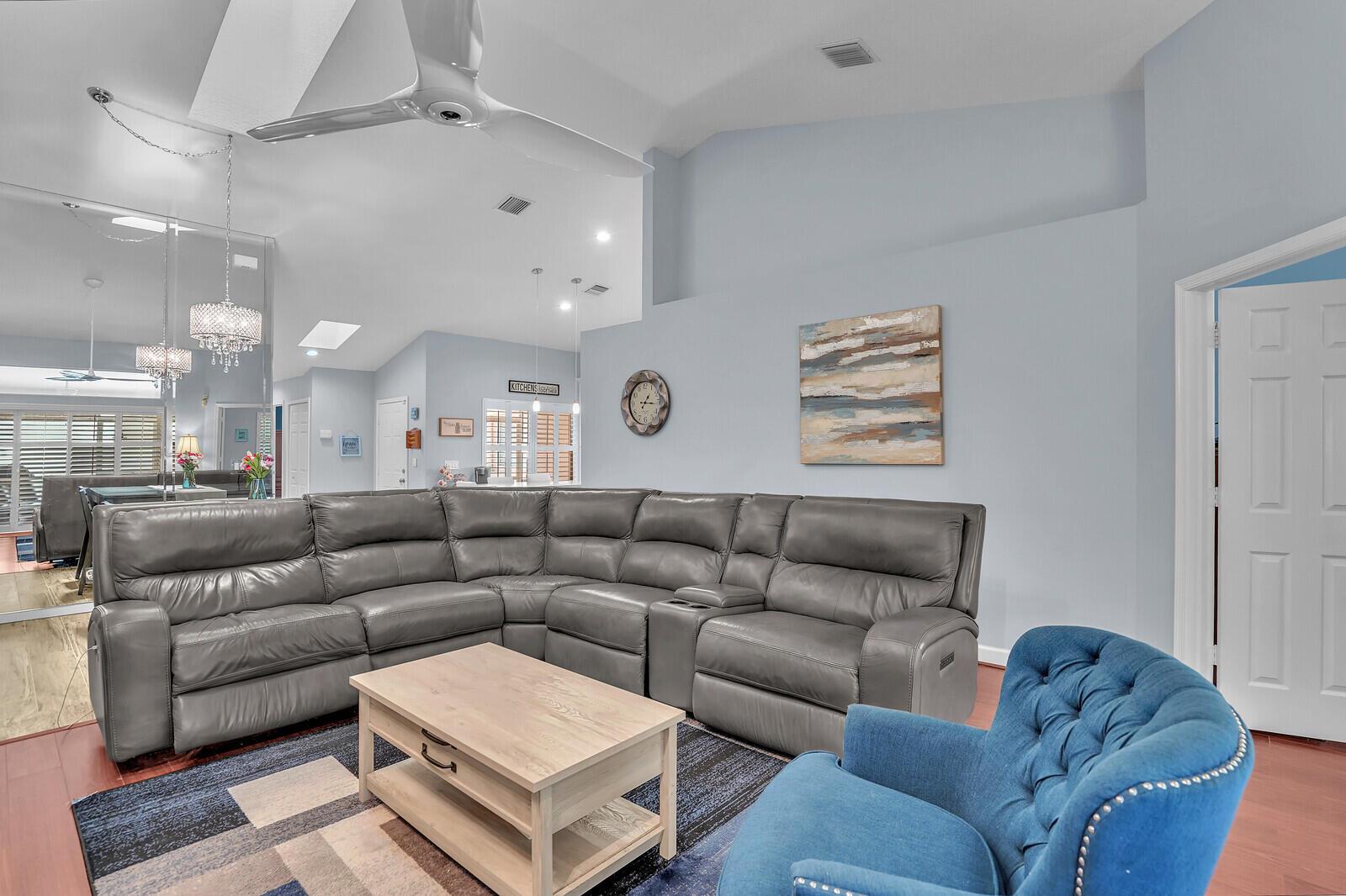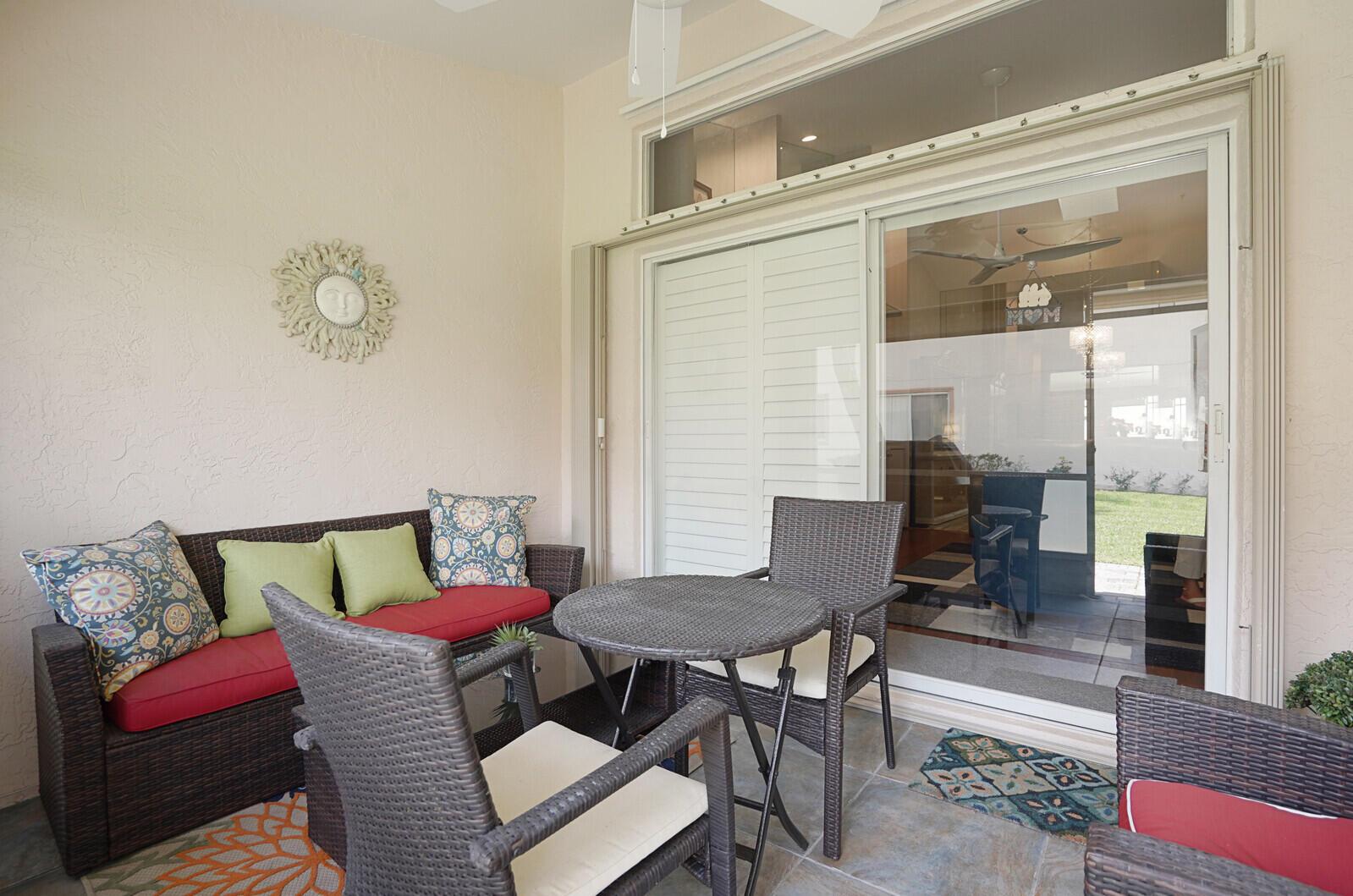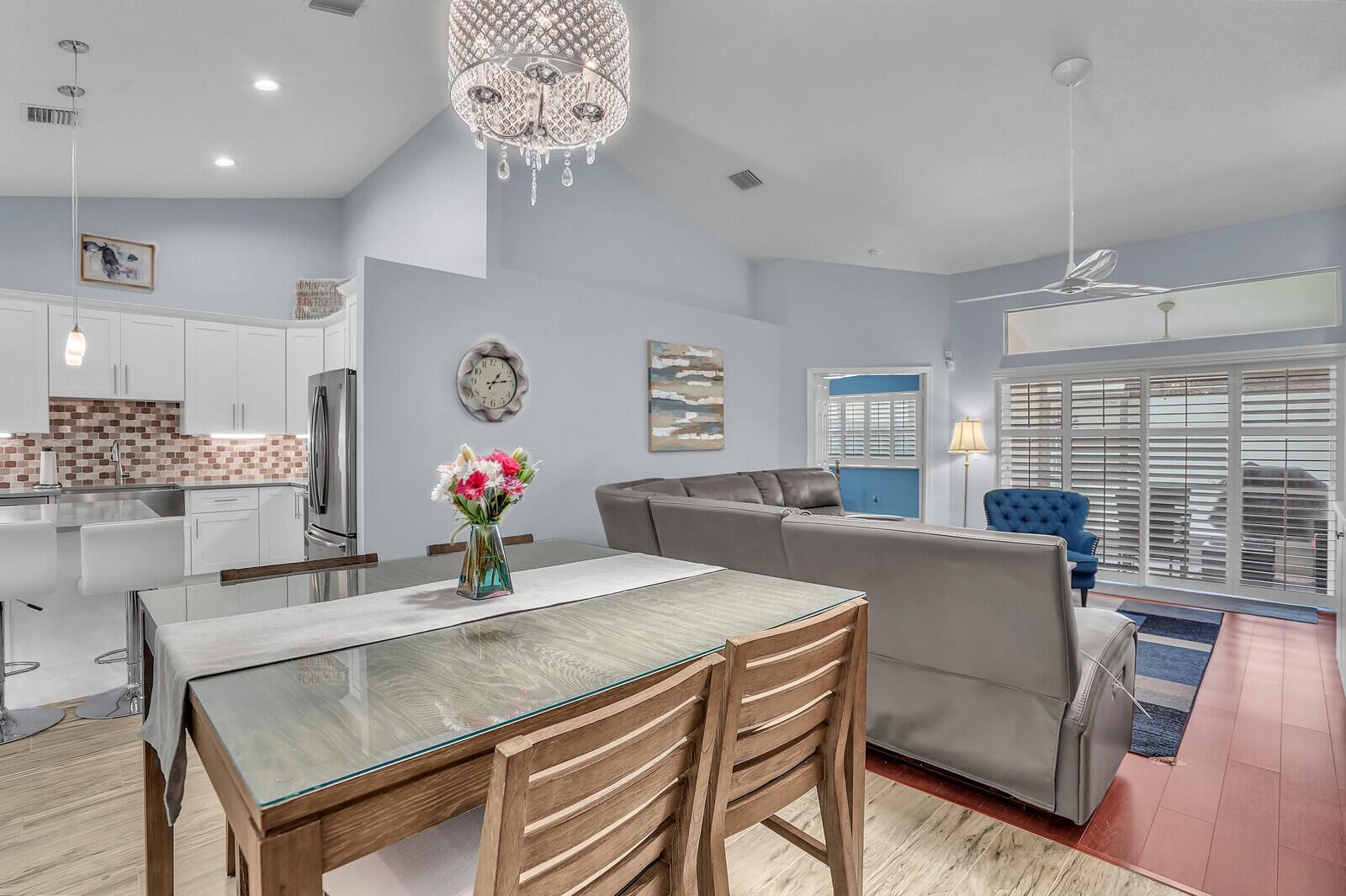 Brand new AC intsalled 09/11/25, Turn-key 3-bed, 2-bath home in Lantern Walk with garage and soaring ceilings. Updated kitchen features soft-close cabinets, farmhouse sink, backsplash, and stainless steel appliances with wood/tile flooring flows throughout. Custom closets in bedrooms . Accordion shutters, tile patios, screened front & back porches, and new pavers for grilling -- unique in community. New gutters & painted fascia (2024),plantation window treatments throughout home, epoxy garage floor, and 10-year roof maintained by HOA. Laundry with washer, dryer, and utility tub. Ceiling fans in living room & bedrooms do not convey; seller will replace or credit. Walk to clubhouse; close to shops and dining. Ready for any buyer!