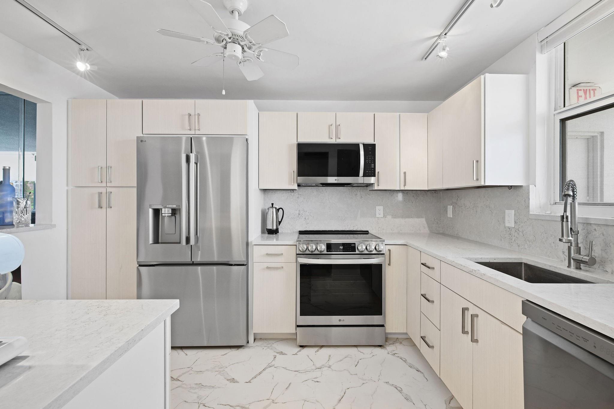 Views from every window! Large SW corner penthouse condo located steps away from the Commercial Blvd bridge entrance into LAUDERDALE BY THE SEA. New kitchen, floor to ceiling impact windows, and recent bathroom updates. Only one neighboring condo next door is divided by a solid concrete block wall, providing excellent sound insulation from next door. No neighbor above! Garage parking and ample guest parking. Common area, no fixed bridge/ deepwater dockage is available. Small pets are welcome. Building went through extensive concrete restoration and the roof was replaced in 2025. Great walkability to many restaurants, services and to the beach. Amazing sunsets and downtown views to the southwest and views to the ocean above 3 story height restricted, LAUDERDALE BY THE SEA, to the east.
