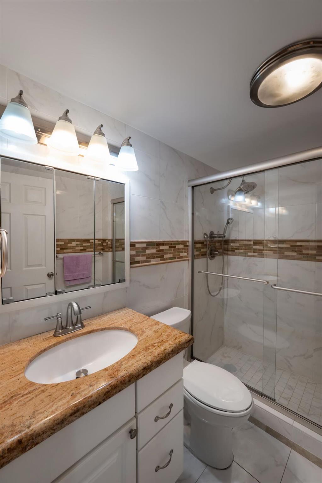 Welcome to resort style living with this Beautiful turnkey 2BR/2BA condo in Grantham E, a friendly 55+ community in Century Village. The kitchen boasts granite counters, tile backsplash, and stainless appliances that flow into the dining and living areas. Both bathrooms feature granite vanities and step-in showers.(water incl) Spacious bedrooms offer great storage, and the enclosed Florida room featuring a custom california closet for added storage space overlooks peaceful gardens. Tile flooring throughout, impact front door, and roll-down shutters add convenience and peace of mind. Steps from the elevator, laundry, and storage. Century Village provides 24-hour security plus pools, clubhouse, theater, fitness center, tennis, pickleball, and more--minutes from shopping, dining, & the beach!