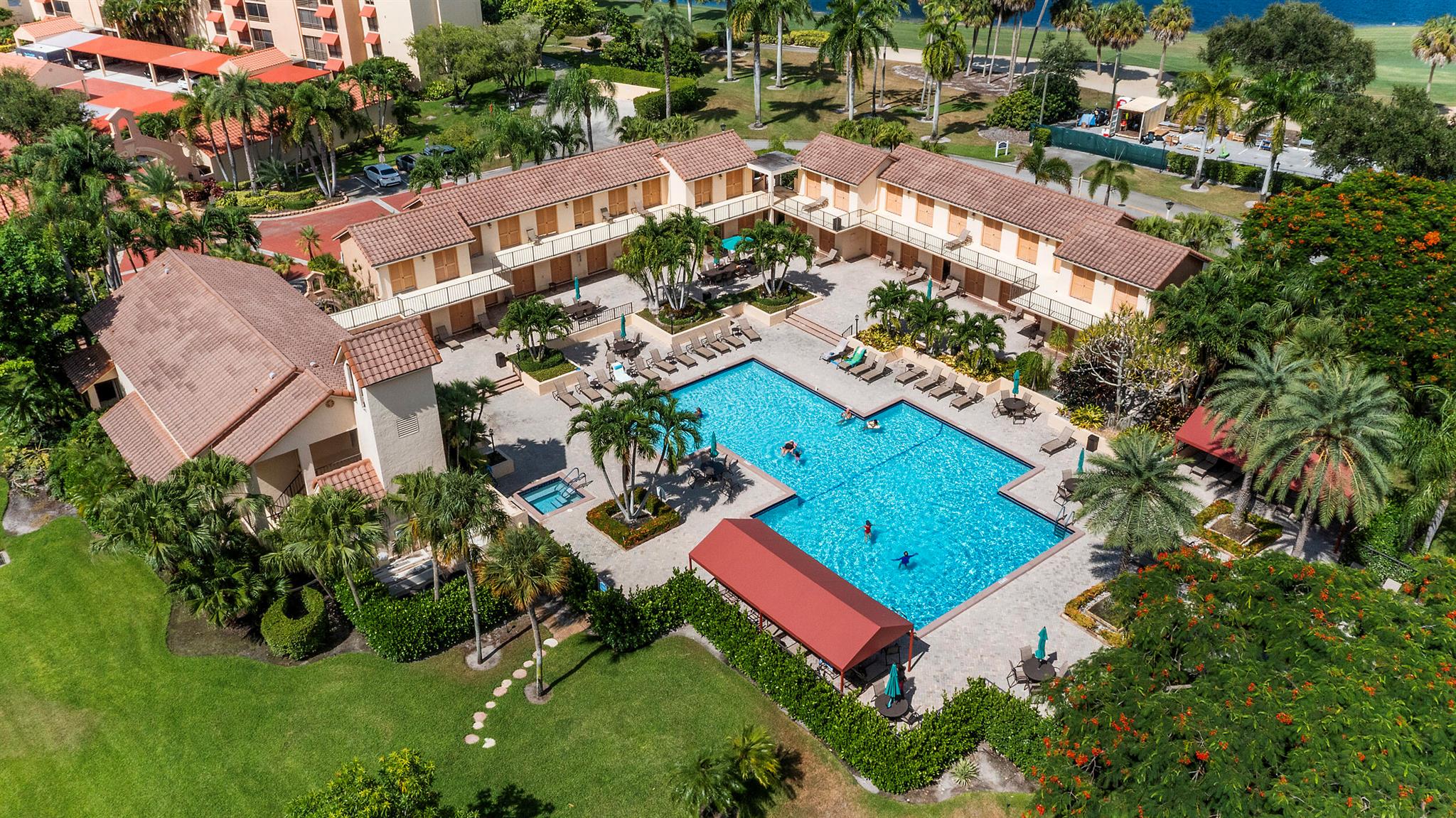 Spacious 3BR/2.5BA condo in the Promenade with the community's largest floor plan! Enjoy tropical garden views from the oversized enclosed terrace, just steps from the clubhouse and pool. Features include wood & laminate floors, smooth ceilings, and a versatile den/3rd bedroom with Murphy bed. The eat-in kitchen offers granite counters, wood cabinetry, stainless steel appliances, walk-in pantry, and pull-out drawers. Primary suite has 2 walk-in closets and an updated bath with dual sinks, vanity, soaking tub & separate shower. Upgrades include newer appliances, 2 ACs, brand-new water heater, updated baths, and laundry with utility sink. Two assigned parking spaces, extra storage, and recent building updates complete this must-see home!