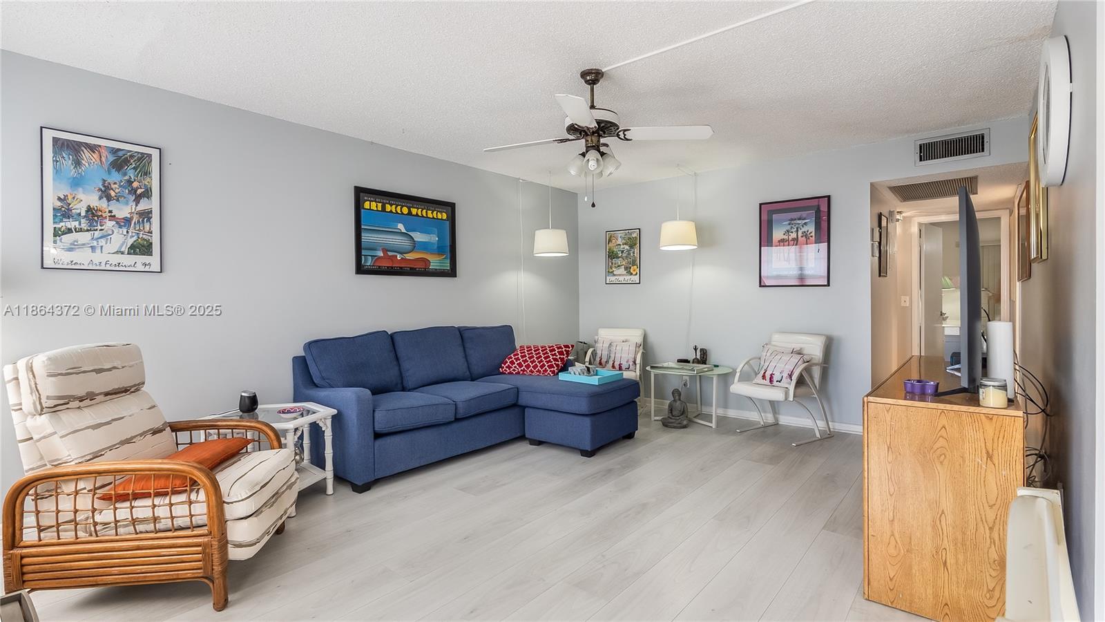 Welcome to your 55+ paradise! This stunning, turnkey first-floor condo in Century Village East is fully furnished and ready for you. Featuring 2 bedrooms and 1.5 baths, this bright and airy unit boasts sleek luxury vinyl floors throughout. The true gem is the enclosed porch, transformed into a tranquil sunroom overlooking lush green space—perfect for relaxing. Enjoy resort-style living with world-class amenities including 16 heated pools, a 1,600-seat theater, a massive clubhouse, fitness center, tennis courts, and a courtesy bus. This is one of the rare buildings that allows rentals after one year, making it a fantastic investment. Just 3 miles from the beach, this is your chance for the ultimate South Florida lifestyle. ***HOA FEES - Assoc Fee $172/mo Maint $418/mo Rec $110/mo