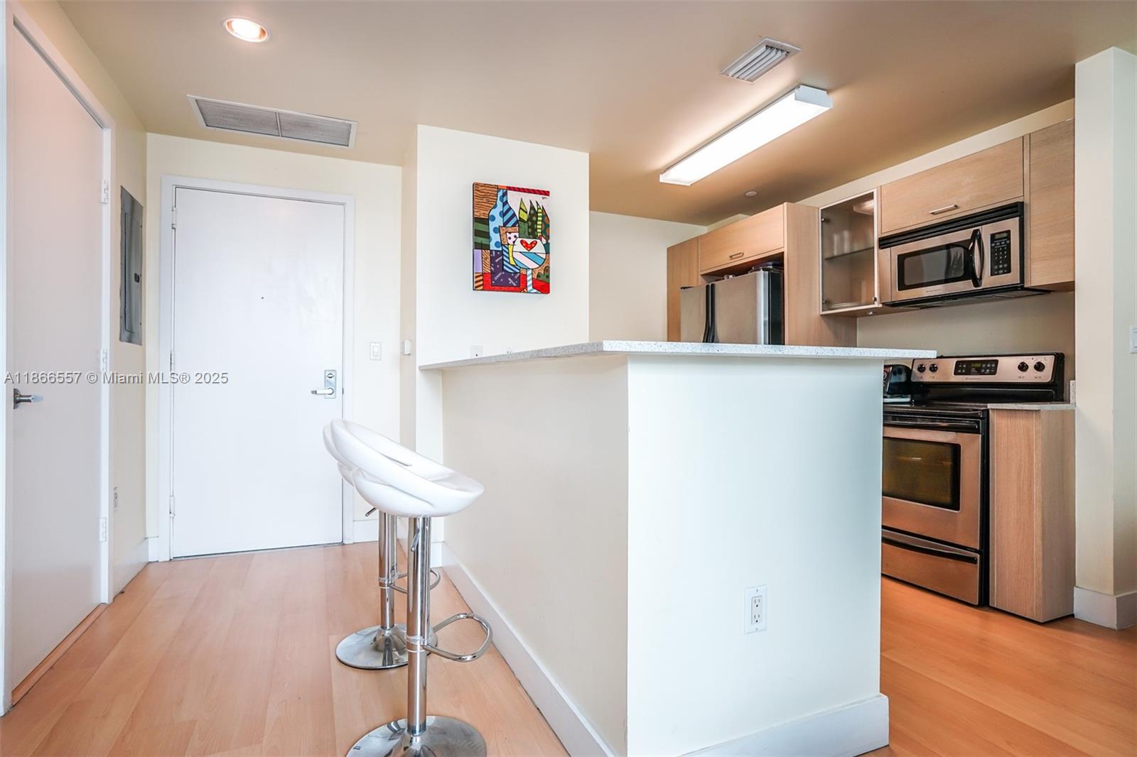 Panoramic views from this wonderfully kept apartment in a small young building in Edgewater! Step out to the oversized balcony overlooking the pool, courtyard, and Bay. Faux wood (tile) floors, recently installed black out shades, new washer/dryer in unit, high ceilings. 24 hour lobby attendant, gymnasium, dry sauna, jacuzzi, billiard and activity room. Close to restaurants, public transportation, minutes to Downtown, Design District, Mid town, Wynnwood, and Beaches. Investor and Pet friendly