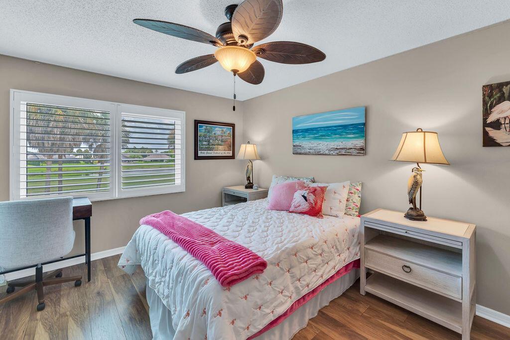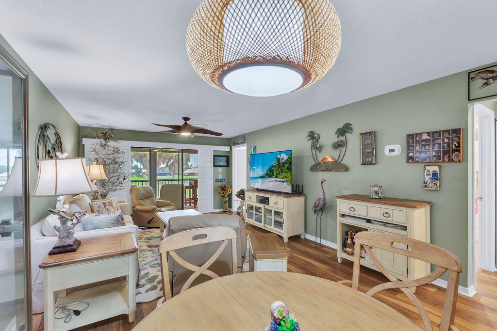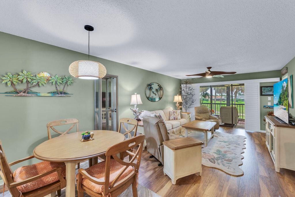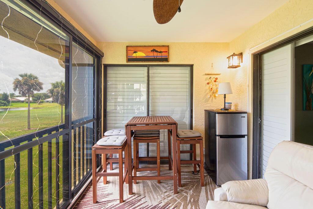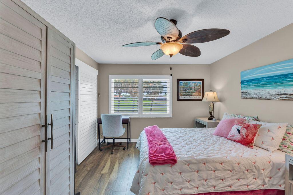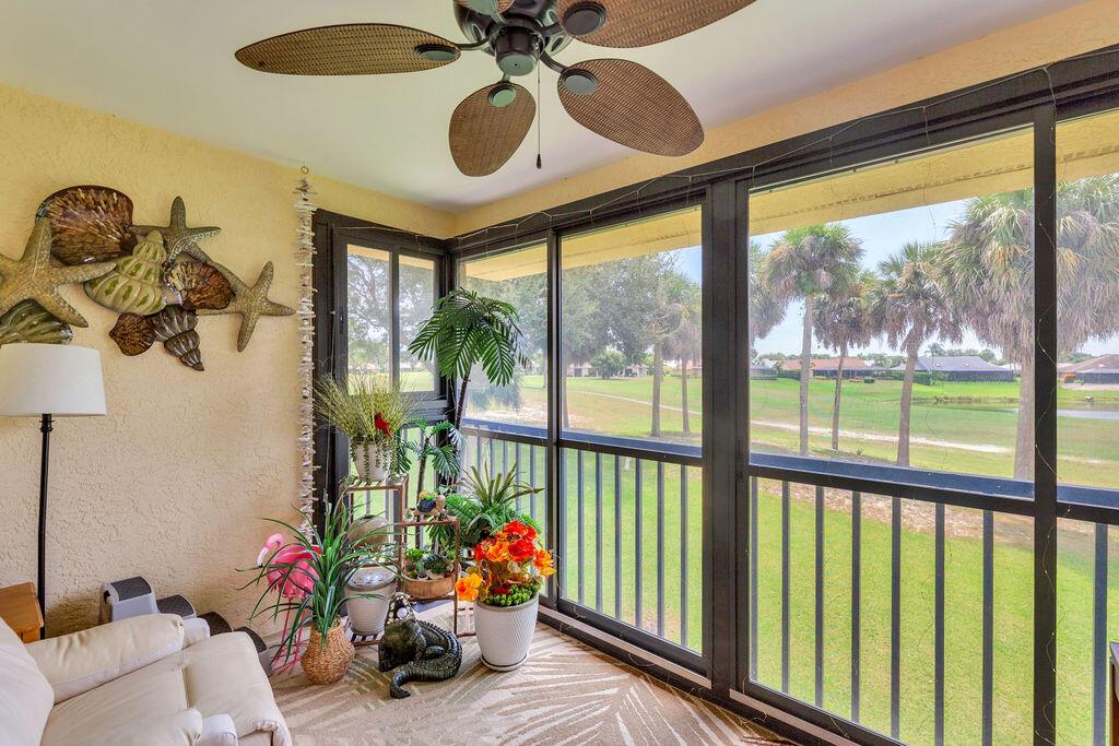 This beautifully updated 2-bedroom, 2-bath condo offers modern style and comfort with a prime location on the 5th hole of a lush, well-maintained golf course. Enjoy sweeping fairway and lake views right from your private balcony or living room. Step inside to find an open, light-filled floor plan, upgraded kitchen with stainless steel appliances, granite countertops, and sleek cabinetry. Both bedrooms are generously sized, with the primary suite featuring an en-suite bath and custom California walk-in closets. The home is enhanced with impact windows for peace of mind and plantation shutters for timeless elegance. Enjoy the tennis and Pickleball courts along with the clubhouse for social events and BBQ's.